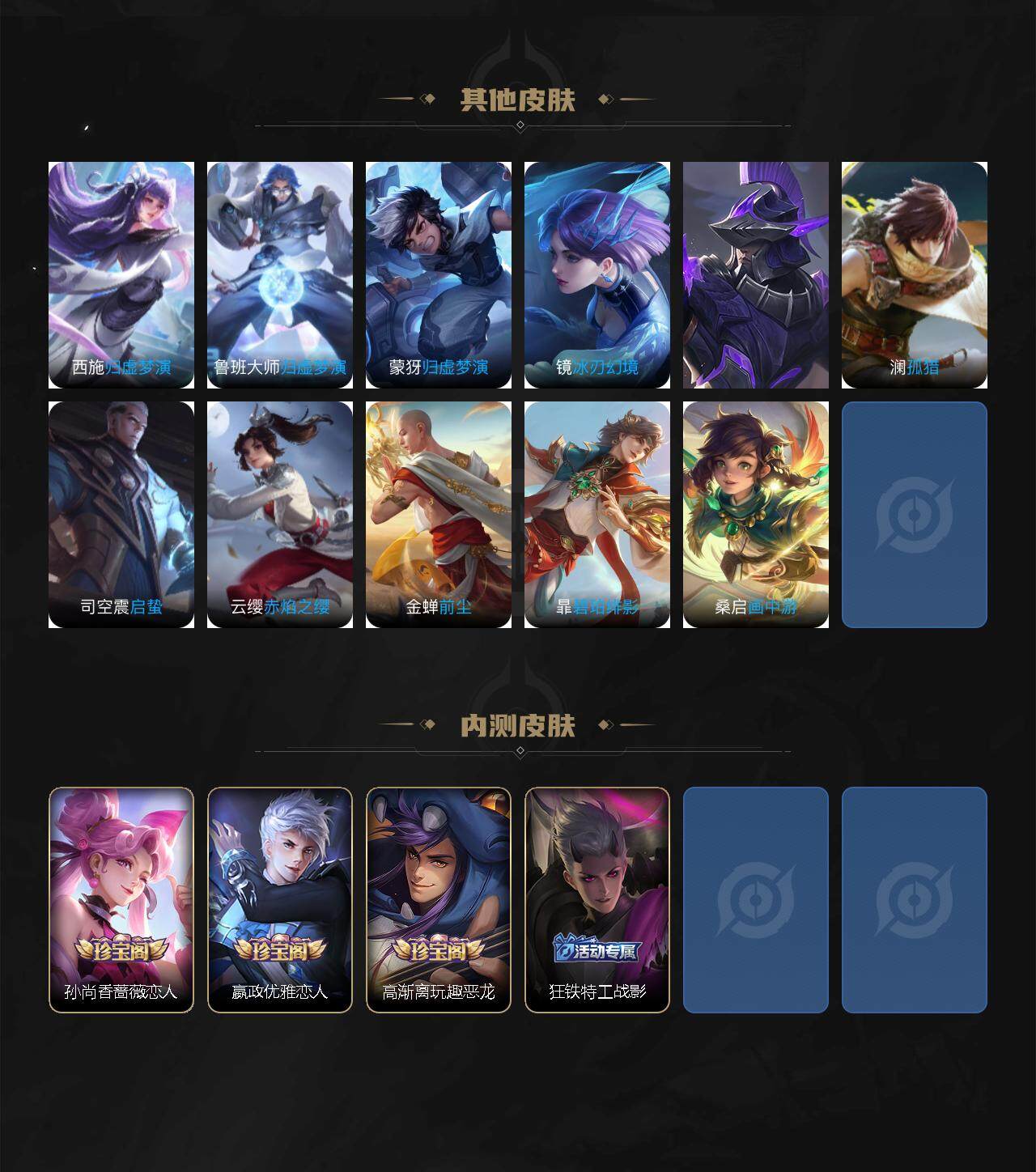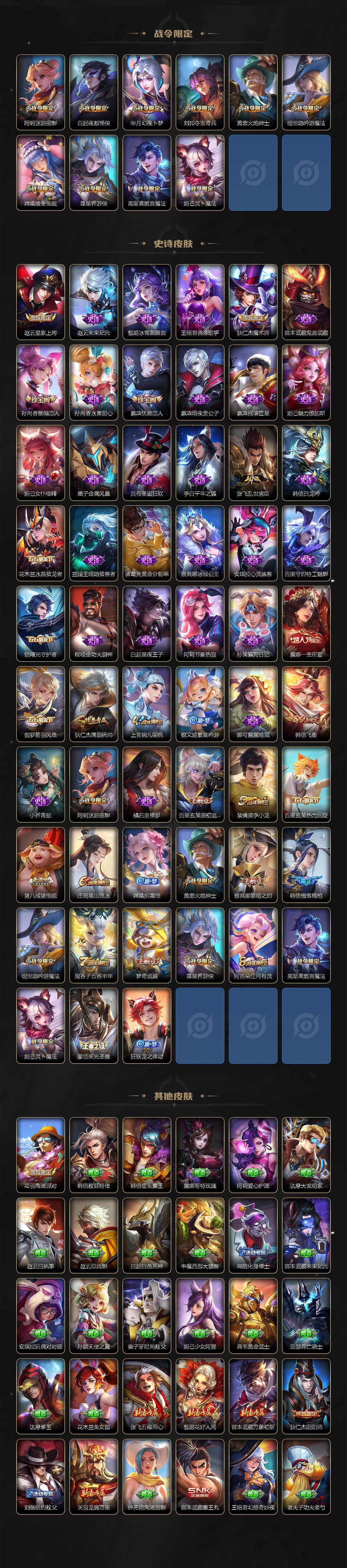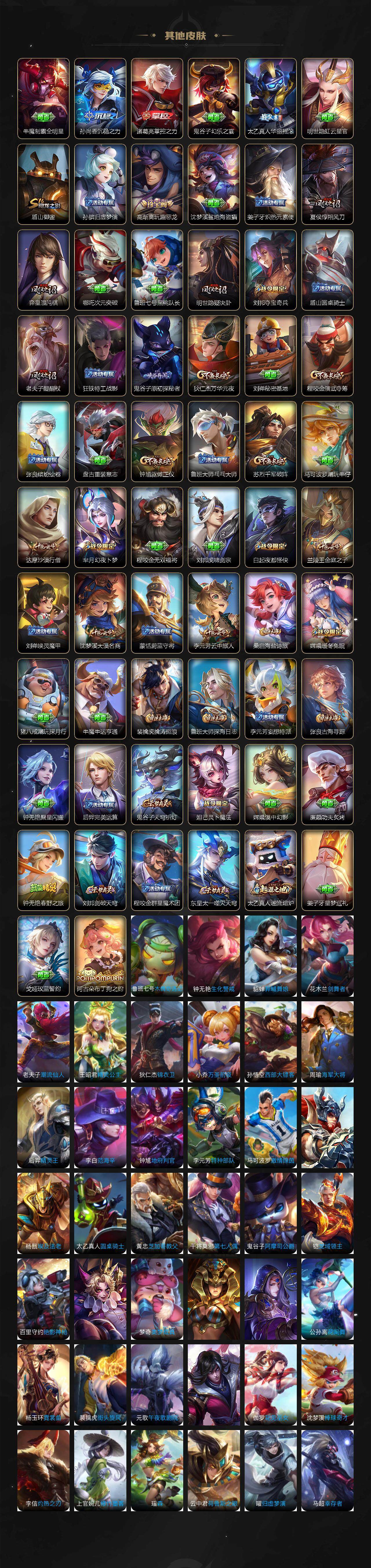 【限定皮肤】:狄仁杰阴阳师,赵云皇家上将,嬴政优雅恋人,孙尚香蔷薇恋人,庄周高山流水,高渐离玩趣恶龙,阿轲迷踪丽影,白起夜都怪侠,芈月幻夜卜梦,夏侯惇朔风刀,狄仁杰魔术师,狄仁杰万华元夜,达摩沙漠行僧,项羽海滩派对,老夫子醍醐杖,程咬金演武夺筹,露娜一生所爱,刘邦夺宝奇兵,韩信飞衡,韩信傲雪梅枪,兰陵王金庭之子,孙悟空齐天大圣,李元芳云中旅人,钟馗驱傩正仪,雅典娜黎明之约,蔡文姬繁星吟游,太乙真人华丽摇滚,鬼谷子原初探秘者,鬼谷子五谷丰年,诸葛亮时雨天司,黄忠火炮绅士,苏烈千军破阵,百里玄策原初追逐者,弈星混沌棋,梦奇顽趣,沈梦溪大漠名商,明世隐疑决卦,明世隐吟游魔法,裴擒虎李小龙,裴擒虎擒涛扼浪,盾山御銮,猪八戒猪悟能,上官婉儿梁祝,嫦娥拒霜思,嫦娥暖冬兔眠,鲁班大师探海日志,桑启海盐诗旅,暃星界游侠,阿古朵江河有灵,张良古海寻踪,蒙恬荣光圣徽,高渐离燃音魔法,妲己灵卜魔法,鬼谷子天穹祈灯,刘邦剑破天穹,程咬金群星魔术团
