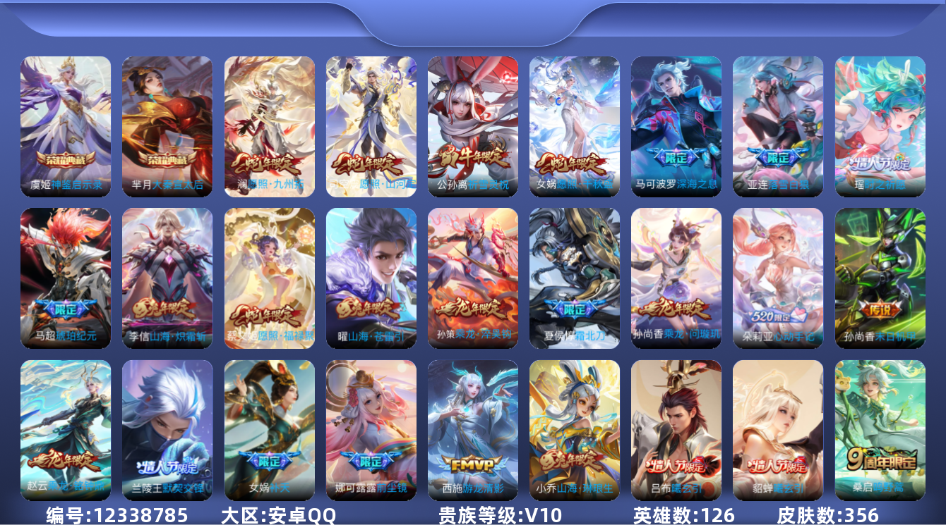 [12338785]【特价急出/详情看图】安卓Q-V10-永恒钻石II段位-126英雄-356皮肤-2典藏-47传说-104史诗