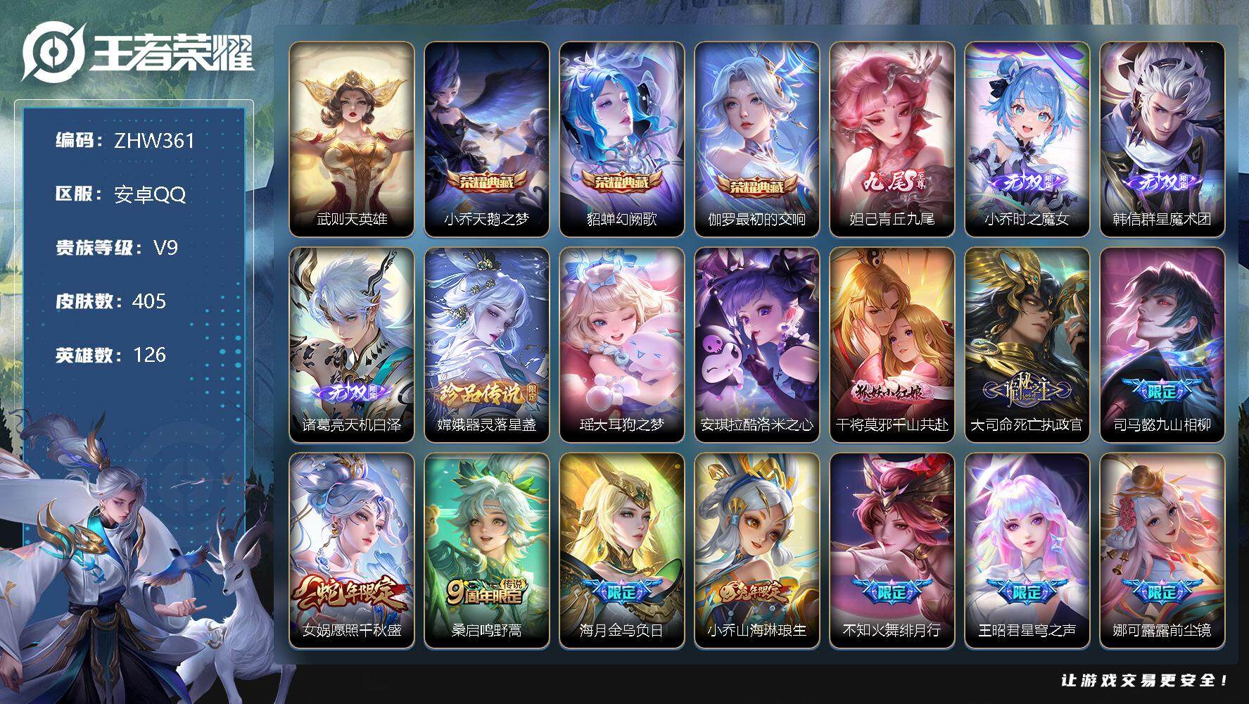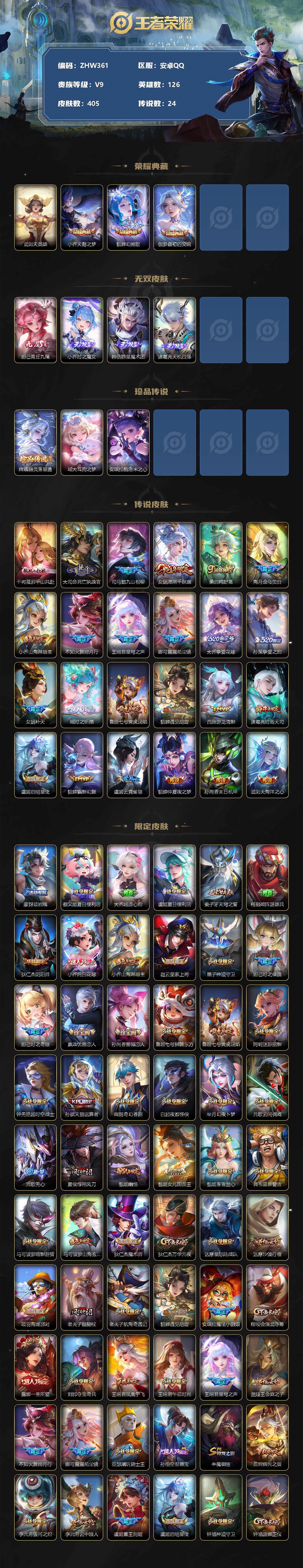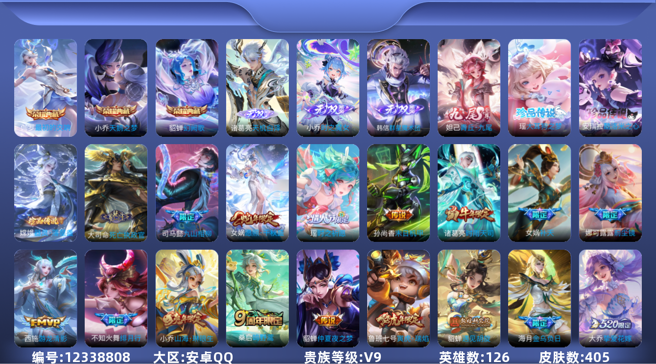[12338808]营地被封【特价急出/详情看图】:安卓Q-V9-至尊星耀II段位-126英雄-405皮肤-3典藏-4无双-3珍品传说-24传说-136史诗 【英雄全皮】:娜可露露全皮,钟馗全皮,女娲全皮,鬼谷子全皮,狂铁全皮,大司命全皮,金蝉全皮,空空儿全皮,少司缘全皮 【荣耀典藏】:武则天英雄,小乔天鹅之梦,貂蝉幻阙歌,伽罗最初的交响 【无双皮肤】:妲己青丘九尾,小乔时之魔女,韩信群星魔术团,诸葛亮天机白泽 【珍品传说】:嫦娥器灵落星盏,瑶大耳狗之梦,安琪拉酷洛米之心 【传说皮肤】:干将莫邪千山共赴,大司命死亡执政官,司马懿九山相柳,女娲愿照千秋盛,桑启鸣野蒿,海月金乌负日,小乔山海琳琅生,不知火舞绯月行,王昭君星穹之声,娜可露露前尘镜,大乔挚爱花嫁,孙策挚爱之约,女娲补天,瑶时之祈愿,鲁班七号寅虎瑞焰,貂蝉遇见胡旋,西施游龙清影,诸葛亮时雨天司,虞姬启明星使,貂蝉猫影幻舞,虞姬云霓雀翎,貂蝉仲夏夜之梦,孙尚香末日机甲,武则天海洋之心 【限定皮肤】:蒙犽顽岩魄,蔡文姬夏日便利店,大乔绒语心约,虞姬夏日便利店,姜子牙天穹之誓,杨戬破阵退雄兵,狄仁杰阴阳师,小乔纯白花嫁,小乔山海琳琅生,赵云皇家上将,墨子神迹守卫,妲己时之彼端,妲己时之奇旅,嬴政优雅恋人,孙尚香蔷薇恋人,鲁班七号狮舞东方,鲁班七号寅虎瑞焰,阿轲迷踪丽影,钟无艳超时空战士,孙膑天狼运算者,扁鹊奇幻香踪,白起夜都怪侠,芈月幻夜卜梦,元歌云间偶戏,元歌无心,夏侯惇朔风刀,甄姬幽恒,甄姬女儿国国王,甄姬落雪兰心,典韦蓝屏警告,马可波罗暗影游猎,马可波罗山海玄木吟,狄仁杰魔术师,狄仁杰万华元夜,达摩星际陆战队,达摩沙漠行僧,项羽海滩派对,老夫子醍醐杖,老夫子航海奇遇记,貂蝉遇见胡旋,安琪拉魔法小厨娘,程咬金演武夺筹,露娜一生所爱,刘邦夺宝奇兵,王昭君凤凰于飞,王昭君午后时光,王昭君星穹之声,兰陵王金庭之子,不知火舞绯月行,娜可露露前尘镜,亚瑟潮玩骑士王,孙悟空至尊宝,牛魔御旌,后羿辉光之辰,李元芳银河之约,李元芳云中旅人,虞姬霸王别姬,虞姬启明星使,钟馗神迹守卫,钟馗驱傩正仪,杨玉环寅虎心曲,杨戬潮玩骑兵,女娲朔望之晖,女娲补天,干将莫邪冰霜恋舞曲,雅典娜单词大作战,雅典娜黎明之约,蔡文姬繁星吟游,鬼谷子原初探秘者,鬼谷子五谷丰年,诸葛亮时雨天司,大乔白鹤梁神女,大乔挚爱花嫁,百里玄策原初追逐者,百里守约朱雀志,弈星混沌棋,梦