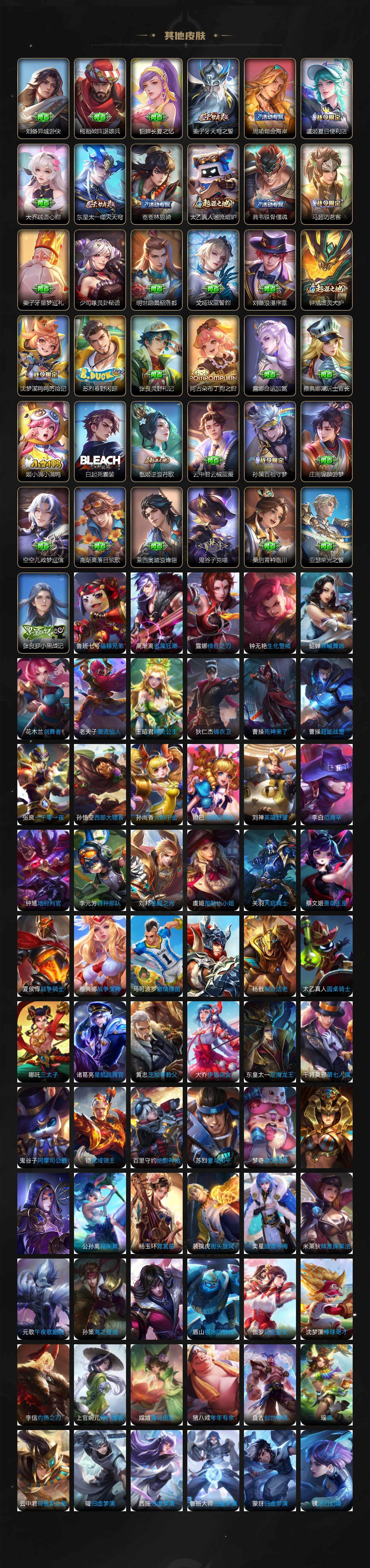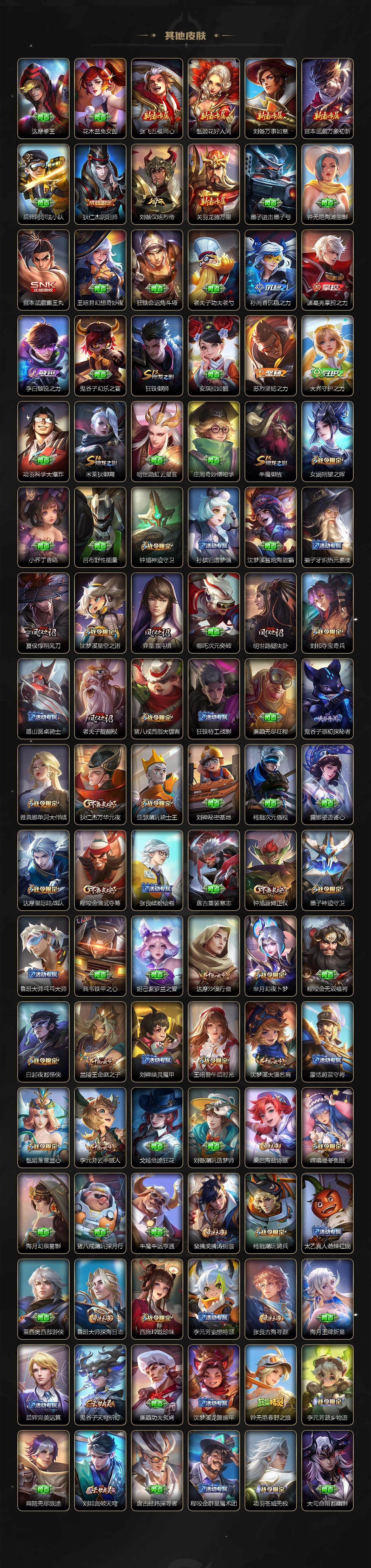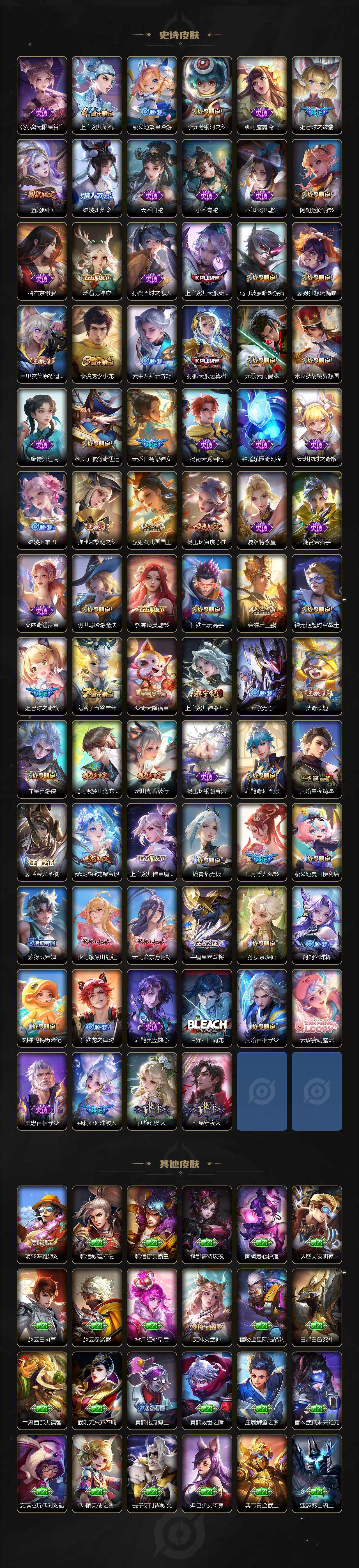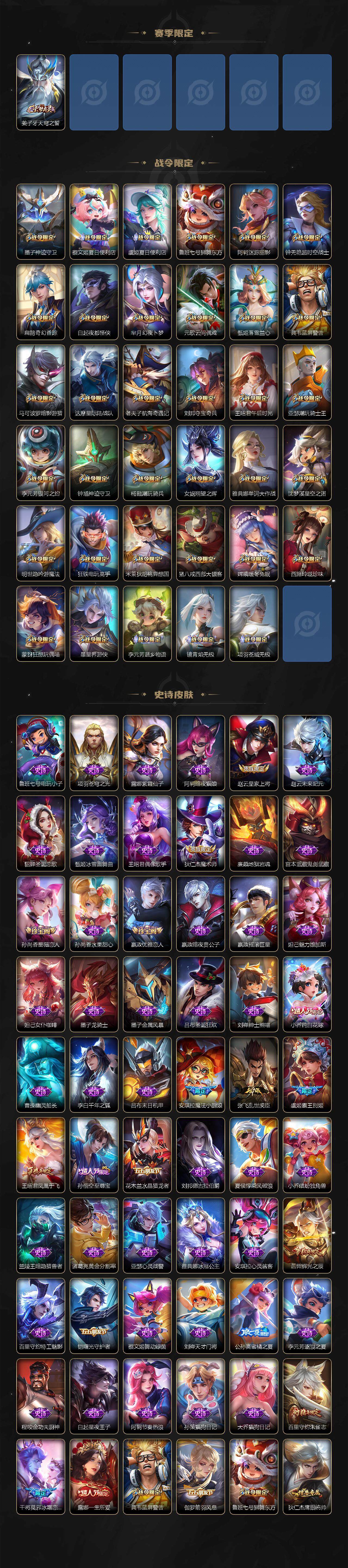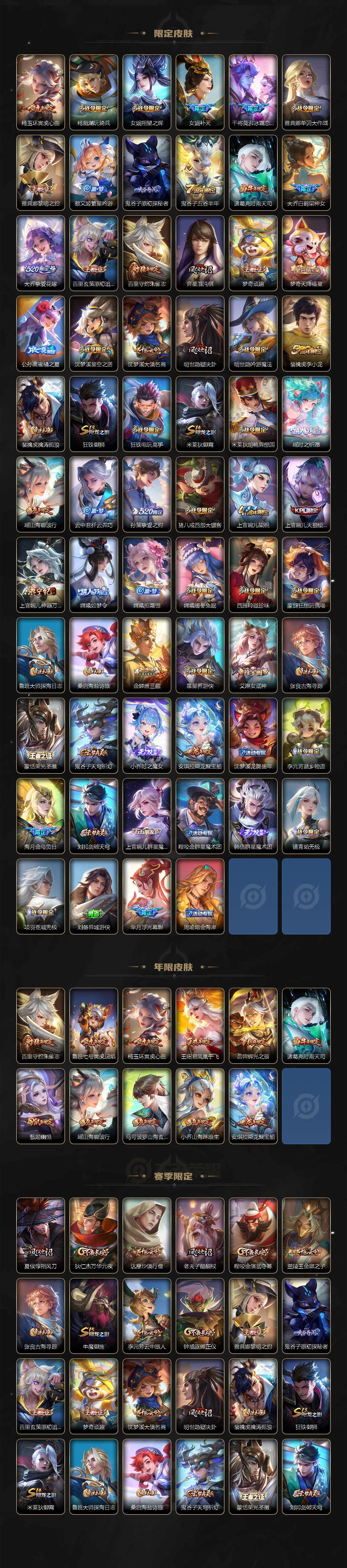 【限定皮肤】:蒙犽顽岩魄,蔡文姬夏日便利店,大乔绒语心约,虞姬夏日便利店,姜子牙天穹之誓,杨戬破阵退雄兵,狄仁杰阴阳师,小乔纯白花嫁,小乔山海琳琅生,赵云皇家上将,墨子神迹守卫,妲己时之彼端,妲己时之奇旅,嬴政优雅恋人,孙尚香蔷薇恋人,鲁班七号狮舞东方,鲁班七号寅虎瑞焰,阿轲迷踪丽影,钟无艳超时空战士,孙膑天狼运算者,扁鹊奇幻香踪,白起夜都怪侠,芈月幻夜卜梦,元歌云间偶戏,元歌无心,夏侯惇朔风刀,甄姬幽恒,甄姬女儿国国王,甄姬落雪兰心,典韦蓝屏警告,马可波罗暗影游猎,马可波罗山海玄木吟,狄仁杰魔术师,狄仁杰万华元夜,达摩星际陆战队,达摩沙漠行僧,项羽海滩派对,老夫子醍醐杖,老夫子航海奇遇记,貂蝉遇见胡旋,安琪拉魔法小厨娘,程咬金演武夺筹,露娜一生所爱,刘邦夺宝奇兵,王昭君凤凰于飞,王昭君午后时光,王昭君星穹之声,兰陵王金庭之子,不知火舞绯月行,娜可露露前尘镜,亚瑟潮玩骑士王,孙悟空至尊宝,牛魔御旌,后羿辉光之辰,李元芳银河之约,李元芳云中旅人,虞姬霸王别姬,虞姬启明星使,钟馗神迹守卫,钟馗驱傩正仪,杨玉环寅虎心曲,杨戬潮玩骑兵,女娲朔望之晖,女娲补天,干将莫邪冰霜恋舞曲,雅典娜单词大作战,雅典娜黎明之约,蔡文姬繁星吟游,鬼谷子原初探秘者,鬼谷子五谷丰年,诸葛亮时雨天司,大乔白鹤梁神女,大乔挚爱花嫁,百里玄策原初追逐者,百里守约朱雀志,弈星混沌棋,梦