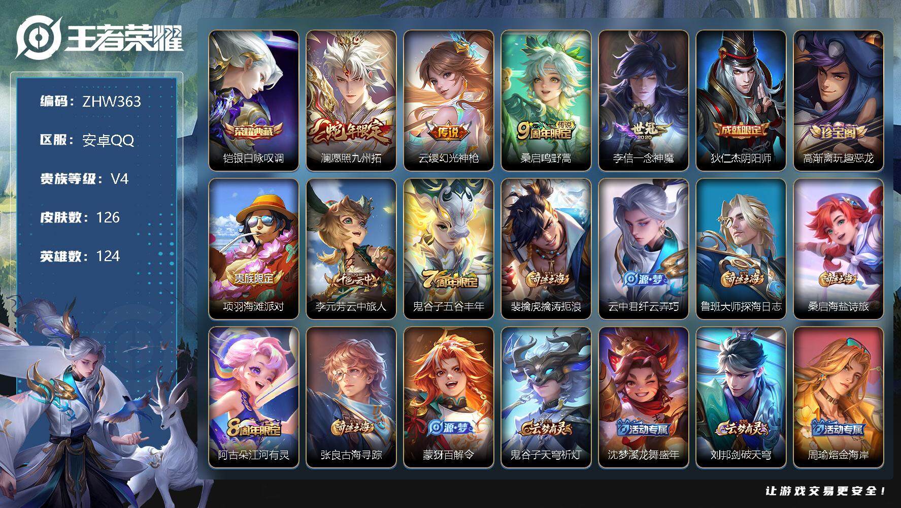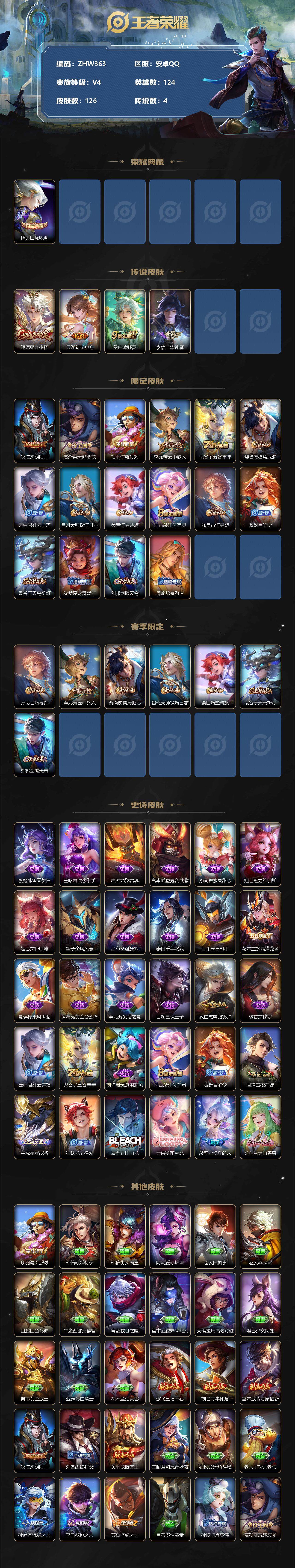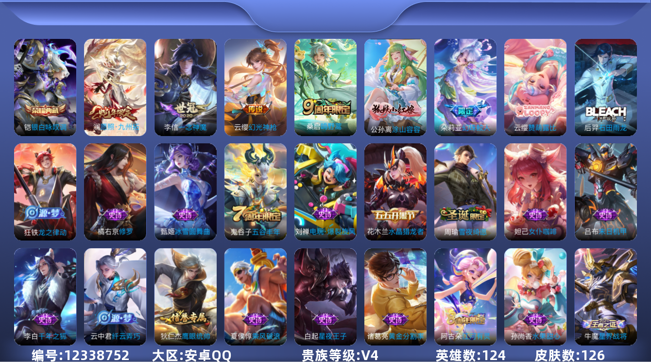 [12338752]【特价急出/详情看图】:安卓Q-V4-永恒钻石I段位-124英雄-126皮肤-1典藏-0珍品无双-0无双-0珍品传说-4传说-30史诗