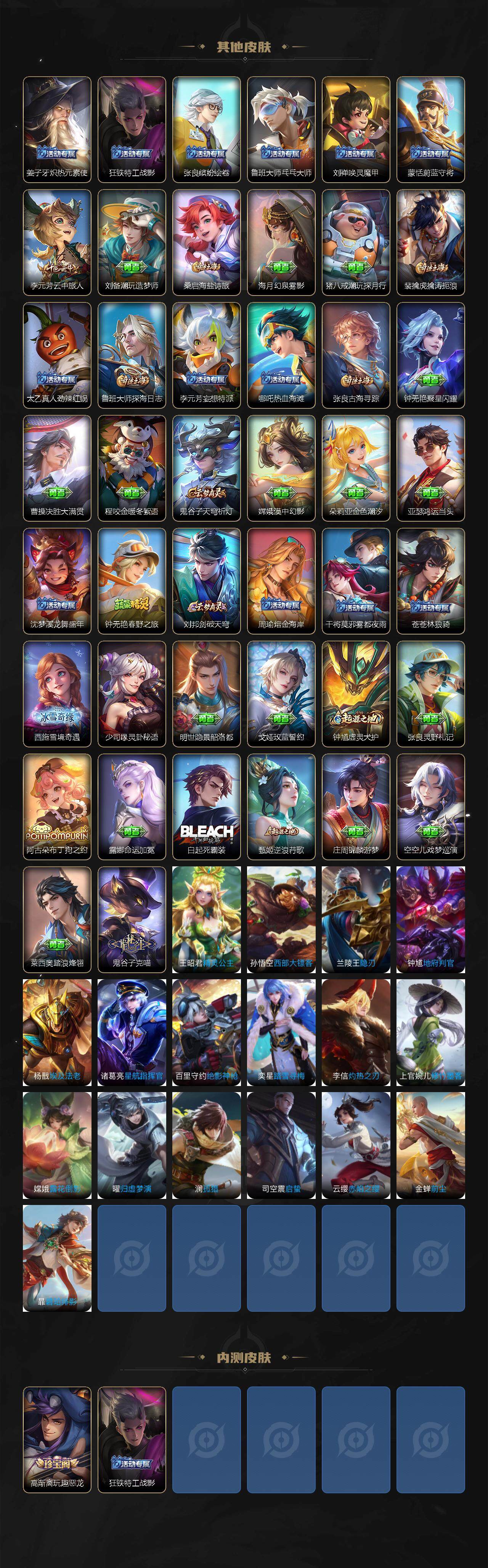 【其他皮肤】:项羽海滩派对,韩信教廷特使,韩信街头霸王,阿轲爱心护理,赵云白执事,赵云忍炎影,白起白色死神,牛魔西部大镖客,扁鹊救世之瞳,宫本武藏未来纪元,安琪拉玩偶对对碰,妲己少女阿狸,典韦黄金武士,亚瑟死亡骑士,花木兰兔女郎,张飞五福同心,刘备万事如意,宫本武藏万象初新,狄仁杰阴阳师,刘备纽约教父,关羽龙腾万里,王昭君幻想奇妙夜,狂铁命运角斗场,老夫子功夫老勺,孙尚香沉稳之力,李白敏锐之力,苏烈坚韧之力,吕布野性能量,孙膑归虚梦演,高渐离玩趣恶龙,姜子牙炽热元素使,狂铁特工战影,张良缤纷绘卷,鲁班大师乓乓大师,刘禅唤灵魔甲,蒙恬蔚蓝守将,李元芳云中旅人,刘备潮玩造梦师,桑启海盐诗旅,海月幻泉雾影,猪八戒潮玩探月行,裴擒虎擒涛扼浪,太乙真人劲辣红锅,鲁班大师探海日志,李元芳妄想特派,哪吒热血海滩,张良古海寻踪,钟无艳聚星闪耀,曹操决胜大满贯,程咬金暖冬絮语,鬼谷子天穹祈灯,嫦娥漠中幻影,朵莉亚金色潮汐,亚瑟鸿运当头,沈梦溪龙舞盛年,钟无艳春野之旅,刘邦剑破天穹,周瑜熔金海岸,干