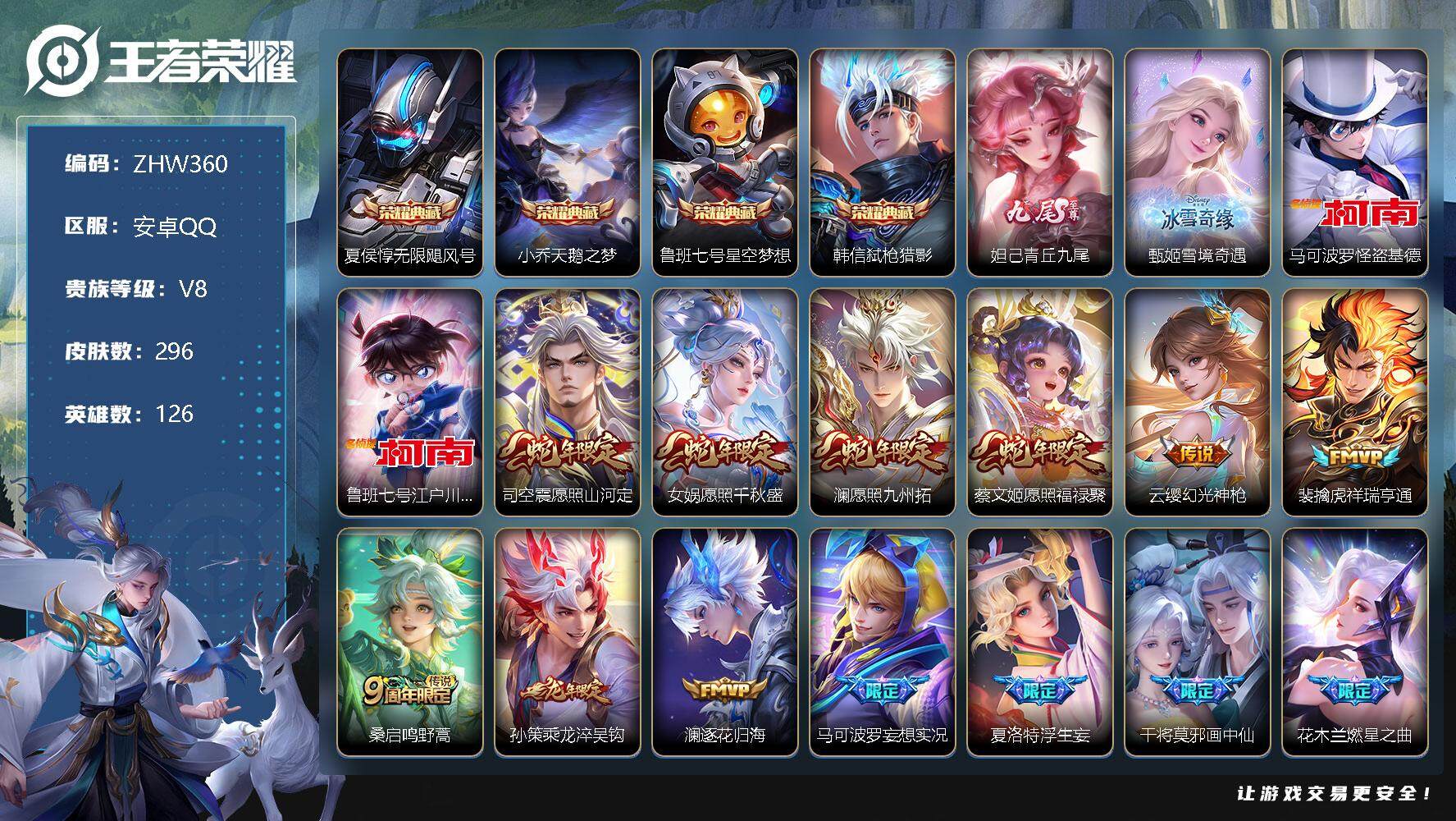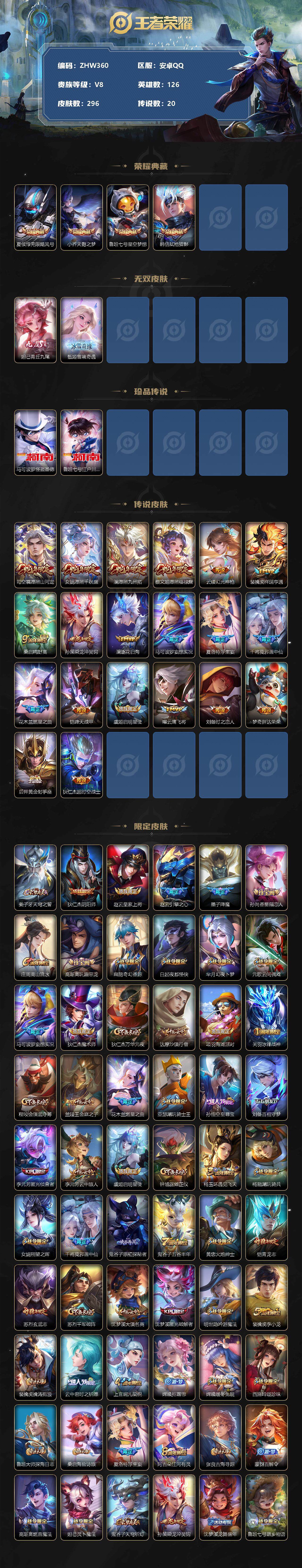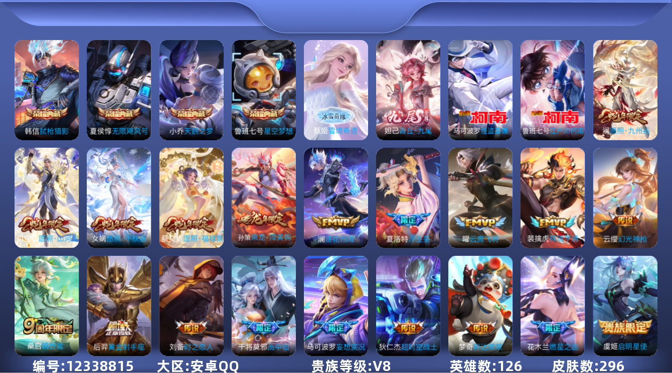 [12338815]【商品标题】:【特价急出/详情看图】安卓Q-V8-至尊星耀II段位-126英雄-296皮肤-4典藏-2无双-2珍品传说-20传说-80史诗