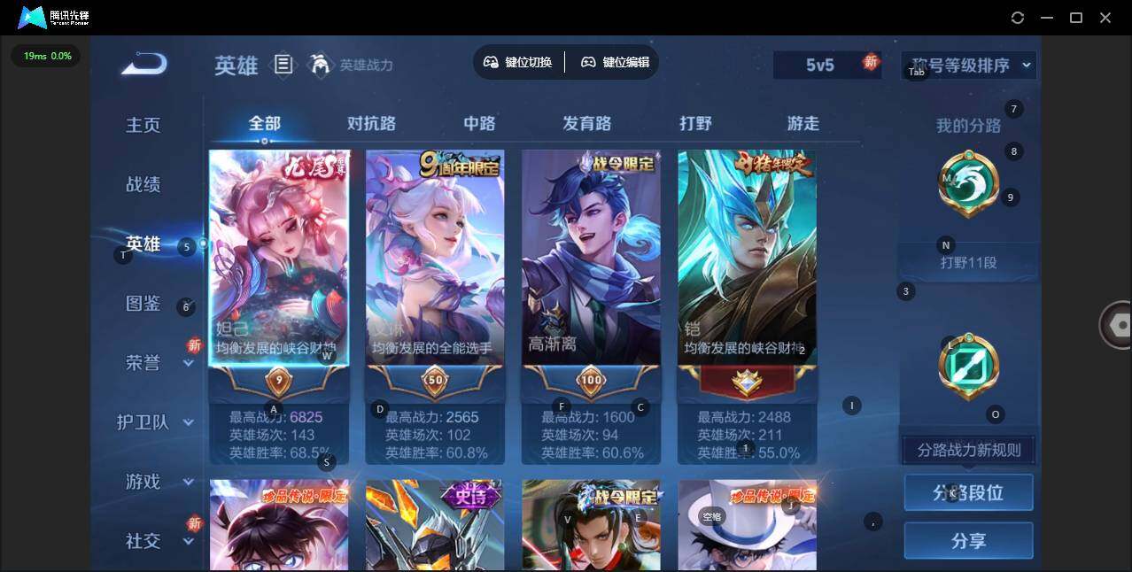 - PX_2102671-贵族等级: V6 英雄数: 120 皮肤数: 134 荣耀水晶: 鸣剑·曳影 传说皮: 云鹰飞将,澜逐花归海,幻光神枪 限定皮: 李小龙,青龙志,鸣野蒿,逐霄战戟,愿照·九州拓
