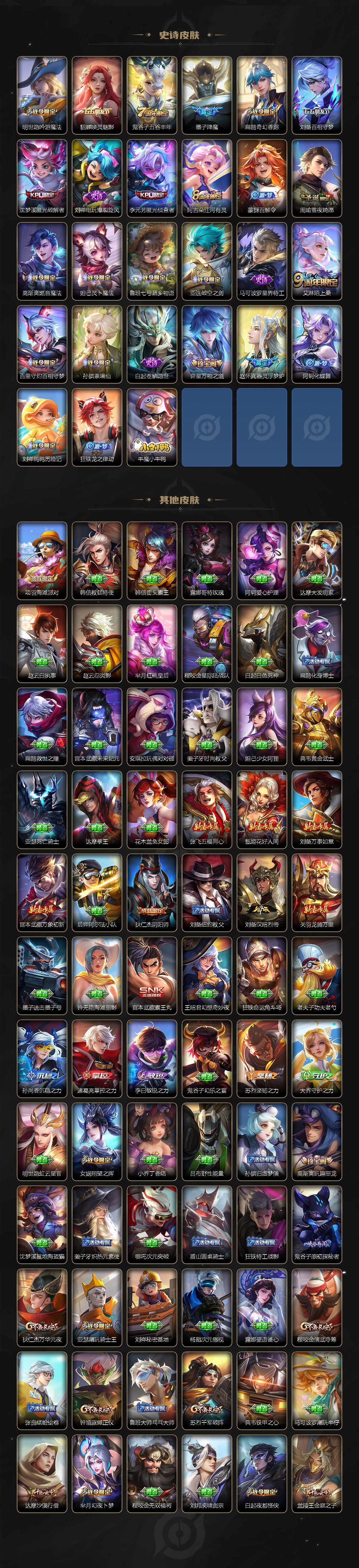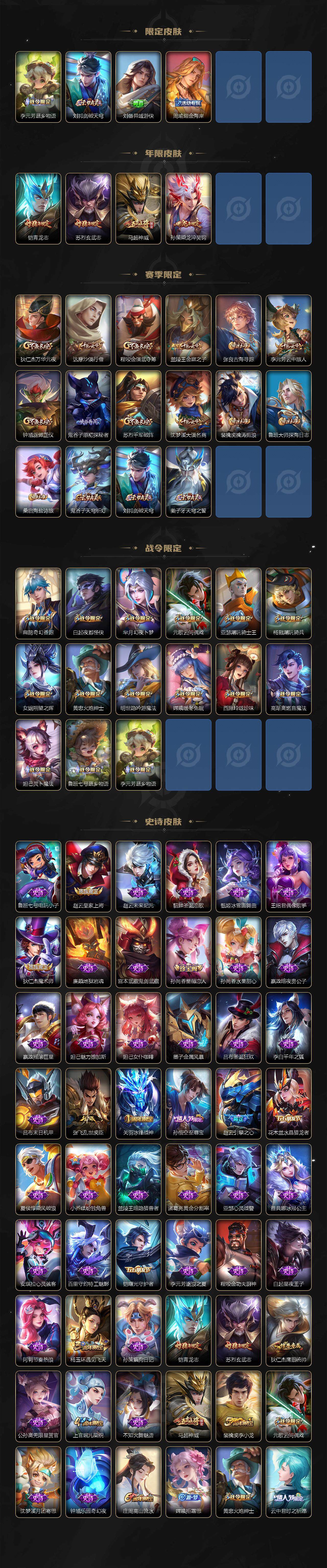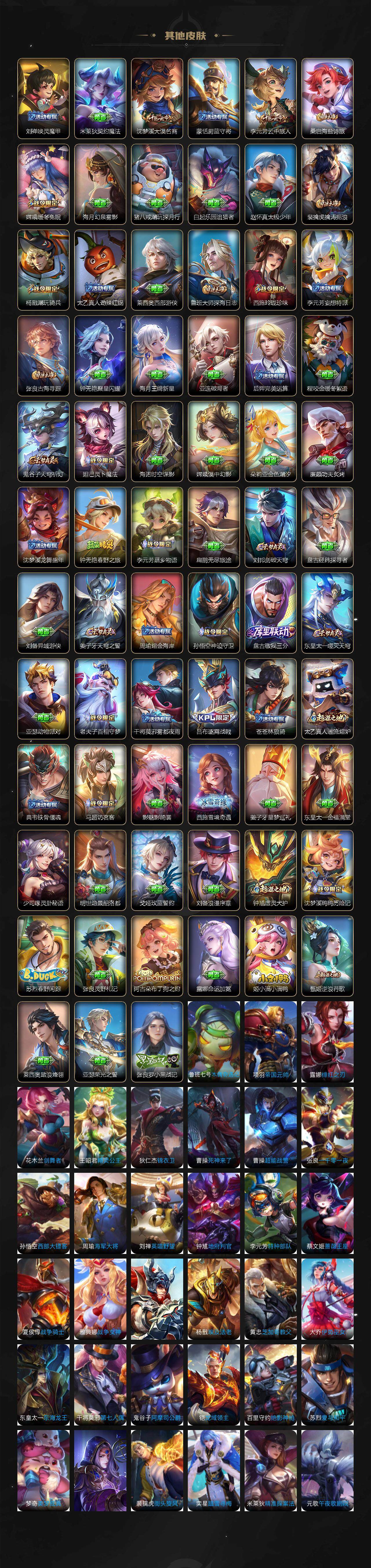 【限定皮肤】:姜子牙天穹之誓,狄仁杰阴阳师,赵云皇家上将,赵云引擎之心,墨子降魔,孙尚香蔷薇恋人,庄周高山流水,高渐离玩趣恶龙,扁鹊奇幻香踪,白起夜都怪侠,芈月幻夜卜梦,元歌云间偶戏,马可波罗妄想实况,狄仁杰魔术师,狄仁杰万华元夜,达摩沙漠行僧,项羽海滩派对,关羽冰锋战神,程咬金演武夺筹,兰陵王金庭之子,花木兰燃星之曲,亚瑟潮玩骑士王,孙悟空至尊宝,刘备百相守梦,李元芳匿光侦查者,李元芳云中旅人,虞姬启明星使,钟馗驱傩正仪,杨玉环遇见飞天,杨戬潮玩骑兵,女娲朔望之晖,干将莫邪画中仙,鬼谷子原初探秘者,鬼谷子五谷丰年,黄忠火炮绅士,铠青龙志,苏烈玄武志,苏烈千军破阵,沈梦溪大漠名商,沈梦溪匿光破解者,明世隐吟游魔法,裴擒虎李小龙,裴擒虎擒涛扼浪,云中君时之祈愿,上官婉儿梁祝,嫦娥拒霜思,嫦娥暖冬兔眠,西施玲珑珍味,鲁班大师探海日志,桑启海盐诗旅,夏洛特浮生妄,阿古朵江河有灵,张良古海寻踪,蒙犽百解令,高渐离燃音魔法,妲己灵卜魔法,鬼谷子天穹祈灯,孙策乘龙淬吴钩,沈梦溪龙舞盛年,鲁班七号蔬乡物语,李元芳蔬乡物语,刘邦剑破天穹,刘备异域游侠,周瑜熔金海岸