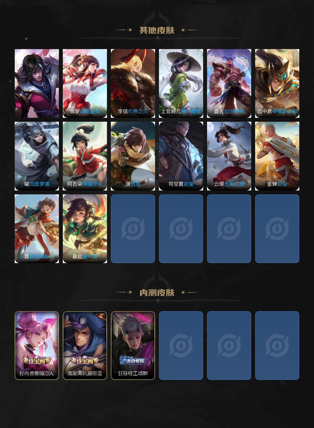 【赛季限定】:狄仁杰万华元夜,达摩沙漠行僧,程咬金演武夺筹,兰陵王金庭之子,张良古海寻踪,李元芳云中旅人,钟馗驱傩正仪,鬼谷子原初探秘者,苏烈千军破阵,沈梦溪大漠名商,裴擒虎擒涛扼浪,鲁班大师探海日志,桑启海盐诗旅,鬼谷子天穹祈灯,刘邦剑破天穹,姜子牙天穹之誓