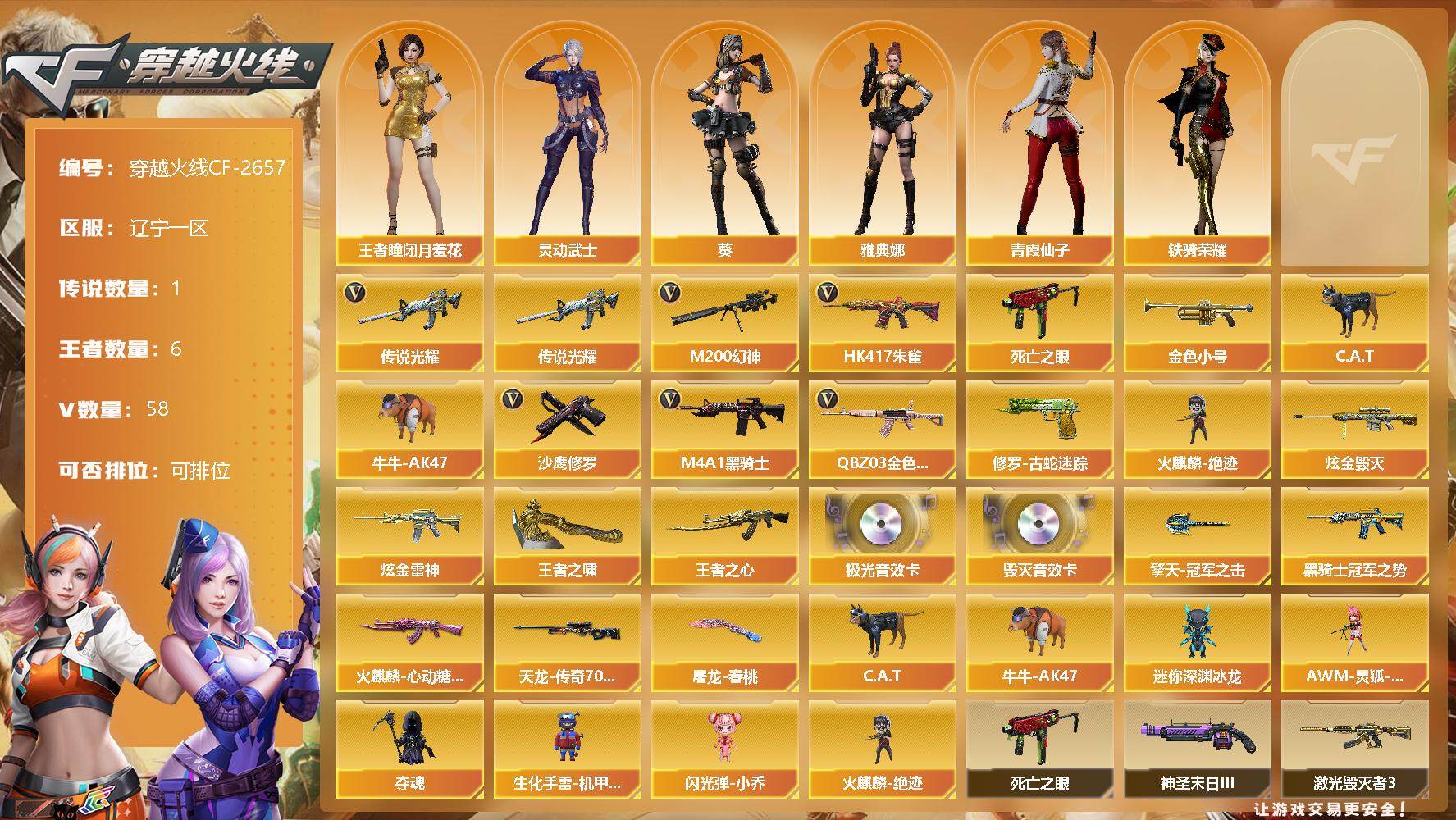 [12338977]【商品标题】:辽宁一区-58V-6王者-2炫金 【传说武器】:传说光耀 【热门武器】:传说光耀,QBZ03-金色蔷薇,HK417-朱雀,M200-幻神,修罗-古蛇迷踪,死亡之眼,金色小号,C.A.T,牛牛-AK47,M4A1-黑骑士,火麒麟-绝迹,沙鹰-修罗*3 【王者炫金武器】:炫金毁灭,炫金雷神,王者之心,王者之啸 【音效卡】:Barrett-毁灭音效卡,Barrett-极光音效卡 【稀有皮肤】:火麒麟-心动糖果,黑骑士-冠军之势,AWM-天龙-传奇70KG,屠龙-春桃 皮肤,擎天-冠军之击 【角色】:王者-瞳-闭月羞花,雅典娜,葵,铁骑荣耀,灵动武士,青霞仙子 【人偶武器】:火麒麟-绝迹,AWM-灵狐-15周年嘉年华,C.A.T,牛牛-AK47,迷你深渊冰龙,夺魂,生化手雷-机甲核心,闪光弹-小乔 【暴走生化】:死亡之眼 【挑战大师】:神圣爆裂者-末日III,阐释者III,激光毁灭者III 【英雄级武器】:斩神刀-雷暴,烈火-动感闪耀,天神-动感闪耀,屠龙-动感闪耀,手雷-动感闪耀,QBZ03-金色蔷薇,HK417-朱雀,无影-神兵利器,M4A1-玫瑰精灵*2,M4A1-黑骑士,AK47-火麒麟*2,AWM-天龙,Barrett-毁灭,Barrett-极光*2,M4A1-龙血*3,AA-12-雷霆*2,M200-幻神,M4A1-猎神,黑武士-锦绣游龙,黑骑士-海王,AK-47-猩红传说*8,AK47-B-战神,M4A1-赤狱骑士,修罗-古蛇迷踪,沙鹰-修罗*3,擎天*3,屠龙 【特殊枪械】:1黑骑士