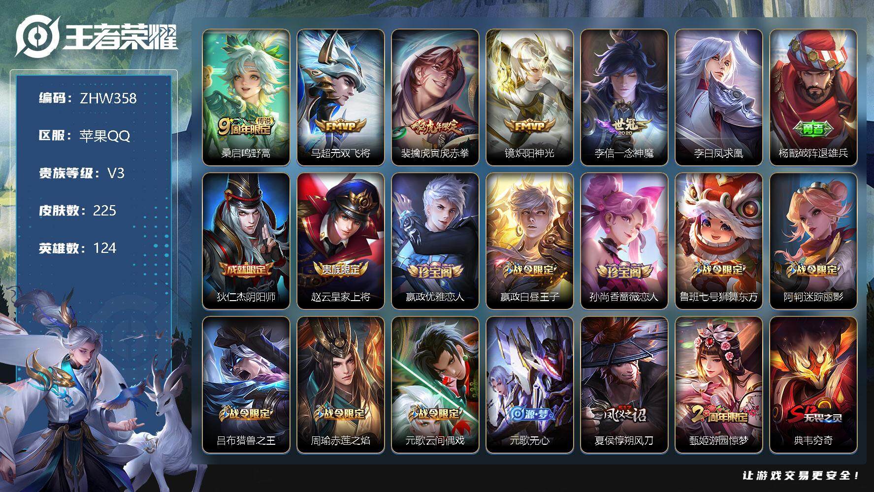 [12338926]【特价急出/详情看图】:苹果Q-V3-永恒钻石II段位-124英雄-225皮肤-6传说-48史诗 【传说皮肤】:桑启鸣野蒿,马超无双飞将,裴擒虎寅虎赤拳,镜炽阳神光,李信一念神魔,李白凤求凰 【限定皮肤】:杨戬破阵退雄兵,狄仁杰阴阳师,赵云皇家上将,嬴政优雅恋人,嬴政白昼王子,孙尚香蔷薇恋人,鲁班七号狮舞东方,阿轲迷踪丽影,吕布猎兽之王,周瑜赤莲之焰,元歌云间偶戏,元歌无心,夏侯惇朔风刀,甄姬游园惊梦,典韦穷奇,狄仁杰魔术师,狄仁杰万华元夜,达摩沙漠行僧,项羽海滩派对,老夫子醍醐杖,程咬金演武夺筹,刘邦夺宝奇兵,韩信逐梦之影,兰陵王驯魔猎人,兰陵王金庭之子,花木兰青春决赛季,亚瑟潮玩骑士王,孙悟空至尊宝,牛魔御旌,李元芳银河之约,李元芳云中旅人,钟馗神迹守卫,钟馗驱傩正仪,雅典娜黎明之约,蔡文姬繁星吟游,鬼谷子原初探秘者,鬼谷子五谷丰年,苏烈千军破阵,百里玄策原初追逐者,弈星混沌棋,梦奇顽趣,沈梦溪星空之诺,沈梦溪大漠名商,明世隐疑决卦,裴擒虎李小龙,裴擒虎寅虎赤拳,裴擒虎擒涛扼浪,狂铁御狮,米莱狄御霄,云中君纤云弄巧,盾山御銮,上官婉儿梁祝,嫦娥拒霜思,鲁班大师探海日志,桑启海盐诗旅,张良古海寻踪,鬼谷子天穹祈灯,刘邦剑破天穹,程咬金群星魔术团,周瑜熔金海岸 【年限皮肤】:裴擒虎寅虎赤拳,李白凤求凰 【赛季限定】:夏侯惇朔风刀,典韦穷奇,狄仁杰万华元夜,达摩沙漠行僧,老夫子醍醐杖,程咬金演武夺筹,兰陵王金庭之子,张良古海寻踪,牛魔御旌,李元芳云中旅人,钟馗驱傩正仪,雅典娜黎明之约,鬼谷子原初探秘者,苏烈千军破阵,百里玄策原初追逐者,弈星混沌棋,梦奇顽趣,沈梦溪大漠名商,明世隐疑决卦,裴擒虎擒涛扼浪,狂铁御狮,米莱狄御霄,盾山御銮,鲁班大师探海日志,桑启海盐诗旅,鬼谷子天穹祈灯,刘邦剑破天穹 【战令限定】:嬴政白昼王子,鲁班七号狮舞东方,阿轲迷踪丽影,吕布猎兽之王,周瑜赤莲之焰,元歌云间偶戏,刘邦夺宝奇兵,兰陵王驯魔猎人,亚瑟潮玩骑士王,李元芳银河之约,钟馗神迹守卫,沈梦溪星空之诺 【史诗皮肤】:露娜紫霞仙子,赵云皇家上将,赵云未来纪元,貂蝉圣诞恋歌,狄仁杰魔术师,廉颇地狱岩魂,宫本武藏鬼剑武藏,孙尚香蔷薇恋人,孙尚香水果甜心,嬴政优雅恋人,妲己魅力维加斯,妲己女仆咖啡,墨子金属风暴,曹操幽灵船长,李白千年之狐,张飞乱世虎臣,韩信白龙吟,孙悟空至尊宝,韩信逐梦之影