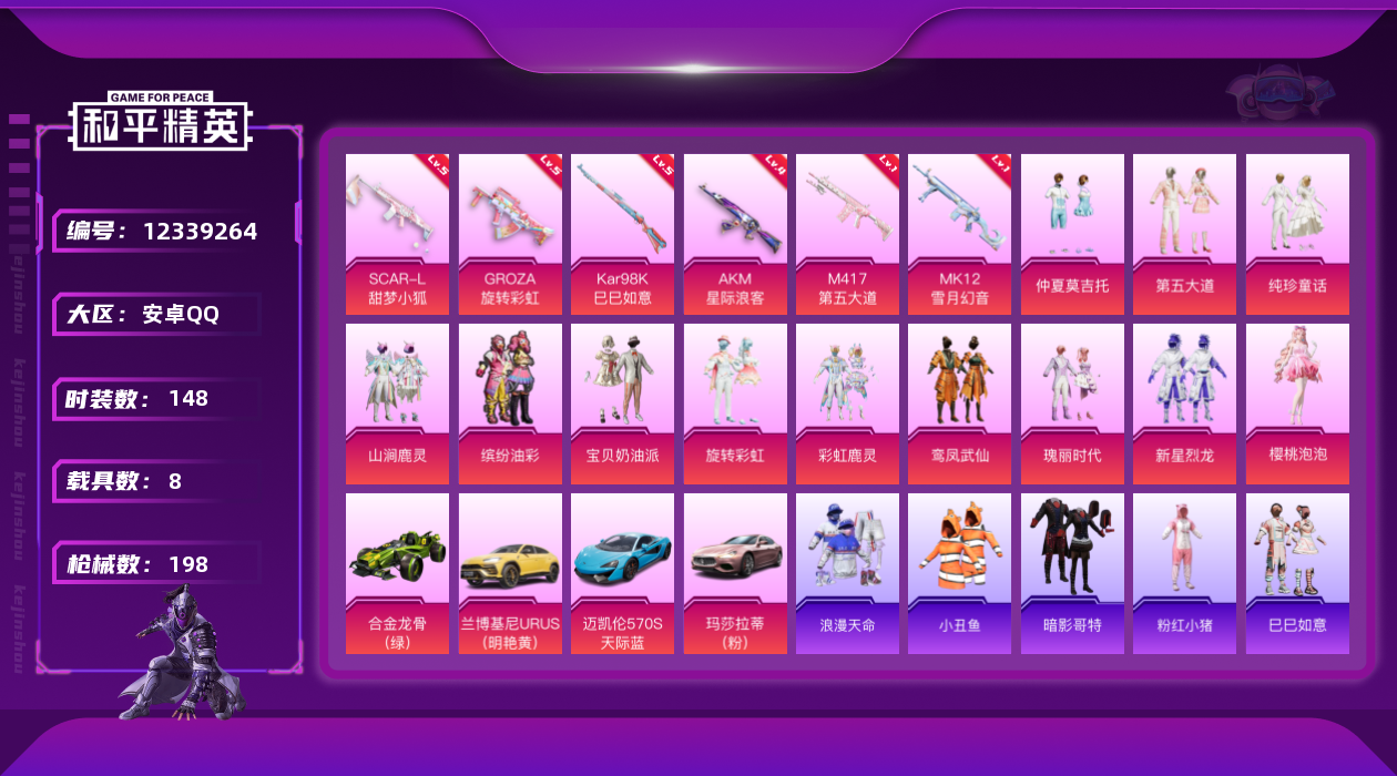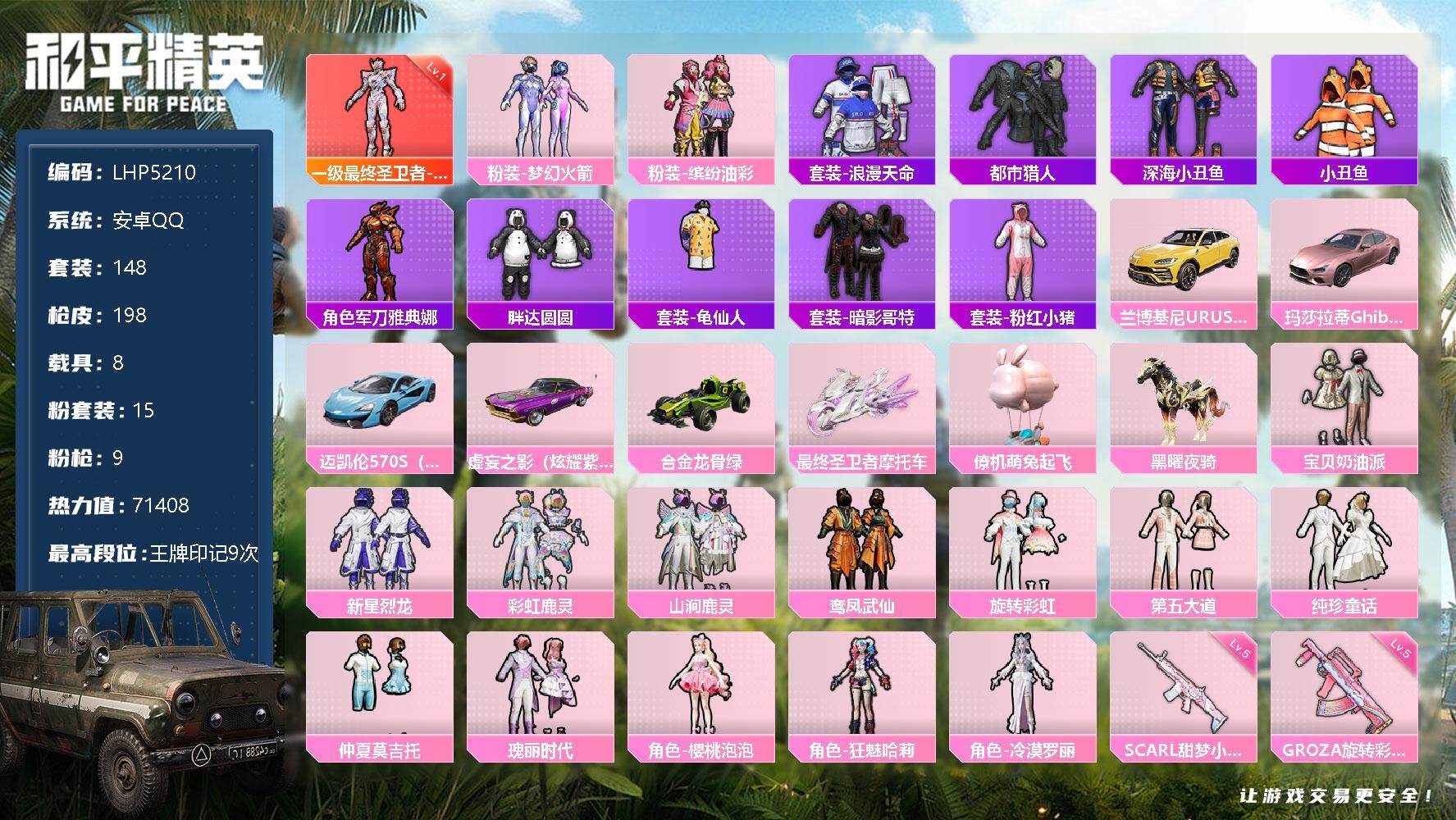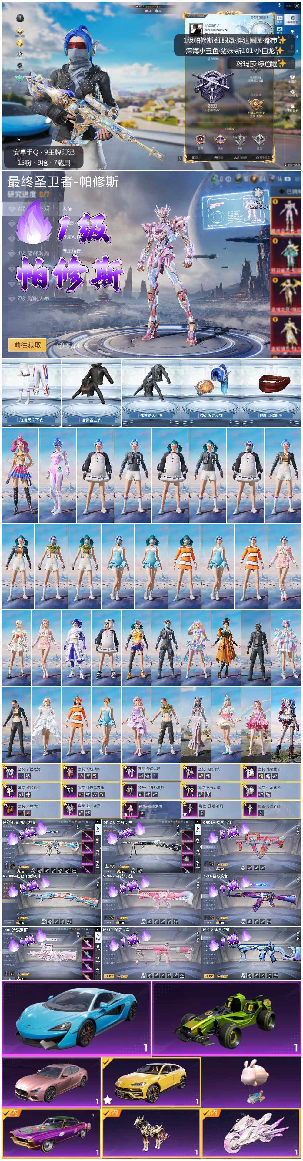 [12339264]素材身法号【特价急出/详情看图】:安卓 手Q-1神装-15粉装-9特效枪-8载具-4粉色飞行器-7.1w热力值-9王牌印记-148套装-198枪皮【红色神装等级】:最终圣卫者-帕修斯(一级)【热门品类】:粉装-梦幻火箭,粉装-缤纷油彩,套装-浪漫天命,套装-都市猎人,套装-深海小丑鱼,套装-小丑鱼,角色-军刀雅典娜,套装-胖达圆圆,套装-龟仙人,套装-暗影哥特,套装-粉红小猪【粉色载具】:兰博基尼URUS(明艳黄),玛莎拉蒂Ghibli(粉),迈凯伦570S(天际蓝),虚妄之影(炫耀紫),合金龙骨(绿),最终圣卫者摩托车,僚机-萌兔起飞,黑曜夜骑【粉色套装】:粉装-宝贝奶油派,粉装-梦幻火箭,粉装-缤纷油彩,粉装-新星烈龙,粉装-彩虹鹿灵,粉装-山涧鹿灵,粉装-鸾凤武仙,粉装-旋转彩虹,粉装-第五大道,粉装-纯珍童话,粉装-仲夏莫吉托,粉装-瑰丽时代,角色-樱桃泡泡,角色-狂魅哈莉,角色-冷漠罗丽【粉色枪皮等级】:AKM-星际浪客(四级),SCAR-L-甜梦小狐(五级),M416-灵猫魔法师(三级),GROZA-旋转彩虹(五级),P90-冷漠罗丽(四级),Kar98K-巳巳如意(五级),M417-第五大道(一级),MK12-雪月幻音(一级),DP-28-豹影疾电(五级)【粉色飞行器】:太空嘟嘟飞行器,纯梦嫁纱飞行翼,终晖之翼飞行器,灵猫魔法师飞行器