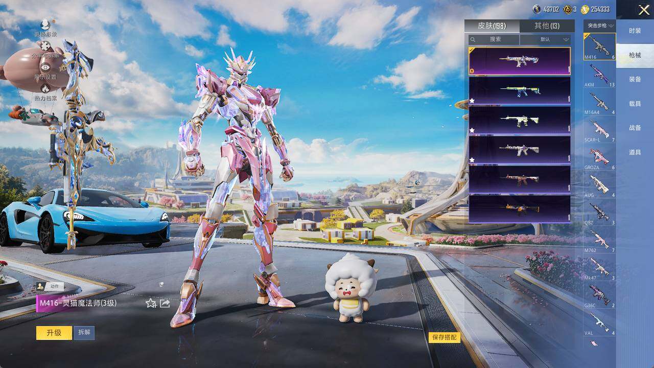 AKM-星际浪客,SCAR-L-甜梦小狐,GROZA-旋转彩虹,Kar98K-巳巳如意,M417-第五大道,MK12-雪月幻音