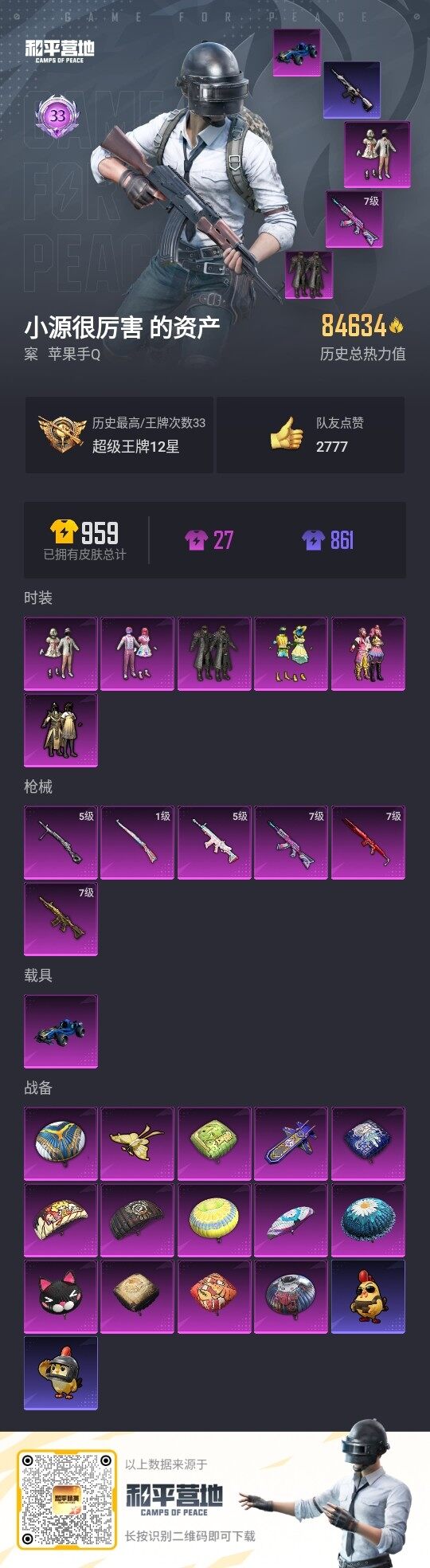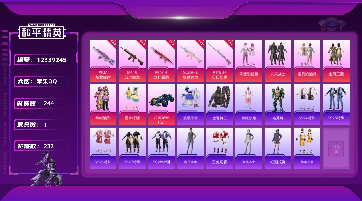 - PX_2096096- 苹果手Q-25王牌印记-有战神框-15粉装-7特效枪-3载具-114733热力值-283套装-318枪皮-2卓越印记-0传奇印记 【15粉装】,天使彩虹糖,洛天依,花间之火,极致幻想,暗夜玫瑰,复仇流浪者,幻彩马卡龙,桀骜红莲,彩虹鹿灵,山涧鹿灵,香水柠檬,幻影战神,数码大师,星之彼岸,齐天大圣 【7特效枪】AKM-炫紫旋律-7级 SCAR-L-机甲封神-5级 M416-心