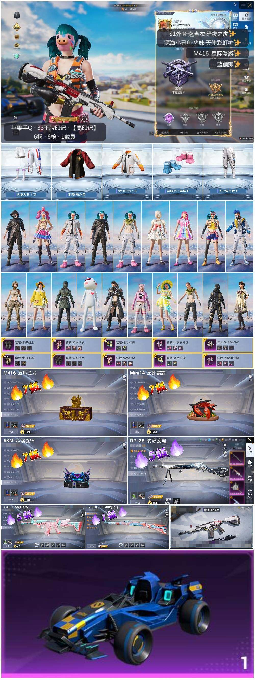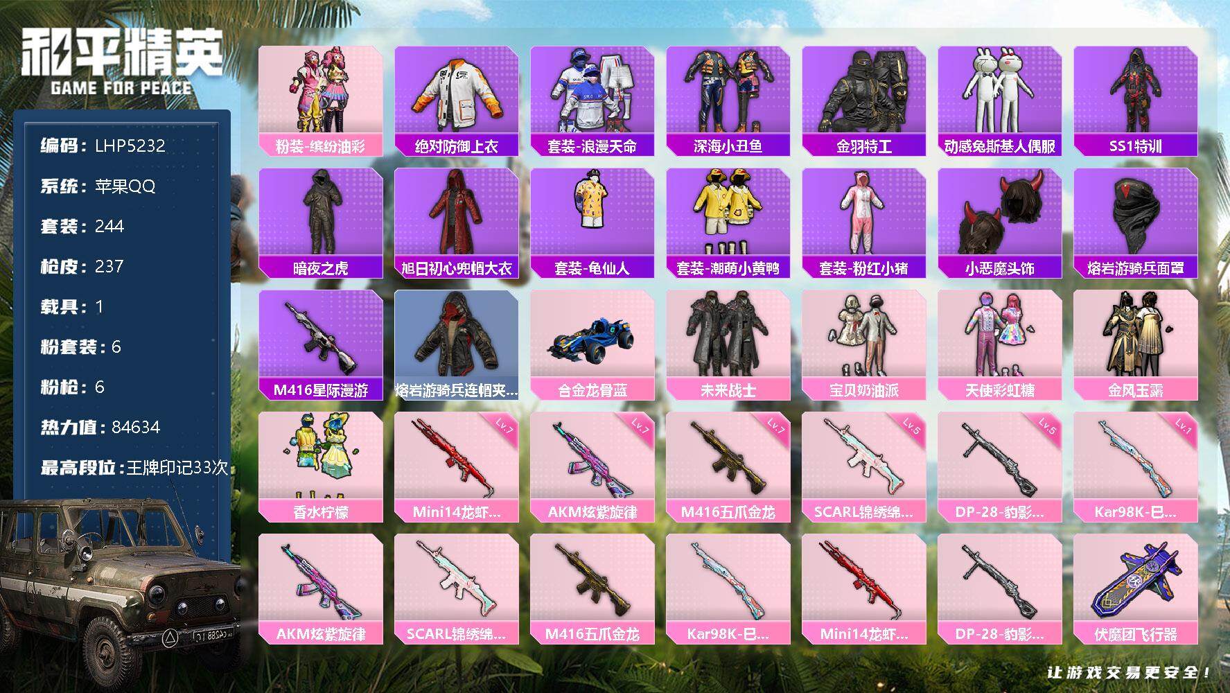 [12339245]单字ID:梥/超高33印记/素材身法号【特价急出/详情看图】:苹果 手Q-6粉装-6特效枪-1载具-2粉色飞行器-8.4w热力值-33王牌印记-244套装-237枪皮【热门品类】:粉装-缤纷油彩,绝对防御上衣,套装-浪漫天命,套装-深海小丑鱼,套装-金羽特工,套装-动感兔斯基人偶服,套装-SS1特训,套装-暗夜之虎,旭日初心兜帽大衣,套装-龟仙人,套装-潮萌小黄鸭,套装-粉红小猪,小恶魔头饰,熔岩游骑兵面罩,M416-星际漫游,熔岩游骑兵连帽夹克【粉色载具】:合金龙骨(蓝)【粉色套装】:粉装-未来战士,粉装-宝贝奶油派,粉装-天使彩虹糖,粉装-金风玉露,粉装-缤纷油彩,粉装-香水柠檬【粉色枪皮等级】:AKM-炫紫旋律(七级),SCAR-L-锦绣绵绵(五级),M416-五爪金龙(七级),Kar98K-巳巳如意(一级),Mini14-龙虾霸霸(七级),DP-28-豹影疾电(五级)【粉色飞行器】:伏魔团飞行器,庄周梦蝶飞行器