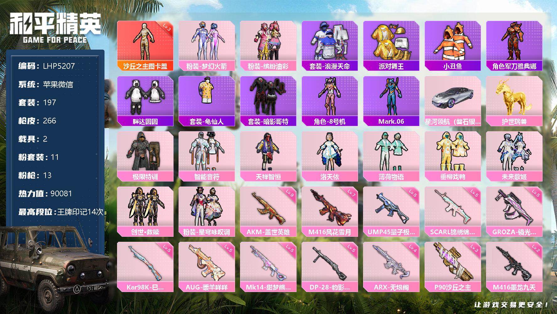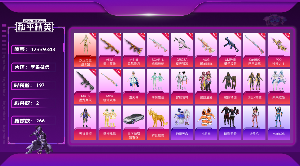[12339343]素材身法号/AKM-盖世英雄(九级)/绝世印记1/地铁满天赋【特价急出/详情看图】:苹果 微信-1神装-11粉装-13特效枪-2载具-8粉色飞行器-9w热力值-14王牌印记-197套装-266枪皮【红色神装等级】:沙丘之主-图卡盟(三级)【热门品类】:粉装-梦幻火箭,粉装-缤纷油彩,套装-浪漫天命,套装-派对舞王,套装-小丑鱼,角色-军刀雅典娜,套装-胖达圆圆,套装-龟仙人,套装-暗影哥特,角色-8号机,角色-Mark.06【粉色载具】:星河领航(磐石银),护世瑞兽【粉色套装】:粉装-极限特训,粉装-梦幻火箭,粉装-智能音符,粉装-缤纷油彩,粉装-天禅智恒,角色-洛天依,粉装-薄荷物语,粉装-垂柳戏鸭,粉装-未来歌姬,套装-创世·救赎,粉装-星穹咏叹调【粉色枪皮等级】:AKM-盖世英雄(九级),SCAR-L-锦绣绵绵(五级),M416-风花雪月(七级),M416-墨龙九天(二级),GROZA-镜光银凌(五级),AUG-暖羊咩咩(五级),ARX-无垠阁(四级),UMP45-量子极限(五级),P90-沙丘之主(三级),Kar98K-巳巳如意(五级),M24-镜域双华(一级),Mk14-甜梦熊击(五级),DP-28-豹影疾电(五级)【粉色飞行器】:酣梦熊熊飞行器,梦幻火箭飞行器,歌者泠鸢飞行器,沙丘之主天马,镜域双华-灵镜之阶,龙翔九天飞行器,圣域金龙飞行器
