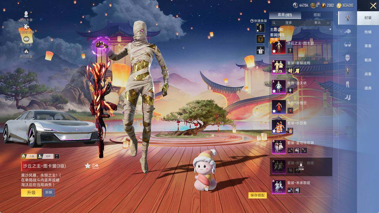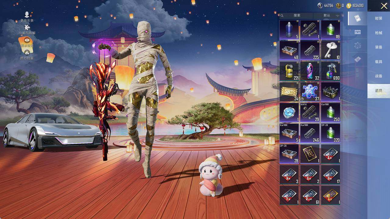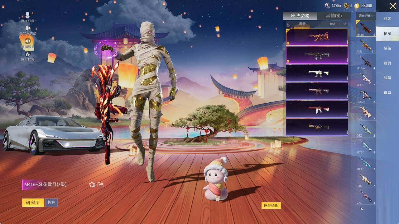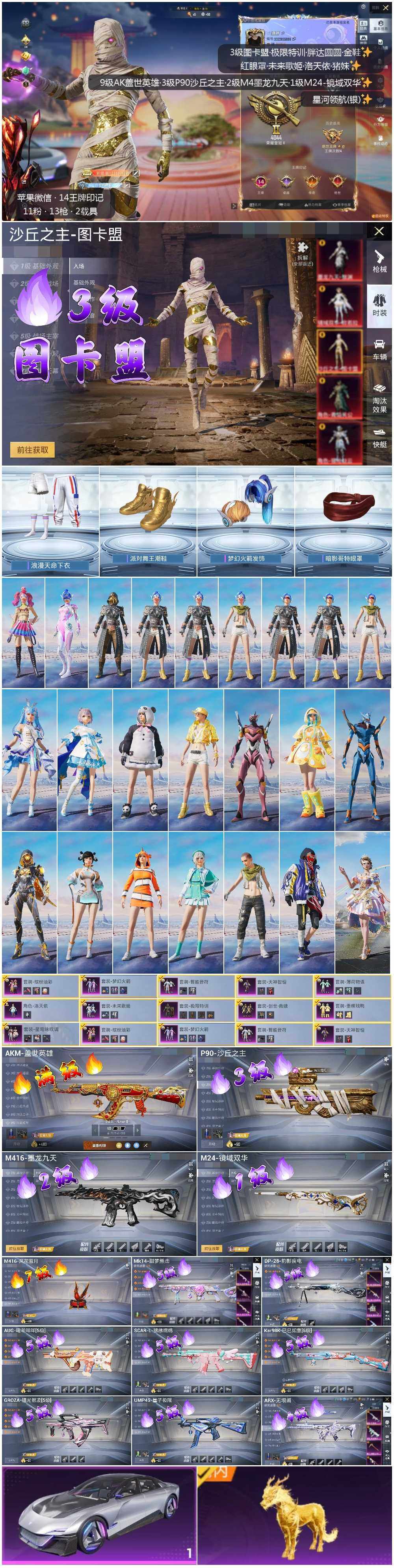 AKM-盖世英雄,M416-风花雪月,M416-墨龙九天,GROZA-镜光银凌,AUG-暖羊咩咩,UMP45-量子极限,P90-沙丘之主,Kar98K-巳巳如意,M24-镜域双华