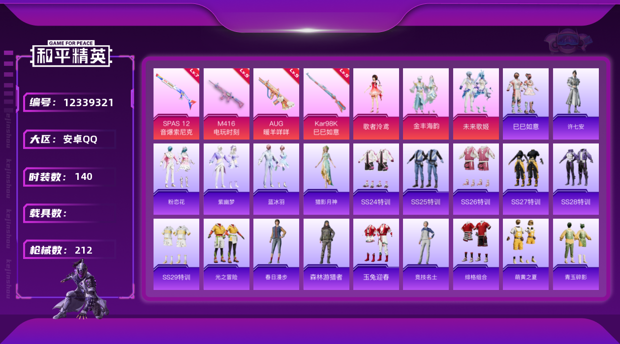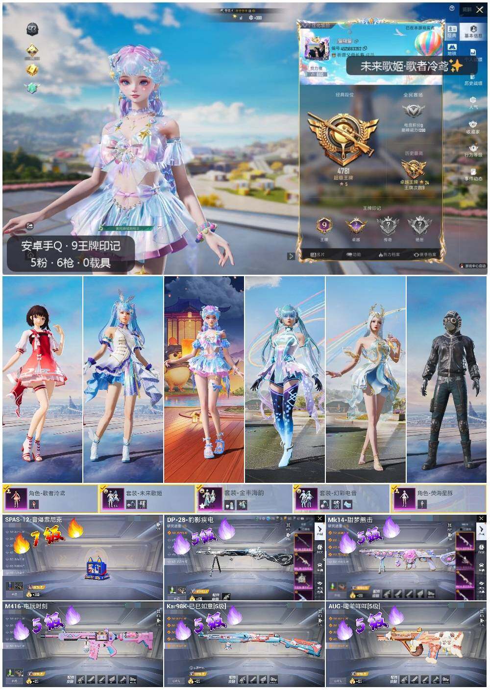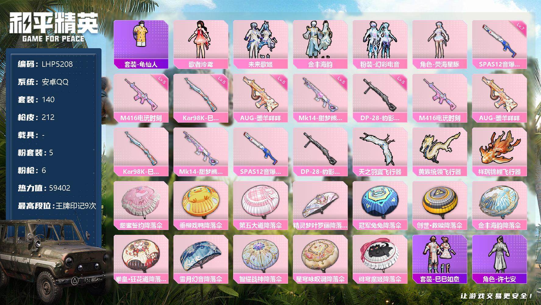 [12339321]地铁满天赋【特价急出/详情看图】:安卓 手Q-5粉装-6特效枪-3粉色飞行器-5.9w热力值-9王牌印记-140套装-212枪皮【热门品类】:套装-龟仙人【粉色套装】:角色-歌者泠鸢,粉装-未来歌姬,粉装-金丰海韵,粉装-幻彩电音,角色-荧海星豚【粉色枪皮等级】:M416-电玩时刻(五级),AUG-暖羊咩咩(五级),Kar98K-巳巳如意(五级),Mk14-甜梦熊击(五级),SPAS-12-音爆索尼克(七级),DP-28-豹影疾电(五级)【粉色飞行器】:天之羽翼飞行器,黄族统领飞行器,祥瑞锦鲤飞行器