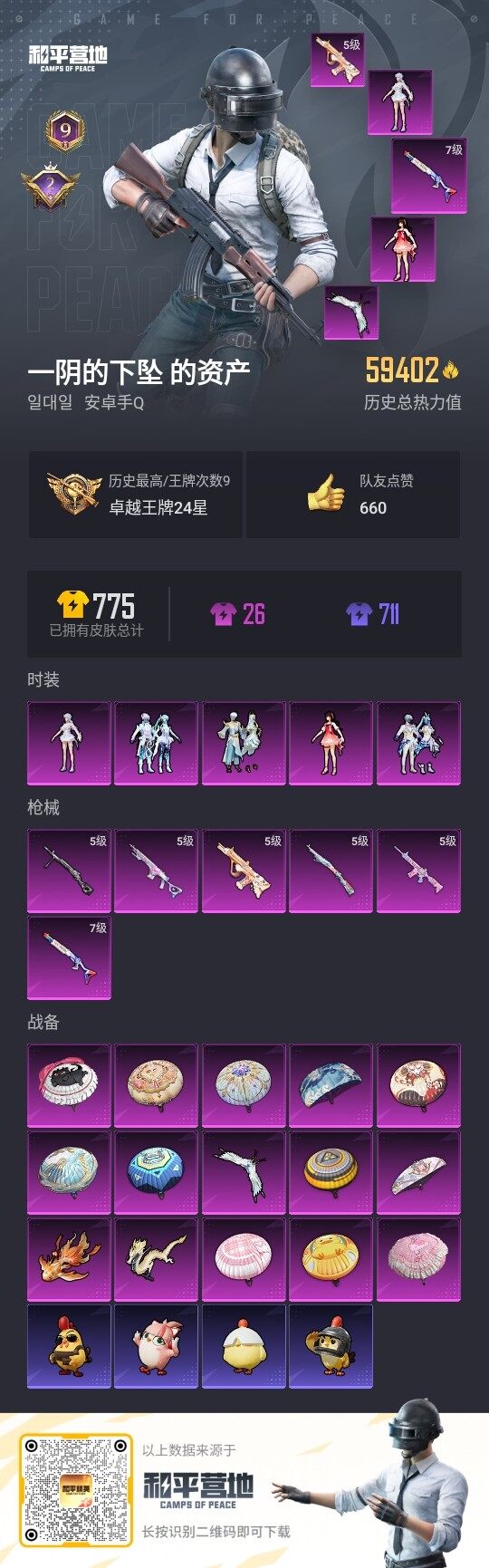 - PX_2055912- 苹果手Q-15王牌印记-6粉装-4特效枪-1载具-61698热力值-148套装-211枪皮-1卓越印记-1传奇印记 【6粉装】,零号机款机体服,蝶舞迷情,小可学妹,莲影清波,朗月武圣,仲夏莫吉托 【4特效枪】M416-电玩时刻-5级 Kar98K-巳巳如意-5级 Vector-环太平洋-7级 平底锅-仲夏莫吉托-6级 【3稀有紫装】,雪山精英,龟仙人,真嗣款战斗服, 【1
