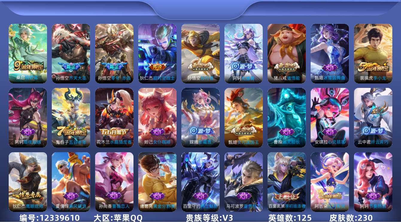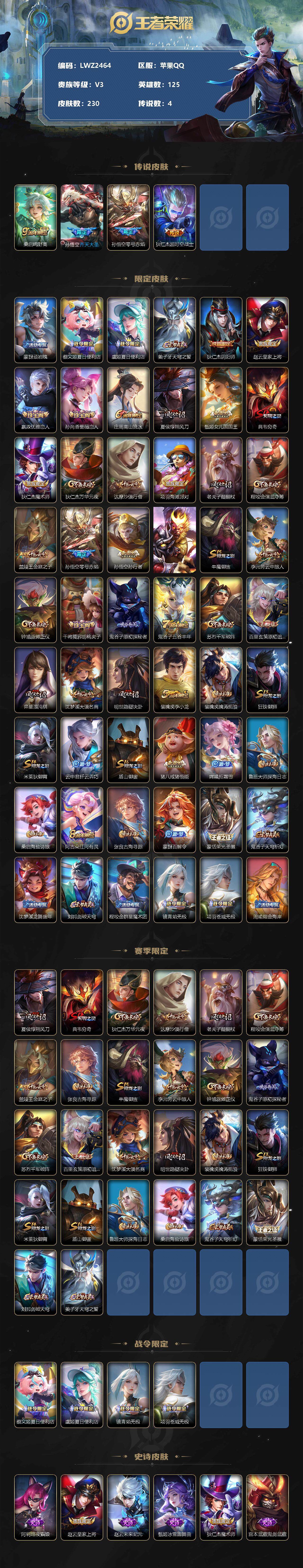 [12339610]【特价急出/详情看图】:苹果Q-V3-至尊星耀II段位-125英雄-230皮肤-4传说-49史诗