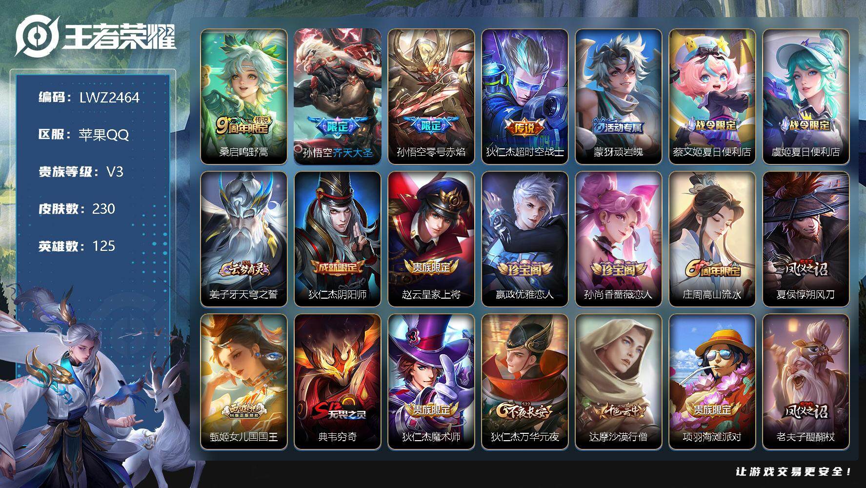[12339610]【特价急出/详情看图】:苹果Q-V3-至尊星耀II段位-125英雄-230皮肤-4传说-49史诗 【英雄全皮】:蒙恬全皮 【传说皮肤】:桑启鸣野蒿,孙悟空齐天大圣,孙悟空零号赤焰,狄仁杰超时空战士 【限定皮肤】:蒙犽顽岩魄,蔡文姬夏日便利店,虞姬夏日便利店,姜子牙天穹之誓,狄仁杰阴阳师,赵云皇家上将,嬴政优雅恋人,孙尚香蔷薇恋人,庄周高山流水,夏侯惇朔风刀,甄姬女儿国国王,典韦穷奇,狄仁杰魔术师,狄仁杰万华元夜,达摩沙漠行僧,项羽海滩派对,老夫子醍醐杖,程咬金演武夺筹,兰陵王金庭之子,孙悟空零号赤焰,孙悟空孙行者,孙悟空齐天大圣,牛魔御旌,李元芳云中旅人,钟馗驱傩正仪,干将莫邪胡桃夹子,鬼谷子原初探秘者,鬼谷子五谷丰年,苏烈千军破阵,百里玄策原初追逐者,弈星混沌棋,沈梦溪大漠名商,明世隐疑决卦,裴擒虎李小龙,裴擒虎擒涛扼浪,狂铁御狮,米莱狄御霄,云中君纤云弄巧,盾山御銮,猪八戒猪悟能,嫦娥拒霜思,鲁班大师探海日志,桑启海盐诗旅,阿古朵江河有灵,张良古海寻踪,蒙犽百解令,蒙恬荣光圣徽,鬼谷子天穹祈灯,沈梦溪龙舞盛年,刘邦剑破天穹,程咬金群星魔术团,镜青焰无极,项羽苍威无极,周瑜熔金海岸 【赛季限定】:夏侯惇朔风刀,典韦穷奇,狄仁杰万华元夜,达摩沙漠行僧,老夫子醍醐杖,程咬金演武夺筹,兰陵王金庭之子,张良古海寻踪,牛魔御旌,李元芳云中旅人,钟馗驱傩正仪,鬼谷子原初探秘者,苏烈千军破阵,百里玄策原初追逐者,弈星混沌棋,沈梦溪大漠名商,明世隐疑决卦,裴擒虎擒涛扼浪,狂铁御狮,米莱狄御霄,盾山御銮,鲁班大师探海日志,桑启海盐诗旅,鬼谷子天穹祈灯,蒙恬荣光圣徽,刘邦剑破天穹,姜子牙天穹之誓 【战令限定】:蔡文姬夏日便利店,虞姬夏日便利店,镜青焰无极,项羽苍威无极 【史诗皮肤】:阿轲暗夜猫娘,赵云皇家上将,赵云未来纪元,甄姬冰雪圆舞曲,狄仁杰魔术师,宫本武藏鬼剑武藏,孙尚香蔷薇恋人,孙尚香水果甜心,嬴政优雅恋人,嬴政摇滚巨星,妲己魅力维加斯,妲己女仆咖啡,墨子金属风暴,吕布圣诞狂欢,曹操幽灵船长,张飞乱世虎臣,花木兰水晶猎龙者,夏侯惇乘风破浪,小乔缤纷独角兽,兰陵王暗隐猎兽者,诸葛亮黄金分割率,雅典娜冰冠公主,安琪拉心灵骇客,百里守约特工魅影,蔡文姬舞动绿茵,刘禅天才门将,李元芳逐浪之夏,阿轲节奏热浪,孙策猫狗日记,狄仁杰鹰眼统帅,百里玄策原初追逐者,裴擒虎李小龙,云中君纤云弄