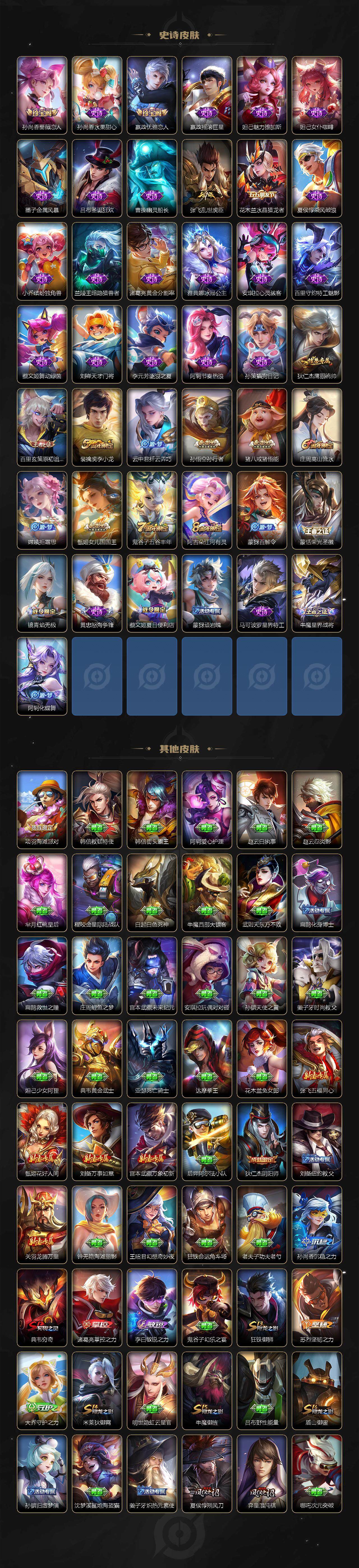 【史诗皮肤】:阿轲暗夜猫娘,赵云皇家上将,赵云未来纪元,甄姬冰雪圆舞曲,狄仁杰魔术师,宫本武藏鬼剑武藏,孙尚香蔷薇恋人,孙尚香水果甜心,嬴政优雅恋人,嬴政摇滚巨星,妲己魅力维加斯,妲己女仆咖啡,墨子金属风暴,吕布圣诞狂欢,曹操幽灵船长,张飞乱世虎臣,花木兰水晶猎龙者,夏侯惇乘风破浪,小乔缤纷独角兽,兰陵王暗隐猎兽者,诸葛亮黄金分割率,雅典娜冰冠公主,安琪拉心灵骇客,百里守约特工魅影,蔡文姬舞动绿茵,刘禅天才门将,李元芳逐浪之夏,阿轲节奏热浪,孙策猫狗日记,狄仁杰鹰眼统帅,百里玄策原初追逐者,裴擒虎李小龙,云中君纤云弄