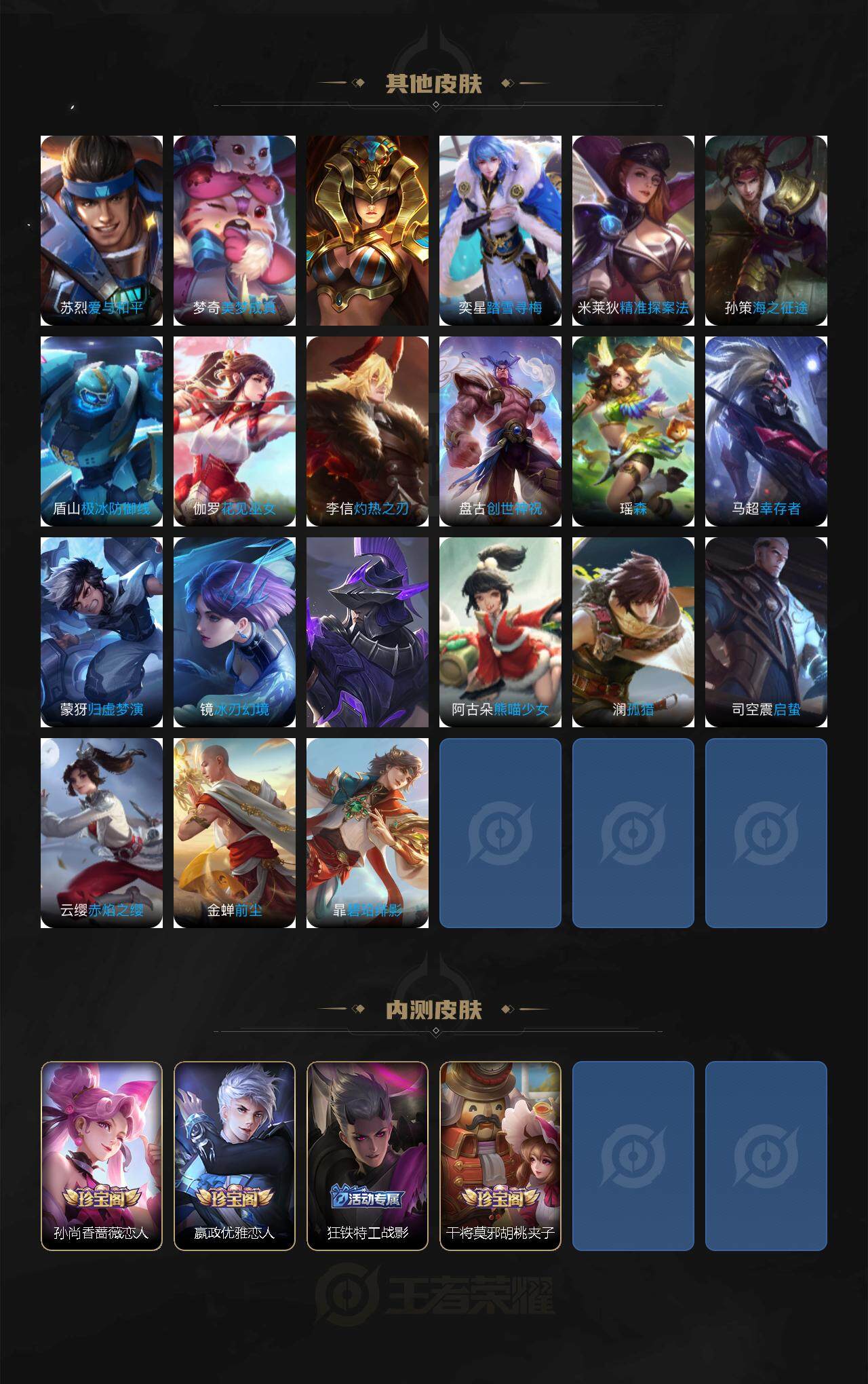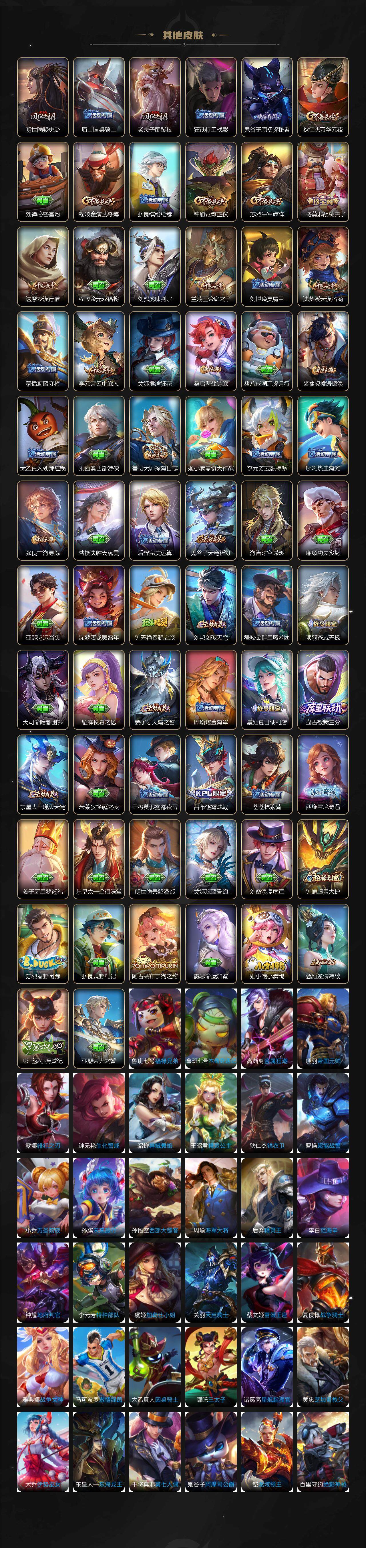 【限定皮肤】:蒙犽顽岩魄,蔡文姬夏日便利店,虞姬夏日便利店,姜子牙天穹之誓,狄仁杰阴阳师,赵云皇家上将,嬴政优雅恋人,孙尚香蔷薇恋人,庄周高山流水,夏侯惇朔风刀,甄姬女儿国国王,典韦穷奇,狄仁杰魔术师,狄仁杰万华元夜,达摩沙漠行僧,项羽海滩派对,老夫子醍醐杖,程咬金演武夺筹,兰陵王金庭之子,孙悟空零号赤焰,孙悟空孙行者,孙悟空齐天大圣,牛魔御旌,李元芳云中旅人,钟馗驱傩正仪,干将莫邪胡桃夹子,鬼谷子原初探秘者,鬼谷子五谷丰年,苏烈千军破阵,百里玄策原初追逐者,弈星混沌棋,沈梦溪大漠名商,明世隐疑决卦,裴擒虎李小龙,裴擒虎擒涛扼浪,狂铁御狮,米莱狄御霄,云中君纤云弄巧,盾山御銮,猪八戒猪悟能,嫦娥拒霜思,鲁班大师探海日志,桑启海盐诗旅,阿古朵江河有灵,张良古海寻踪,蒙犽百解令,蒙恬荣光圣徽,鬼谷子天穹祈灯,沈梦溪龙舞盛年,刘邦剑破天穹,程咬金群星魔术团,镜青焰无极,项羽苍威无极,周瑜熔金海岸