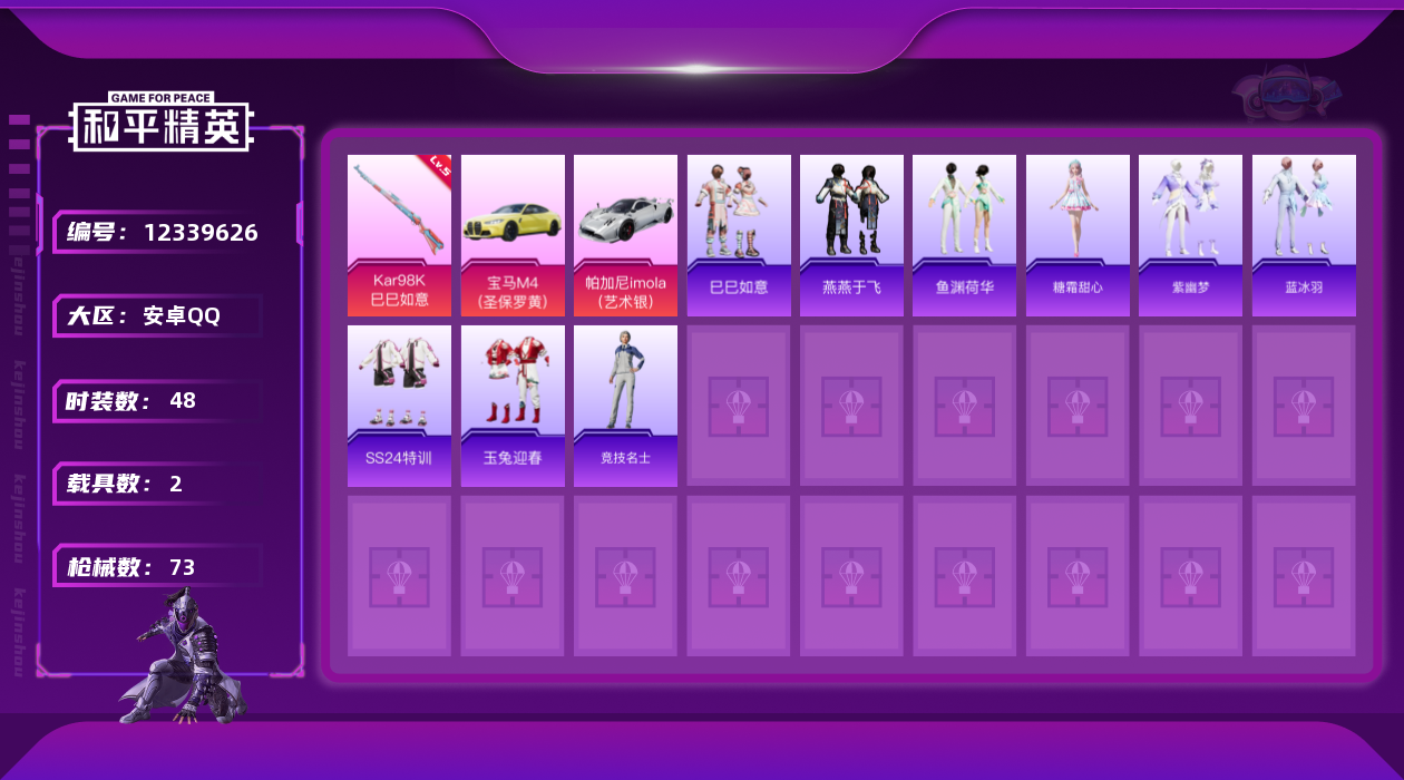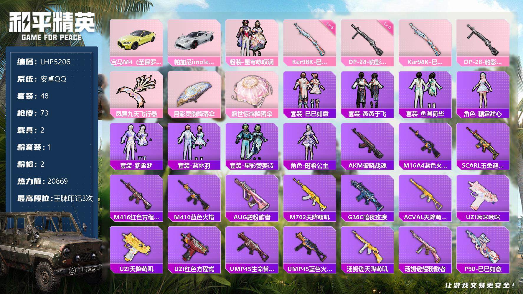 [12339626]【特价急出/详情看图】:安卓 手Q-1粉装-2特效枪-2载具-1粉色飞行器-2w热力值-3王牌印记-48套装-73枪皮【粉色载具】:宝马M4(圣保罗黄),帕加尼imola(艺术银)【粉色套装】:粉装-星穹咏叹调【粉色枪皮等级】:Kar98K-巳巳如意(五级),DP-28-豹影疾电(五级)【粉色飞行器】:凤舞九天飞行器