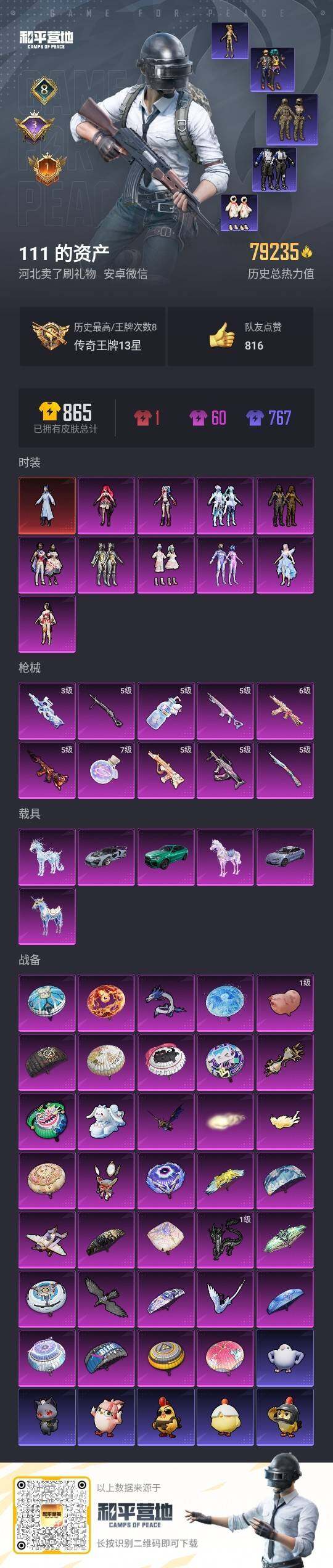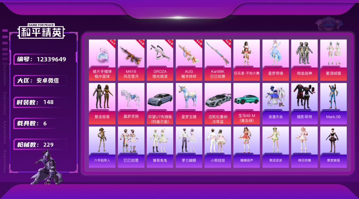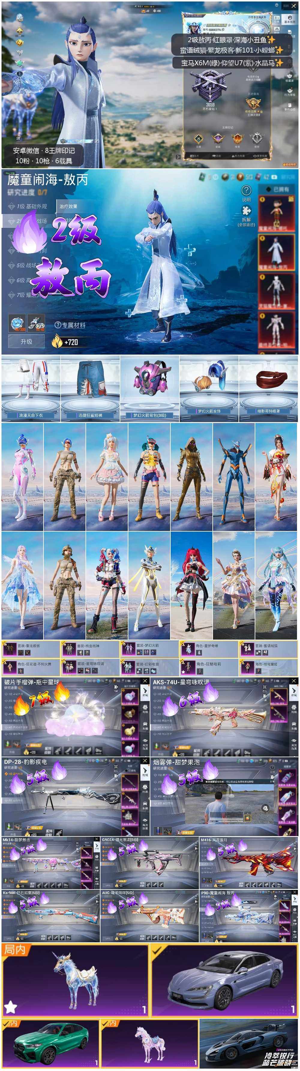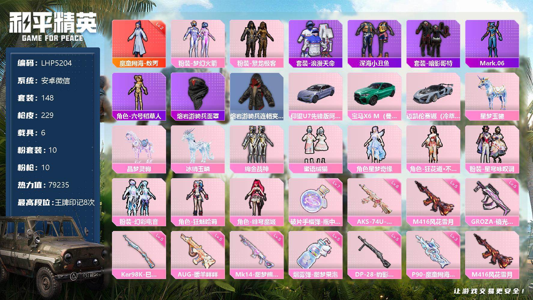 [12339649]素材身法号/地铁满天赋【特价急出/详情看图】:安卓 微信-1神装-10粉装-10特效枪-6载具-12粉色飞行器-7.9w热力值-8王牌印记-148套装-229枪皮【红色神装等级】:魔童闹海-敖丙(二级)【热门品类】:粉装-梦幻火箭,粉装-繁龙极客,套装-浪漫天命,套装-深海小丑鱼,套装-暗影哥特,角色-Mark.06,角色-六号稻草人,熔岩游骑兵面罩,熔岩游骑兵连帽夹克【粉色载具】:仰望U7(阿盖尔紫),宝马X6 M(曼岛绿),迈凯伦塞纳(冷萃蓝),星梦玉骢,晶梦灵驹,冰绡玉鳞【粉色套装】:粉装-梦幻火箭,粉装-绚金战神,粉装-繁龙极客,粉装-蜜语绒猫,角色-星梦奇缘,角色-狂花道·不知火舞,粉装-星穹咏叹调,粉装-幻彩电音,角色-狂魅哈莉,角色-绯穹魔姬【粉色枪皮等级】:M416-风花雪月(五级),GROZA-镜光银凌(五级),AUG-暖羊咩咩(五级),AKS-74U-星穹咏叹调(六级),P90-魔童闹海 敖丙(三级),Kar98K-巳巳如意(五级),Mk14-甜梦熊击(五级),DP-28-豹影疾电(五级),烟雾弹-甜梦果泡(五级),破片手榴弹-瓶中星球(七级)【粉色飞行器】:齐天大圣飞行器,萌物绒绒飞行器,繁龙极客飞行器,龙翔九天飞行器,星梦奇缘飞行器,英伦信使飞行器,月下星之子飞行器,绯果甜心飞行器,雀灵庇佑飞行器,时光之吻飞行器,飞天猪飞行器,灵珠游龙飞行器