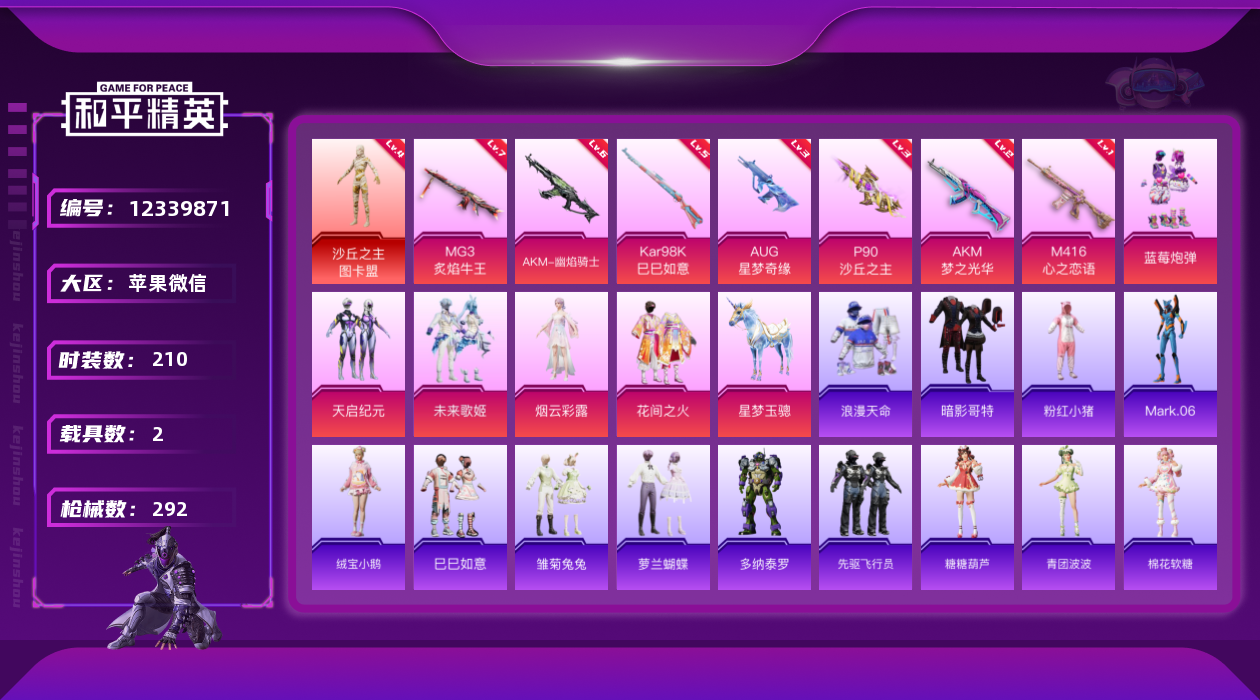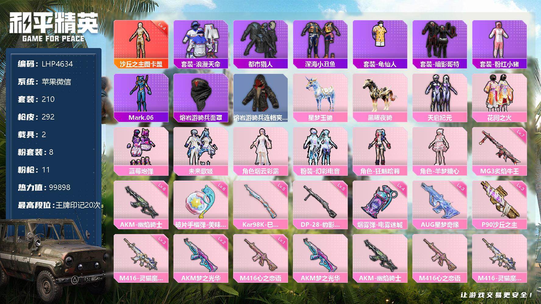 [12339871]素材身法号/沙丘之主-图卡盟(四级)/地铁满天赋【特价急出/详情看图】:苹果 微信-1神装-8粉装-11特效枪-2载具-9粉色飞行器-9.9w热力值-20王牌印记-210套装-292枪皮【红色神装等级】:沙丘之主-图卡盟(四级)【热门品类】:套装-浪漫天命,套装-都市猎人,套装-深海小丑鱼,套装-龟仙人,套装-暗影哥特,套装-粉红小猪,角色-Mark.06,熔岩游骑兵面罩,熔岩游骑兵连帽夹克【粉色载具】:星梦玉骢,黑曜夜骑【粉色套装】:粉装-天启纪元,粉装-花间之火,粉装-蓝莓炮弹,粉装-未来歌姬,角色-烟云彩露,粉装-幻彩电音,角色-狂魅哈莉,角色-羊梦糖心【粉色枪皮等级】:AKM-梦之光华(二级),AKM-幽焰骑士(六级),M416-心之恋语(一级),M416-灵猫魔法师(三级),AUG-星梦奇缘(三级),P90-沙丘之主(三级),Kar98K-巳巳如意(五级),DP-28-豹影疾电(五级),MG3-炙焰牛王(七级),烟雾弹-电雾迷城(四级),破片手榴弹-美味星星糖(六级)【粉色飞行器】:星之彼岸飞行器,沙丘之主天马,花傲天飞行器,冠军兔兔飞行器,幽焰列车飞行器,脆鲨七海飞行器,凤舞九天飞行器,万象金身飞行器,灵猫魔法师飞行器