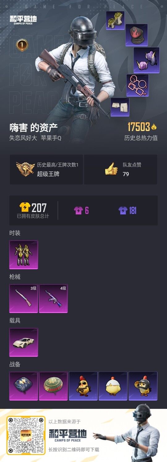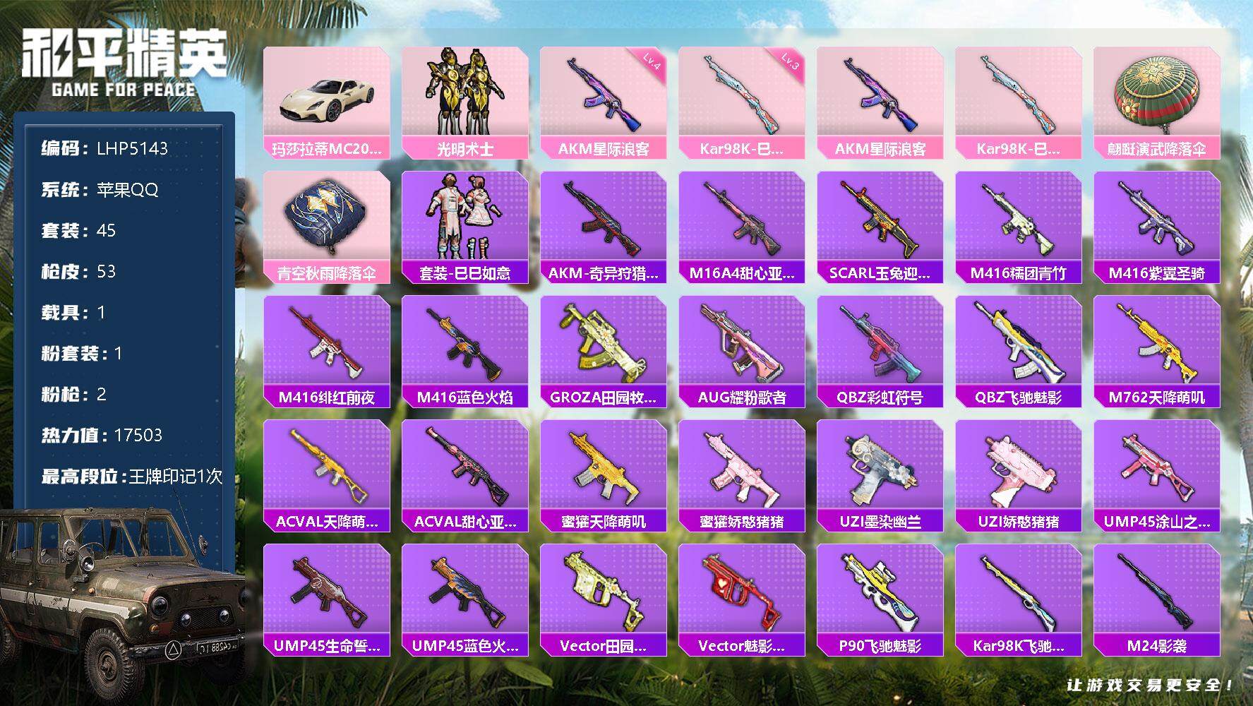 [12339960]【特价急出/详情看图】:苹果 手Q-1粉装-2特效枪-1载具-1.7w热力值-1王牌印记-45套装-53枪皮【粉色载具】:玛莎拉蒂MC20(星石白)【粉色套装】:粉装-光明术士【粉色枪皮等级】:AKM-星际浪客(四级),Kar98K-巳巳如意(三级)
