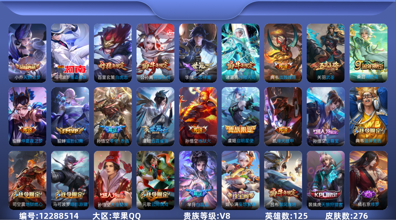 - [11411898]V8 2典藏 1无双 1珍品传说 23传说 125英雄 338皮肤 可修改实名 优质装备:天鹅之梦(小乔典藏),神鉴启示录,小乔时之魔女(小乔无双),冠军飞将,仲夏夜之梦(大飞蛾),音你心动-小乔,飞鸢探春,音你心动-周瑜,乞巧织情,游龙清影(小青龙),挚爱花嫁,无双飞将,山海·琳琅生(小乔年限),朵莉亚心动手记 珍品传说:兔狲·蓬尾 传说皮:幻光神枪 珍宝阁皮:妄想食味,胡桃夹子,优雅恋人 限定皮:愿照·岁时盈(虞姬年限),愿照·众生和(妲己年限),愿照·千秋盛(女娲年限),逐霄战戟,鸣野蒿,武陵仙君(小桃花),异界灵契(白毛香),补天,寅虎·展翼(孙膑年限),白鹤梁神女,遇见飞天,高山流水,五谷丰年,天狼运算者,梁祝,天狼溯光者,李小龙,霸王别姬-虞姬,纯白花嫁,冰霜恋舞曲,匿光追影者,女儿国国王,寅虎·瑞焰(虎皮蛋子),寅虎·心曲(虎婆),寅虎·赤拳(老虎年限),百木心枪,玉兔公主,深海之息(深海大菠萝),唐三藏,匿光启智者 史诗皮:鸭鸭历险记-刘禅,化蝶舞,龙之律动,石田雨龙,百相守梦-周瑜,茶境仙,怒海争锋,芈月浮光幕影,海诺心动手记,琥珀纪元伽罗,蔬乡物语(鲁班七号),乘龙·聚宝船(安琪拉年限),乘龙·忆丹青(大乔年限),百相守梦-百里守约,百相守梦-黄忠,紫霞仙子,苍穹之光,电玩小子(小书包),特工魅影,千年之狐,永昼,江河有灵,百解令(蒙犽),高渐离燃音魔法,蒙恬荣光圣徽,冰冠公主,青蛇,偶像歌手,白蛇,暗夜猫娘,龙骑士(小龙虾),末日机甲-吕布,猫狗日记-孙策,乱世虎臣,节奏热浪,女仆咖啡,摇滚巨星,水果甜心,绅士熊喵,天才门将,星夜王子,心灵骇客,时之奇旅-安琪拉,功夫厨神,德古拉伯爵,暗隐猎兽者,幽灵船长,鬼剑武藏,暗渊魔法,心灵战警,乐园奇幻夜,舞动绿茵,地狱岩魂,纤云弄巧,繁星吟游(呼啦呼啦),拒霜思,缤纷独角兽,乘风破浪,逐浪之夏,月团寄思,水晶猎龙者,曙光守护者,箭羽风息,唤灵魅影,金属风暴,圣诞狂欢,圣诞恋歌,鹰眼统帅,魅力维加斯,黎明之约,天秀·音浪,千筹问战,无心,未来纪元-赵云
