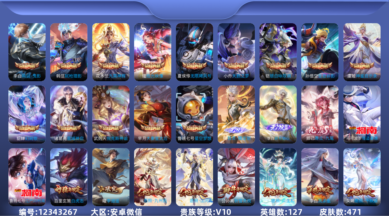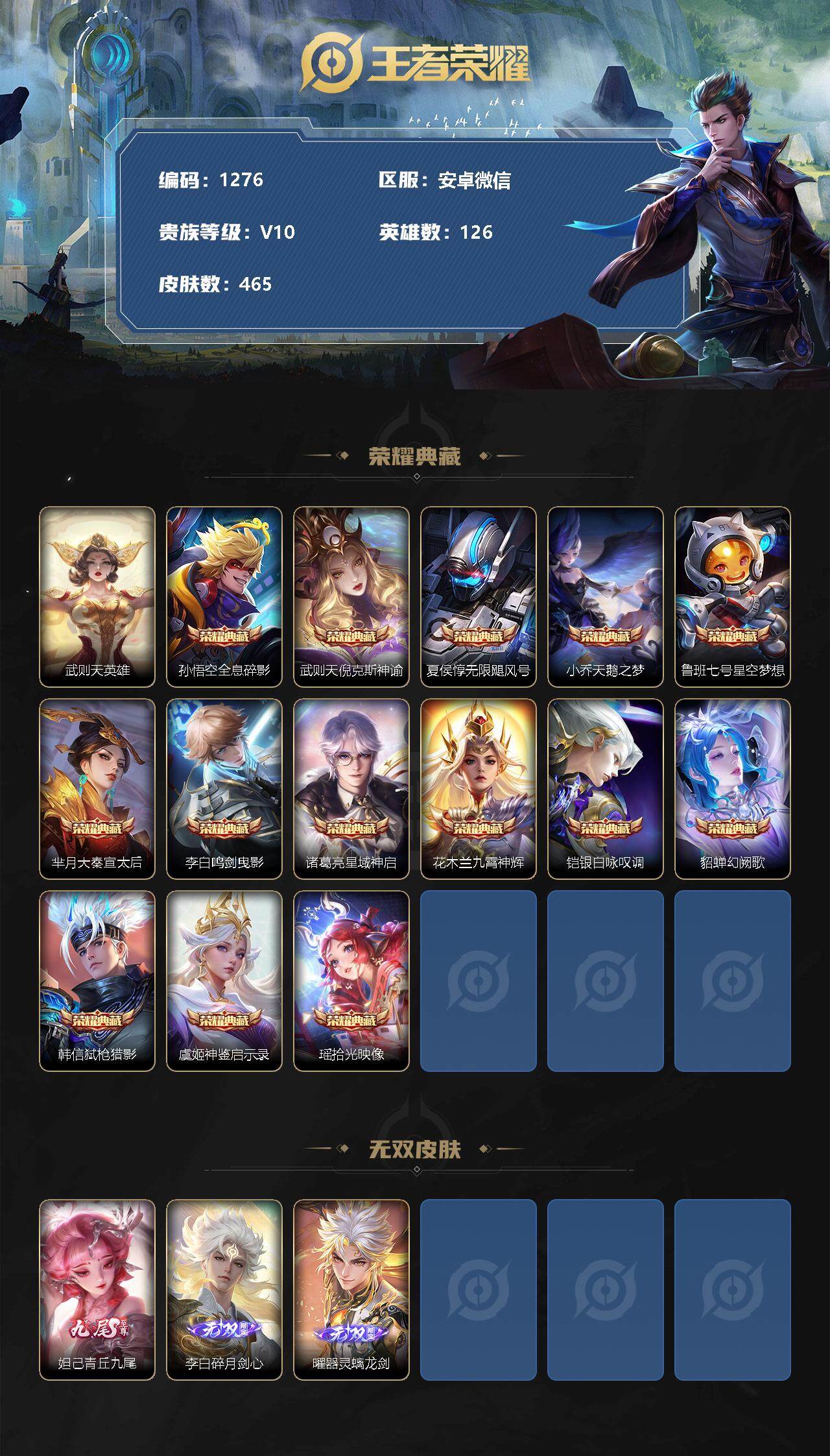 [12343267]【商品标题】:安卓WX-V10-至尊星耀II段位-126英雄-465皮肤-14典藏-0珍品无双-3无双-2珍品传说-82传说-142史诗