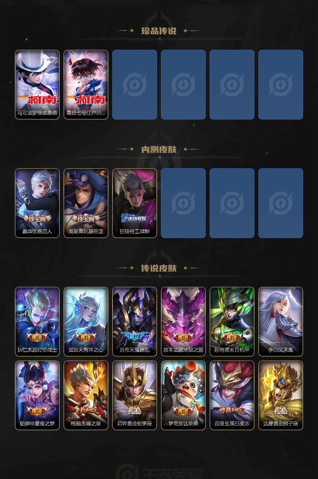 【荣耀典藏】:武则天英雄,孙悟空全息碎影,武则天倪克斯神谕,夏侯惇无限飓风号,小乔天鹅之梦,鲁班七号星空梦想,芈月大秦宣太后,李白鸣剑曳影,诸葛亮星域神启,花木兰九霄神辉,铠银白咏叹调,貂蝉幻阙歌,韩信弑枪猎影,虞姬神鉴启示录,瑶拾光映像