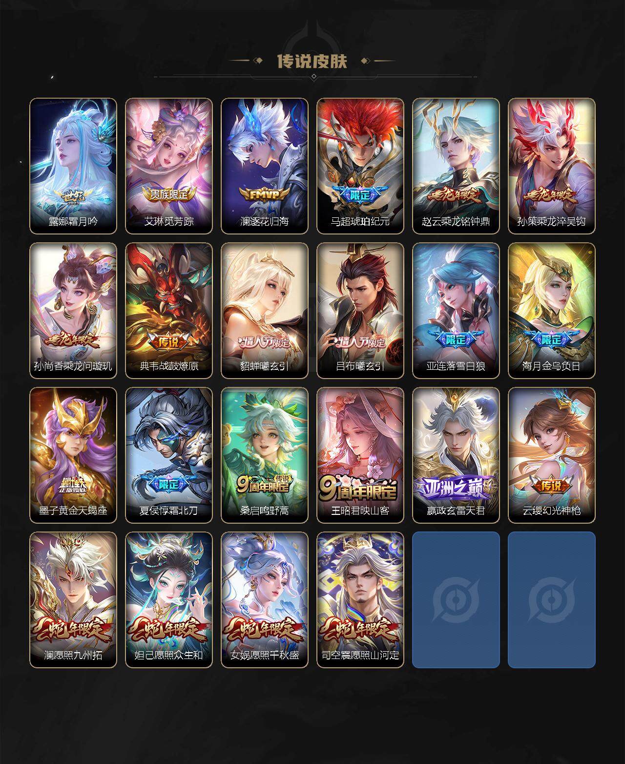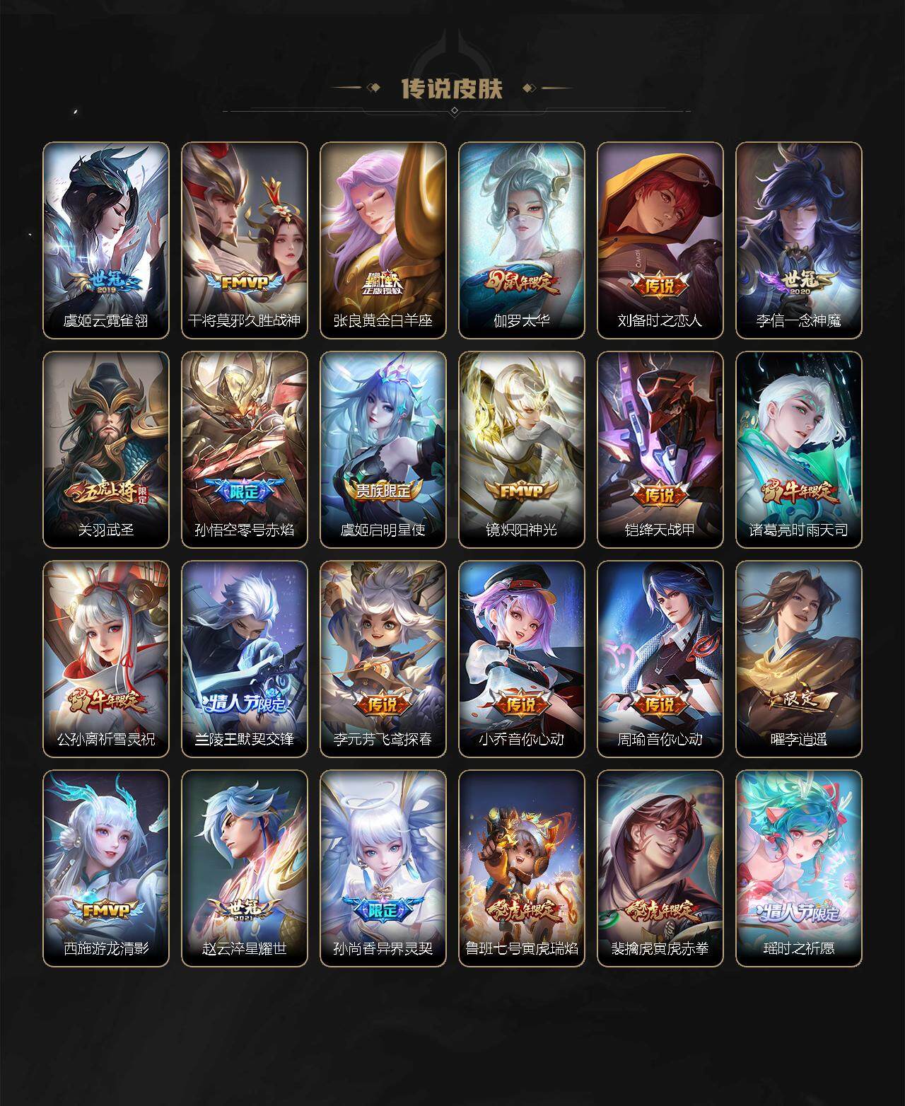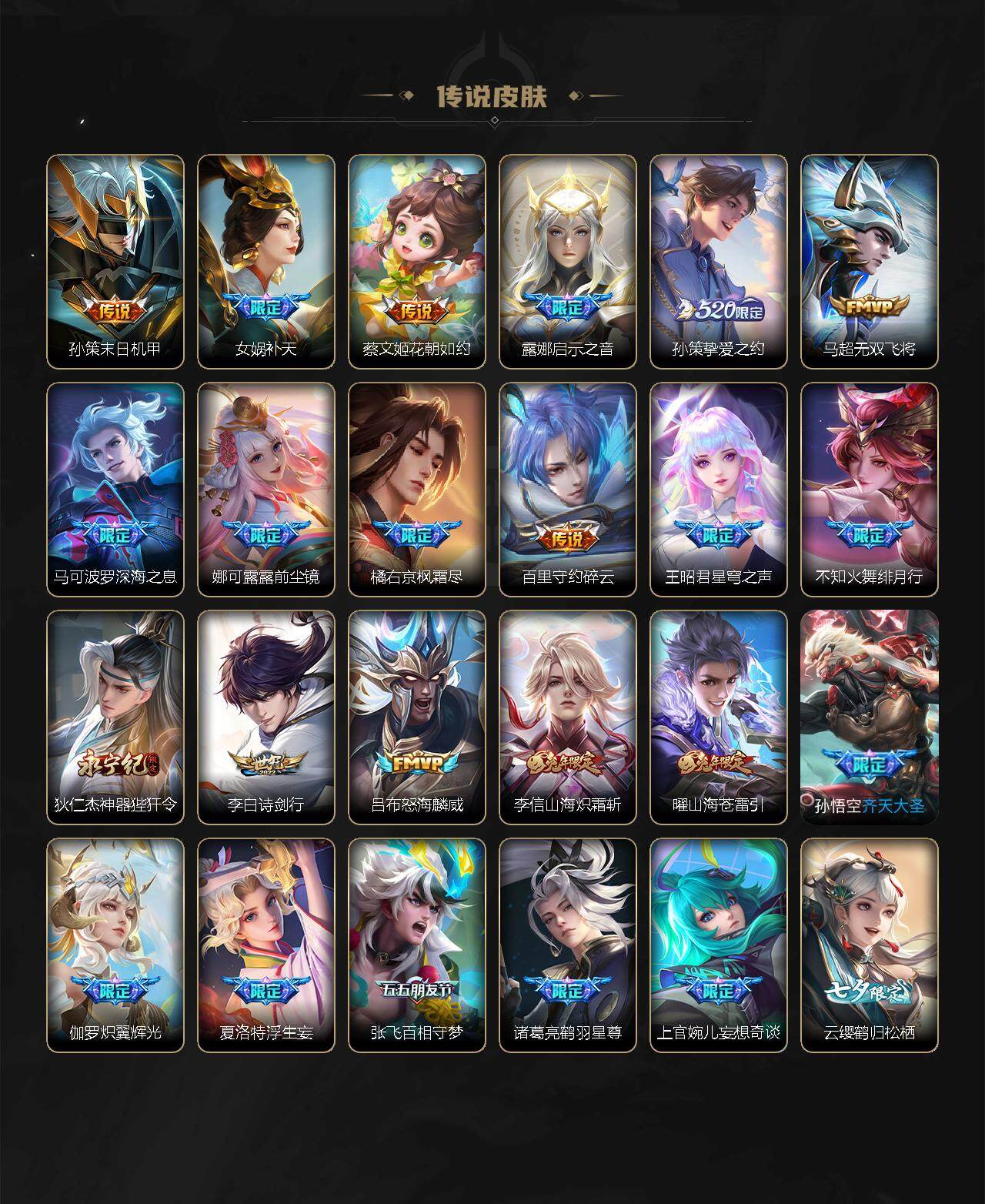 【传说皮肤】:司空震愿照山河定,女娲愿照千秋盛,妲己愿照众生和,澜愿照九州拓,云缨幻光神枪,嬴政玄雷天君,王昭君映山客,桑启鸣野蒿,夏侯惇霜北刀,墨子黄金天蝎座,海月金乌负日,亚连落雪白狼,吕布曦玄引,貂蝉曦玄引,典韦战鼓燎原,孙尚香乘龙问璇玑,孙策乘龙淬吴钩,赵云乘龙铭钟鼎,马超琥珀纪元,澜逐花归海,艾琳觅芳踪,露娜霜月吟,云缨鹤归松栖,上官婉儿妄想奇谈,诸葛亮鹤羽星尊,张飞百相守梦,夏洛特浮生妄,伽罗炽翼辉光,孙悟空齐天大圣,曜山海苍雷引,李信山海炽霜斩,吕布怒海麟威,李白诗剑行,狄仁杰神器狴犴令,不知火舞绯月行,王昭君星穹之声,百里守约碎云,橘右京枫霜尽,娜可露露前尘镜,马可波罗深海之息,马超无双飞将,孙策挚爱之约,露娜启示之音,蔡文姬花朝如约,女娲补天,孙策末日机甲,瑶时之祈愿,裴擒虎寅虎赤拳,鲁班七号寅虎瑞焰,孙尚香异界灵契,赵云淬星耀世,西施游龙清影,曜李逍遥 ,周瑜音你心动,小乔音你心动,李元芳飞鸢探春,兰陵王默契交锋,公孙离祈雪灵祝,诸葛亮时雨天司,铠绛天战甲,镜炽阳神光,虞姬启明星使,孙悟空零号赤焰,关羽武圣,李信一念神魔,刘备时之恋人,伽罗太华,张良黄金白羊座,干将莫邪久胜战神,虞姬云霓雀翎,达摩黄金狮子座,百里玄策白虎志,梦奇胖达荣荣,后羿黄金射手座,杨戬永曜之星,貂蝉仲夏夜之梦,李白凤求凰,孙尚香末日机甲,宫本武藏地狱之眼,吕布天魔缭乱,武则天海洋之心,狄仁杰超时空战士