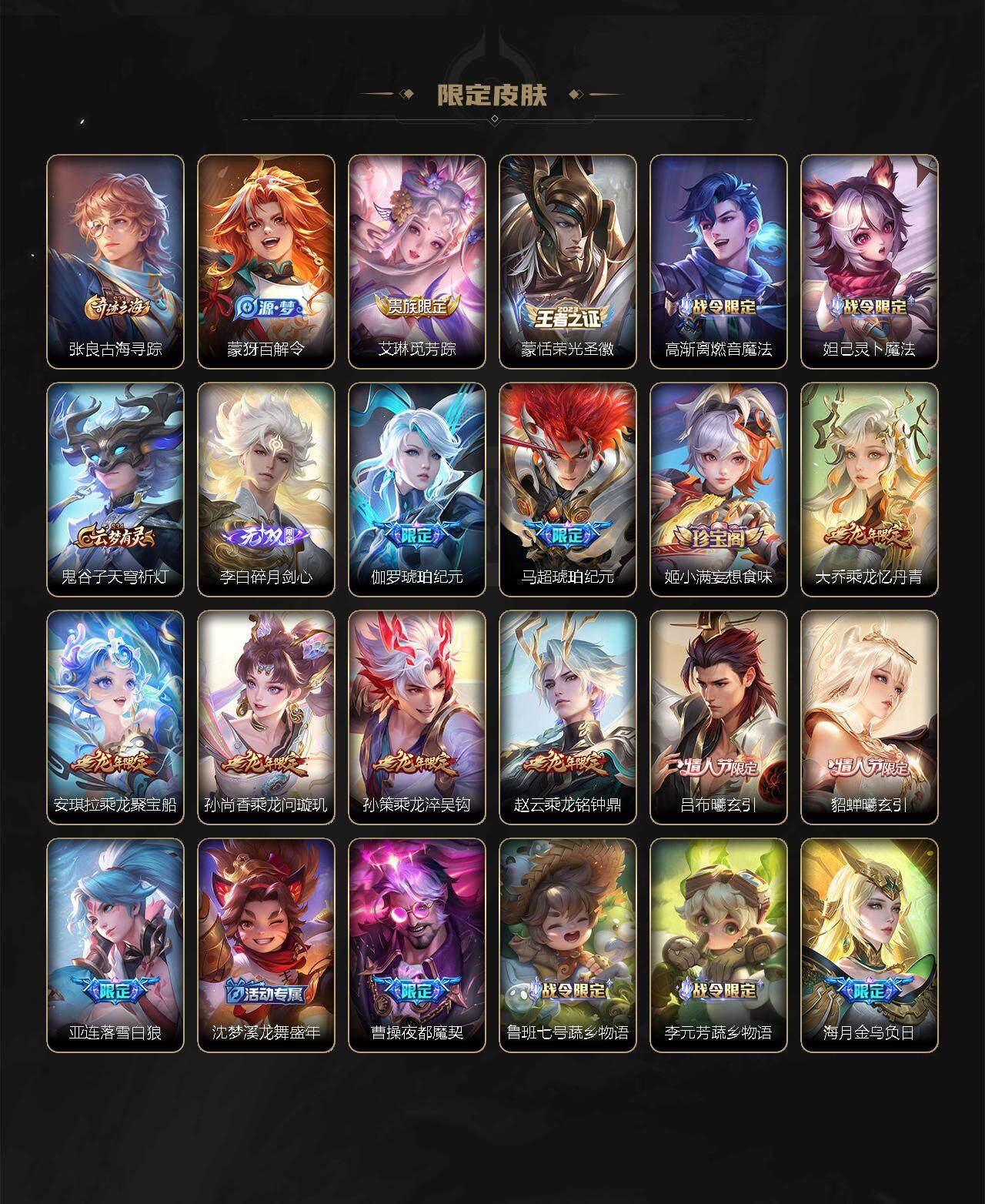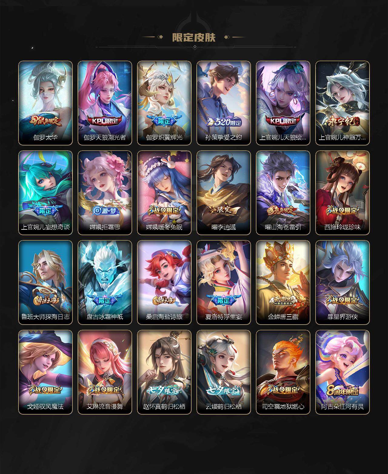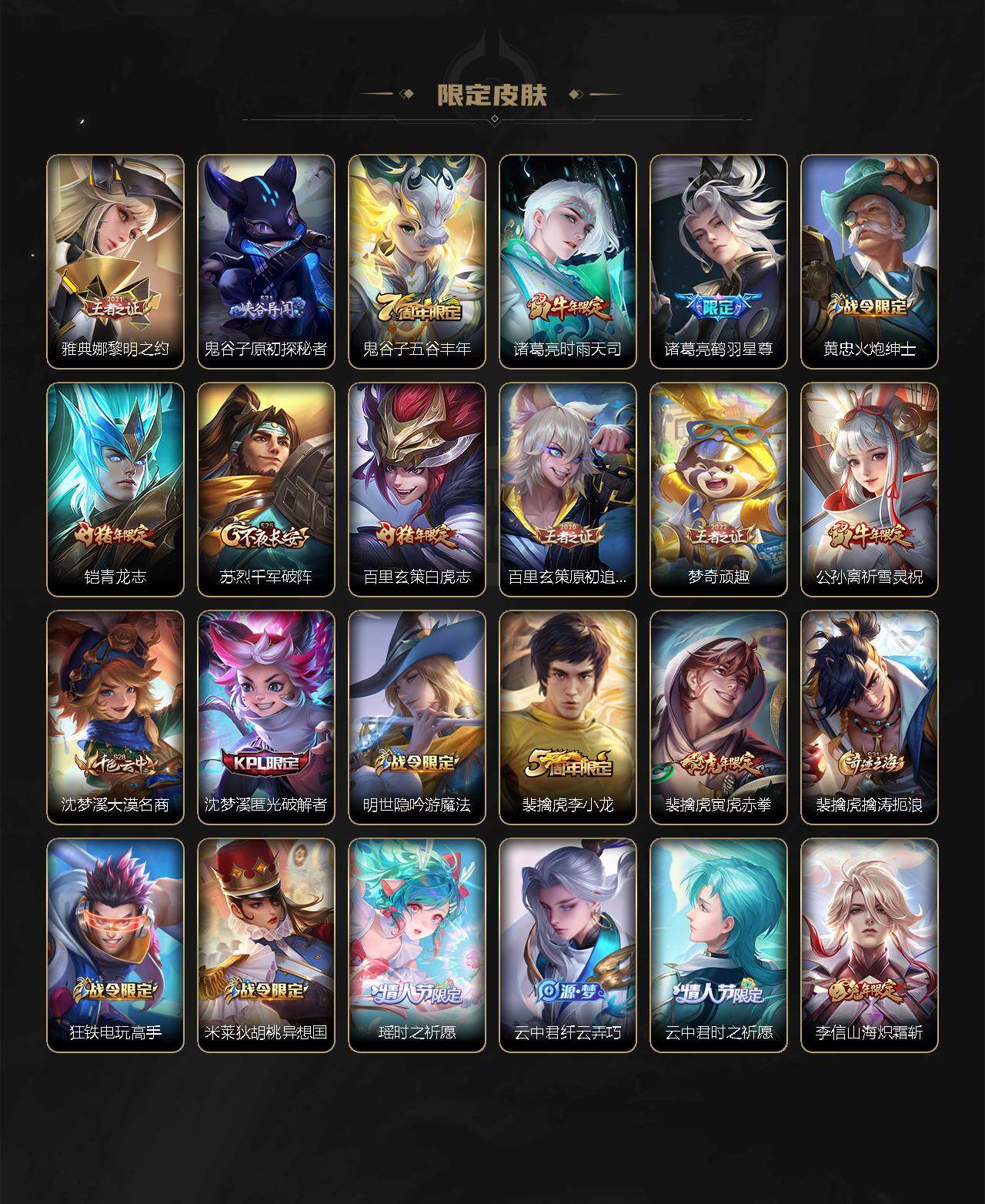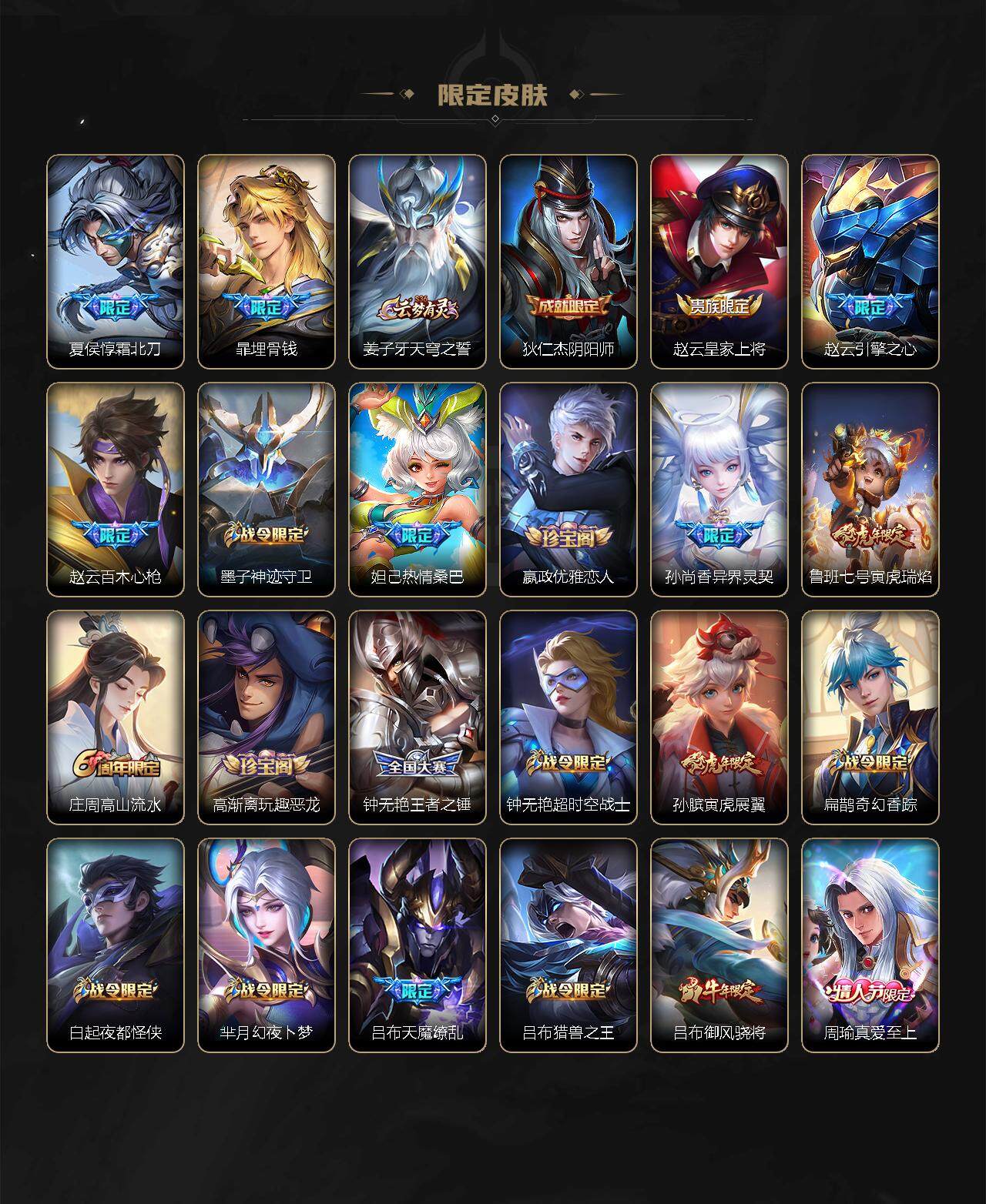 【限定皮肤】:夏侯惇霜北刀,暃埋骨钱,姜子牙天穹之誓,狄仁杰阴阳师,赵云皇家上将,赵云引擎之心,赵云百木心枪,墨子神迹守卫,妲己热情桑巴,嬴政优雅恋人,孙尚香异界灵契,鲁班七号寅虎瑞焰,庄周高山流水,高渐离玩趣恶龙,钟无艳王者之锤,钟无艳超时空战士,孙膑寅虎展翼,扁鹊奇幻香踪,白起夜都怪侠,芈月幻