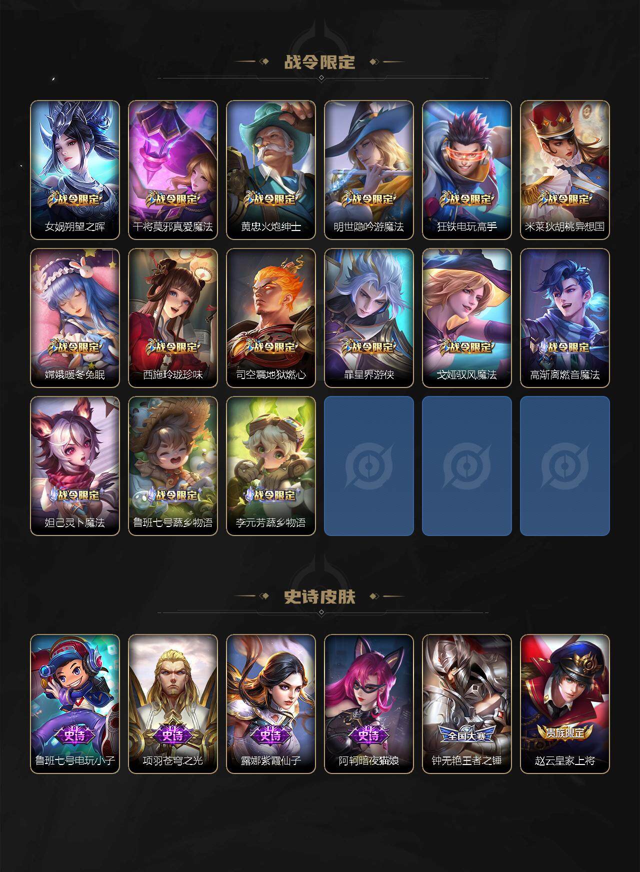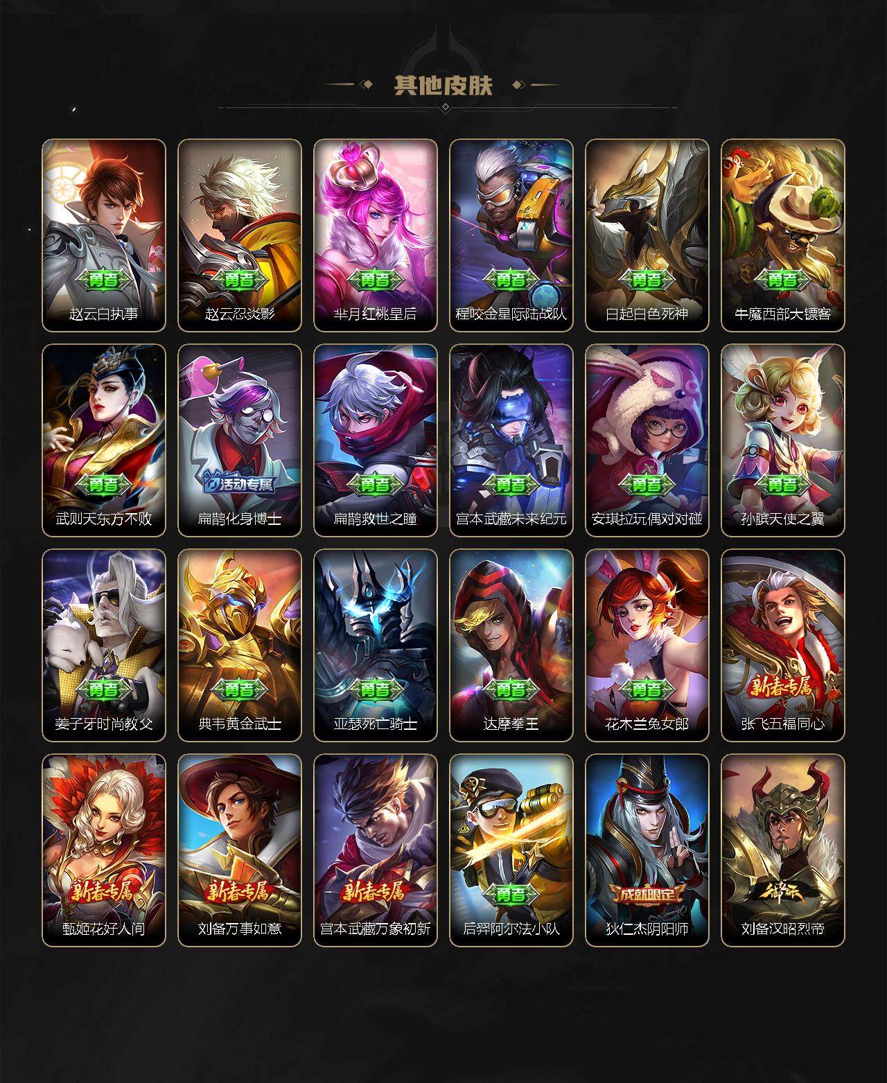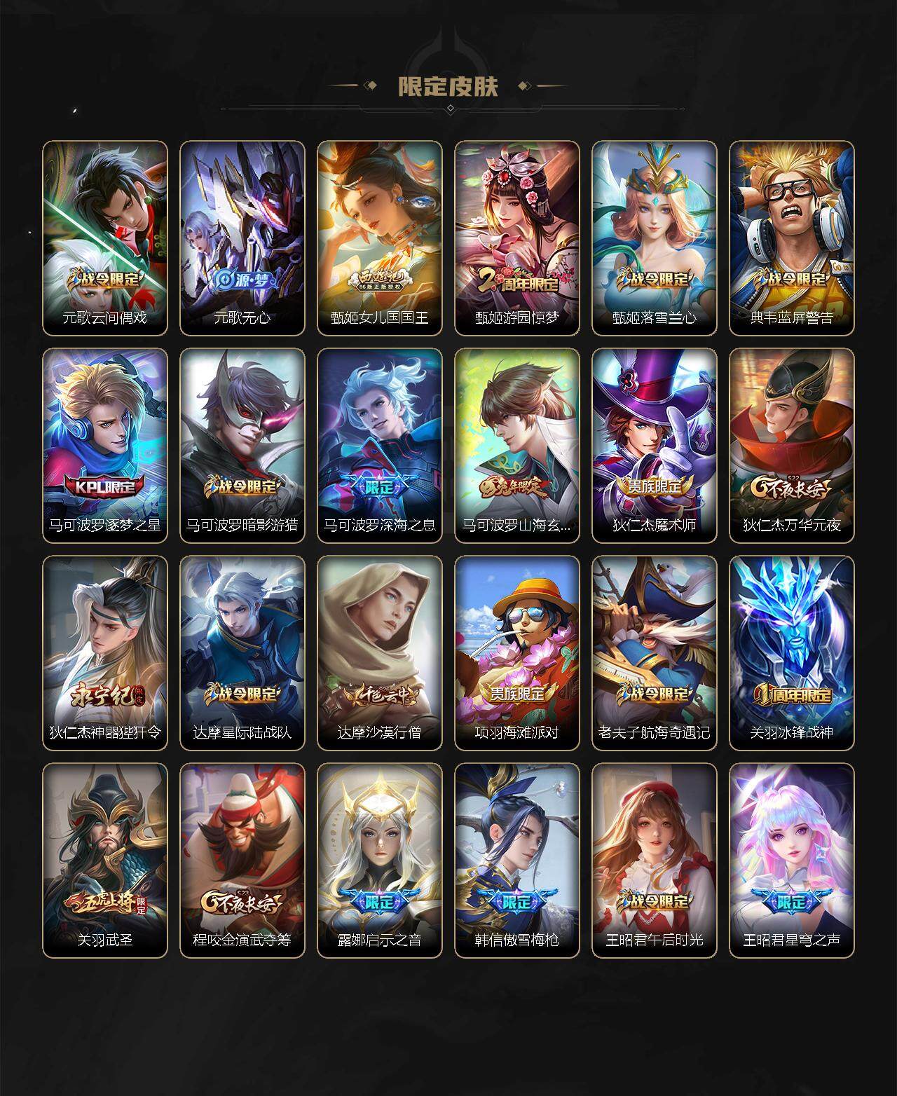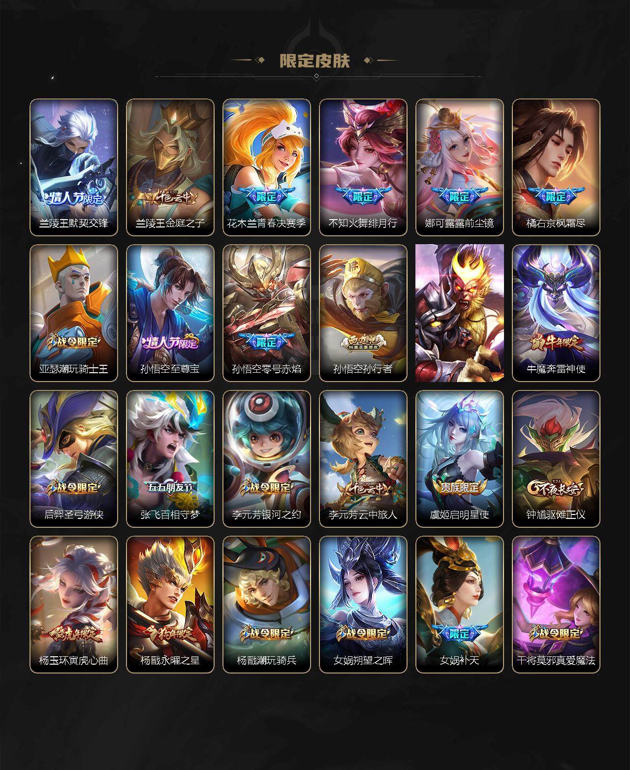 【限定皮肤】:夏侯惇霜北刀,暃埋骨钱,姜子牙天穹之誓,狄仁杰阴阳师,赵云皇家上将,赵云引擎之心,赵云百木心枪,墨子神迹守卫,妲己热情桑巴,嬴政优雅恋人,孙尚香异界灵契,鲁班七号寅虎瑞焰,庄周高山流水,高渐离玩趣恶龙,钟无艳王者之锤,钟无艳超时空战士,孙膑寅虎展翼,扁鹊奇幻香踪,白起夜都怪侠,芈月幻