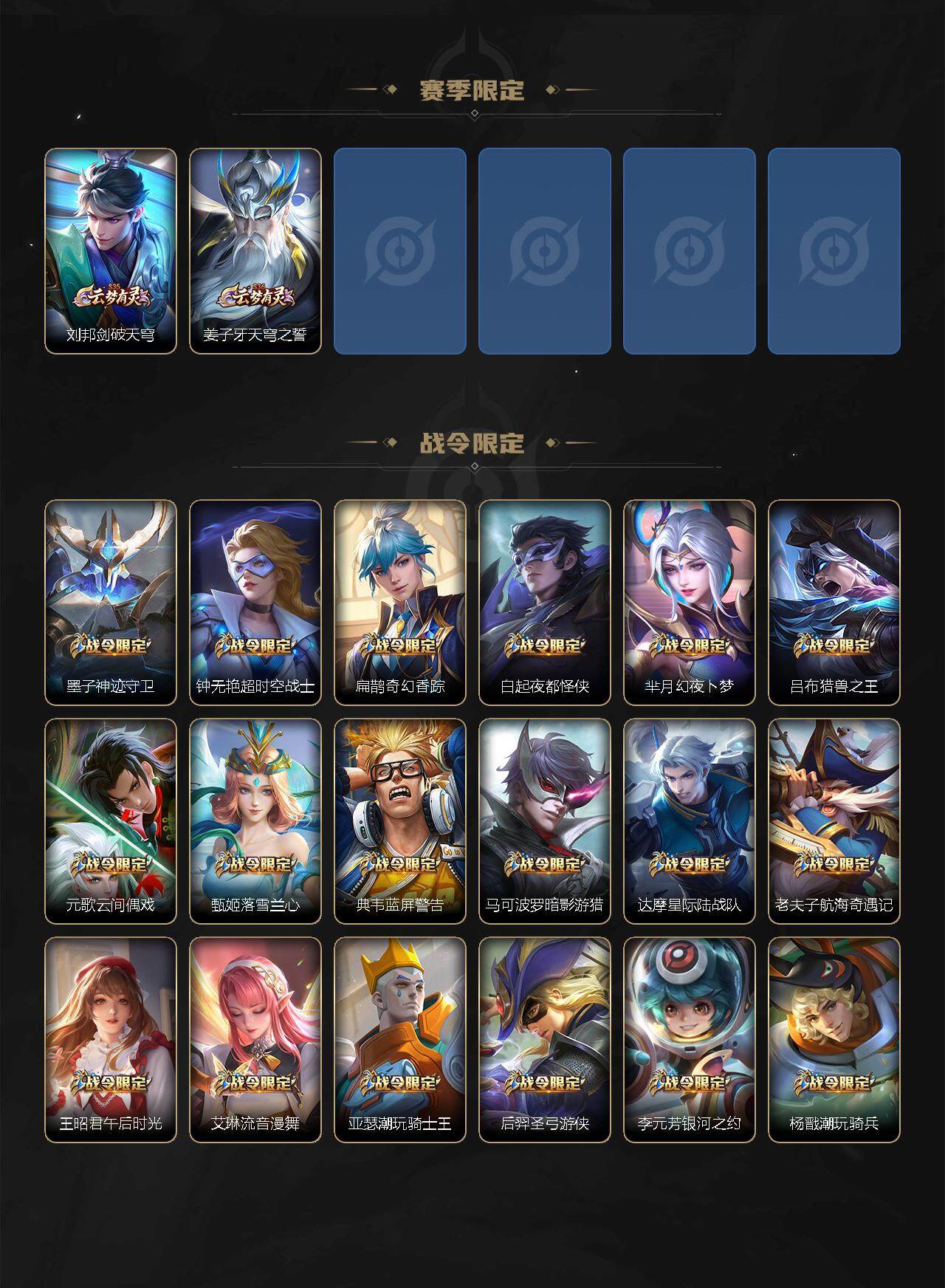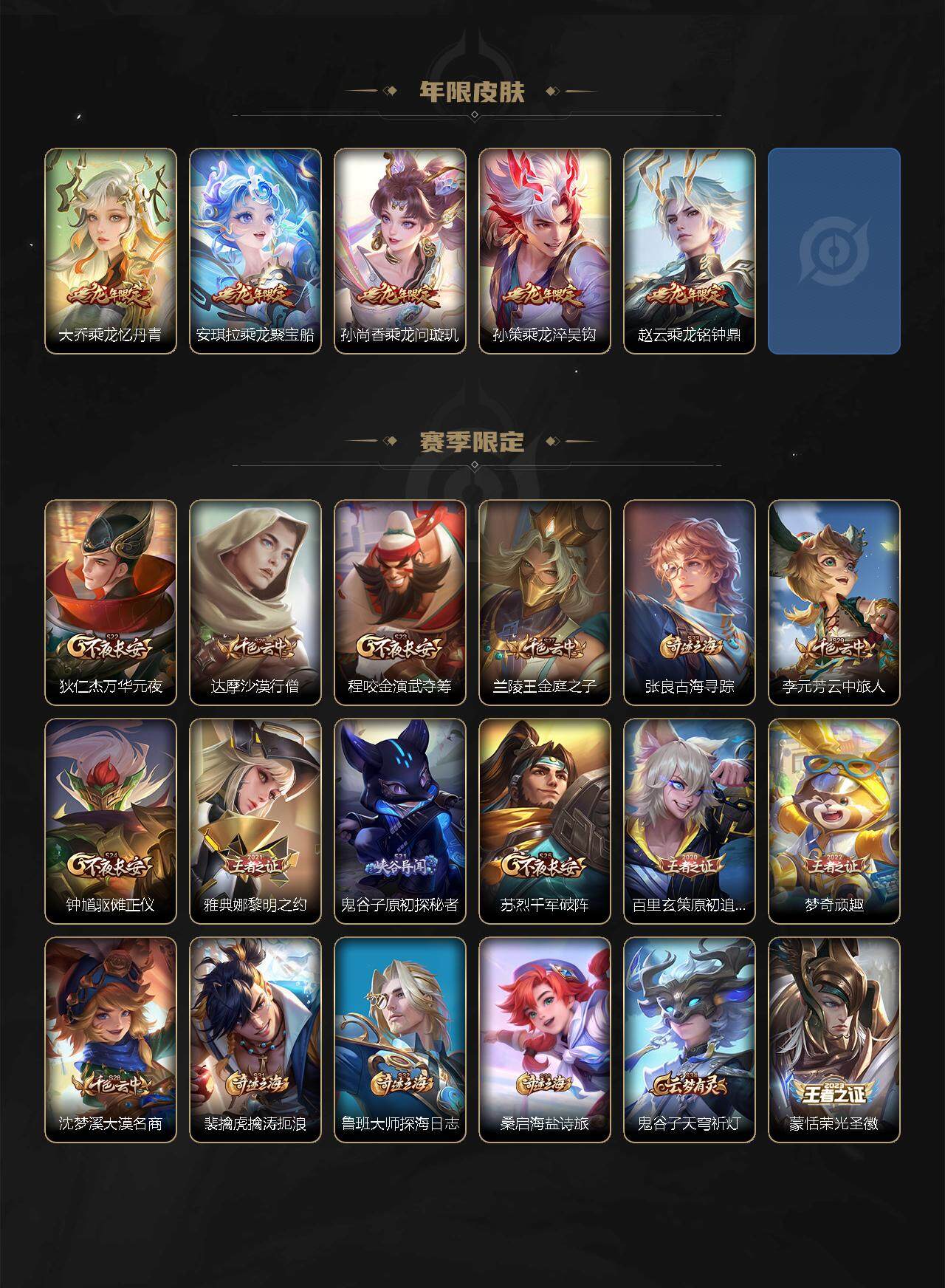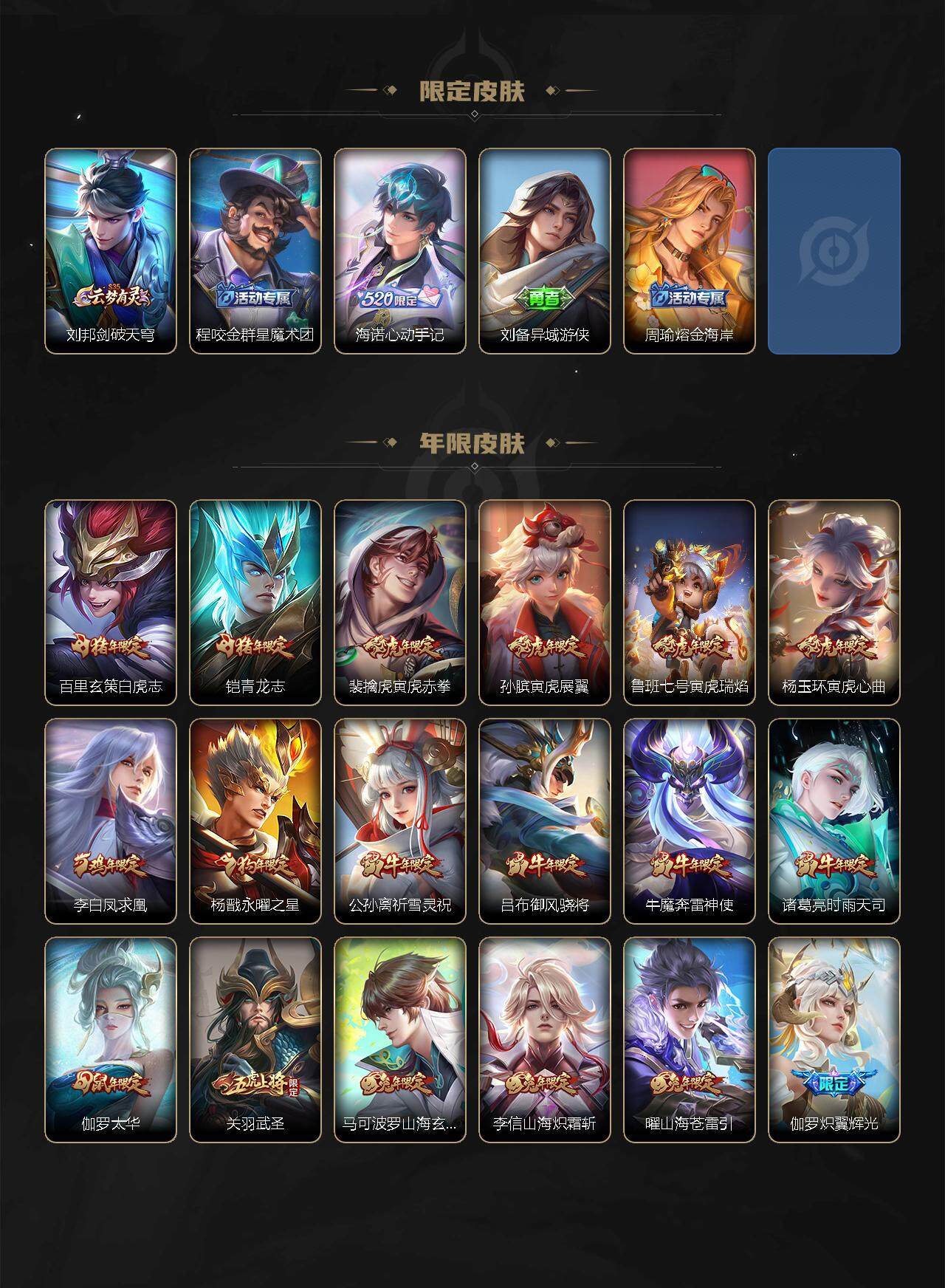 关羽冰锋战神,裴擒虎李小龙,牛魔奔雷神使,公孙离祈雪灵祝,吕布御风骁将,诸葛亮时雨天司,关羽武圣,伽罗太华,上官婉儿天狼绘梦者,伽罗天狼溯光者,马可波罗逐梦之星,铠青龙志,百里玄策白虎志,周瑜真爱至上,兰陵王默契交锋,孙悟空至尊宝,妲己热情桑巴,花木兰青春决赛季,赵云引擎之心,孙尚香异界灵契,孙悟空孙行者,甄姬女儿国国王,韩信傲雪梅枪,鲁班七号寅虎·瑞焰,孙膑寅虎·展翼,杨玉环寅虎·心曲,裴擒虎寅虎·赤拳,云中君时之祈愿,瑶时之祈愿,女娲补天,赵云百木心枪,露娜启示之音,马可波罗深海之息,金蝉唐三藏,娜可露露前尘镜,橘右京枫霜尽,王昭君星穹之声,不知火舞绯月行,上官婉儿神器·万象笔,李白诗剑行,马可波罗山海·玄木吟,盘古冰霜神祇,夏侯惇霜北刀,桑启鸣野蒿,王昭君映山客,澜愿照·九州拓,司空震愿照·山河定,妲己愿照·众生和,女娲愿照·千秋盛