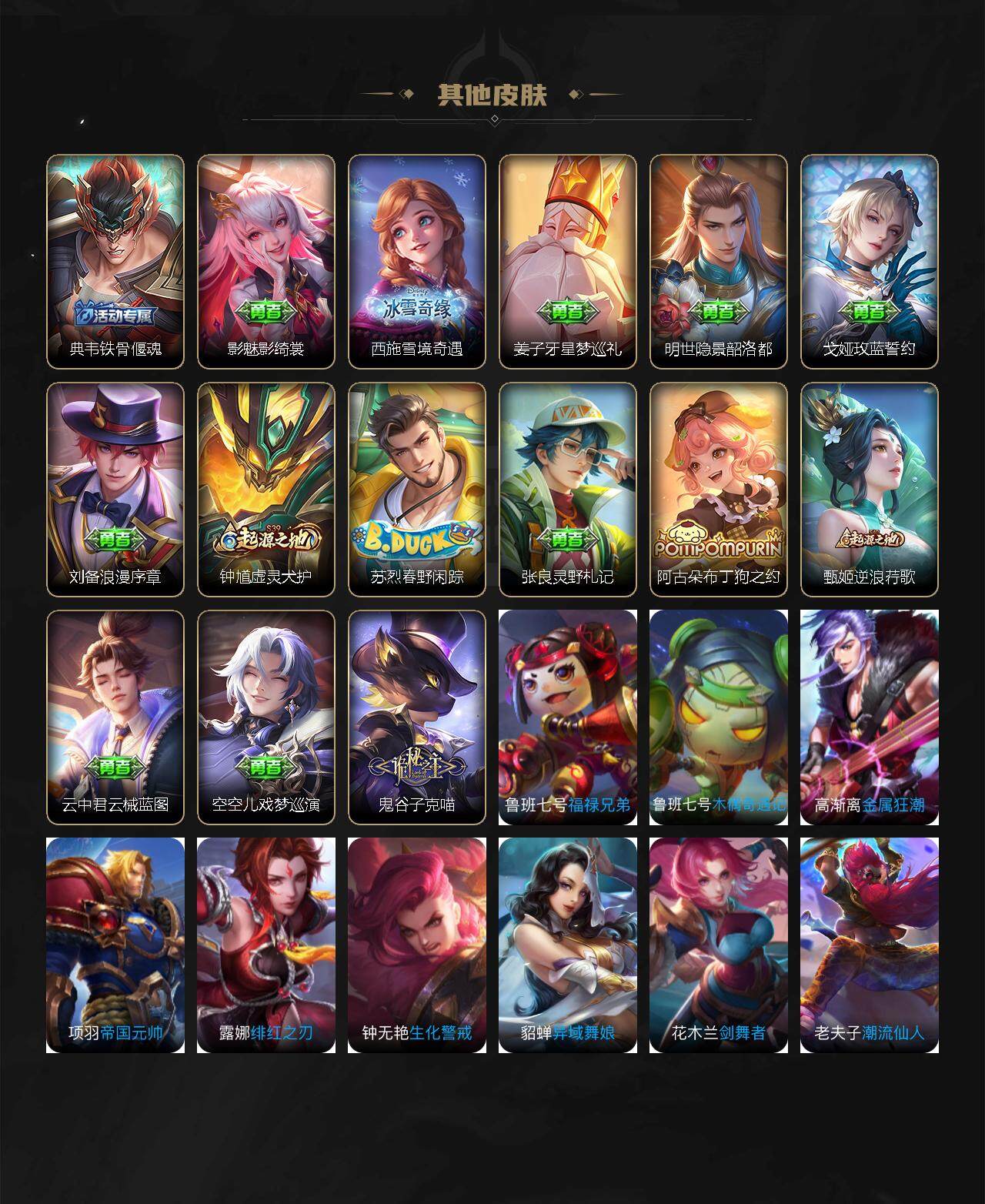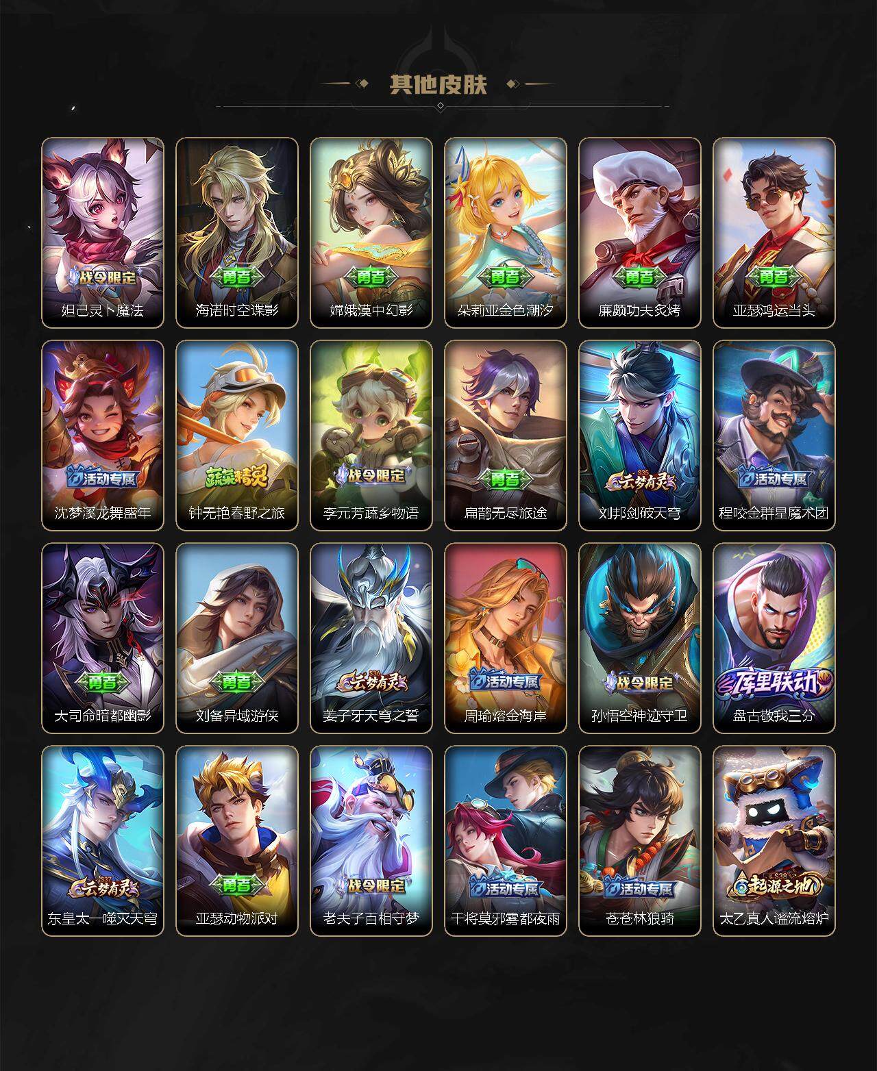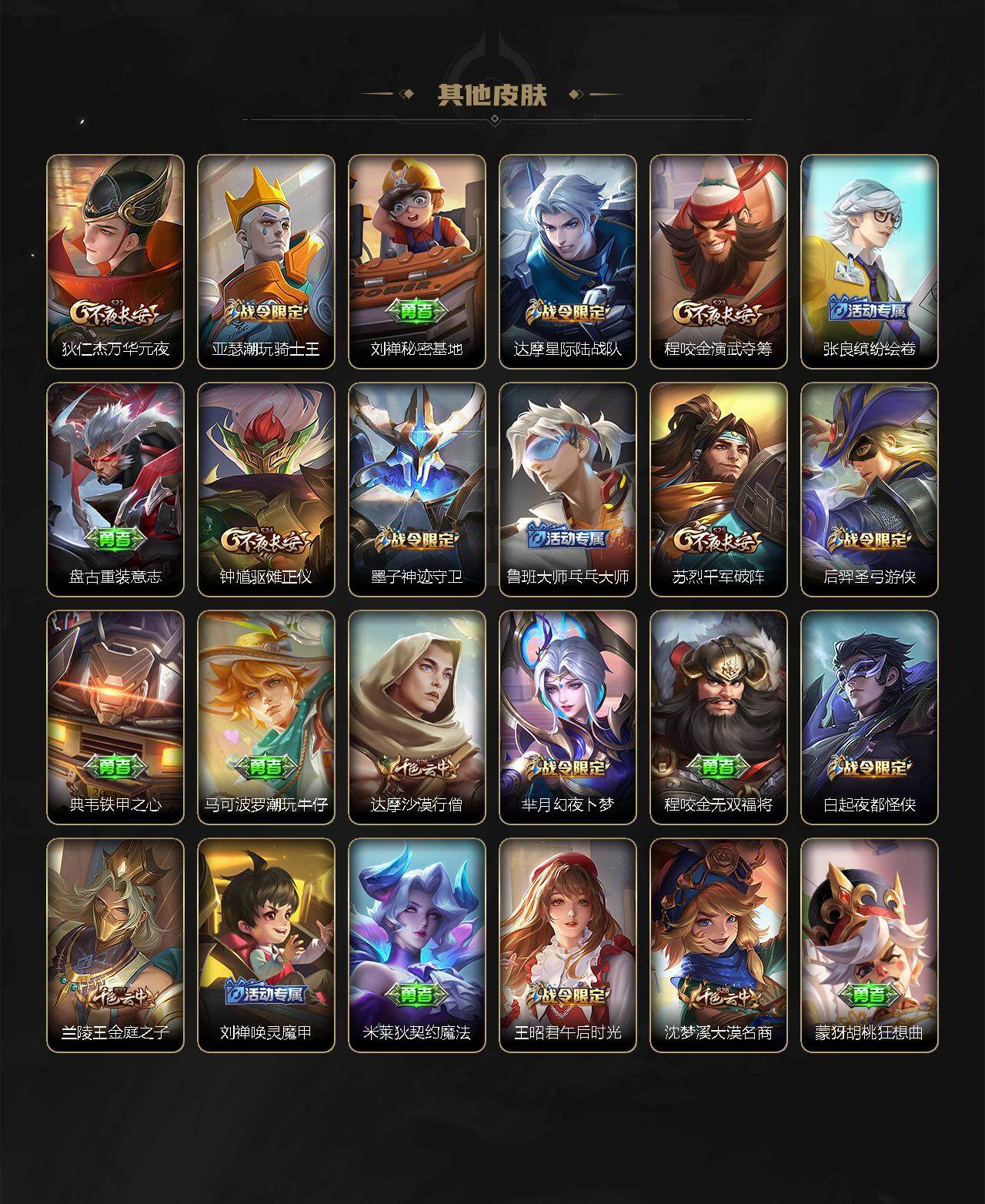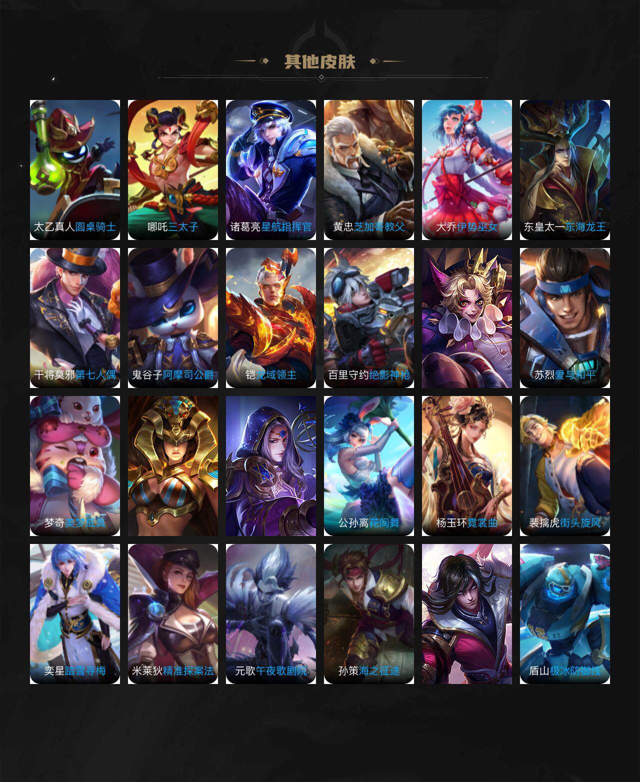 瑶遇见神鹿,娜可露露晚萤,伽罗箭羽风息,李元芳逐浪之夏,不知火舞魅语,大乔猫狗日记,孙策猫狗日记,阿轲节奏热浪,露娜紫霞仙子,诸葛亮黄金分割率,王昭君偶像歌手,韩信白龙吟,项羽苍穹之光,孙尚香时之恋人,阿轲暗夜猫娘,雅典娜冰冠公主,吕布末日机甲,鲁班七号电玩小子,蒙犽龙鼓争鸣,橘右京修罗,墨子龙骑士,嬴政摇滚巨星,刘禅绅士熊喵,刘禅天才门将,白起星夜王子,安琪拉心灵骇客,程咬金功夫厨神,刘邦德古拉伯爵,兰陵王暗隐猎兽者,曹操幽灵船长,宫本武藏鬼剑武藏,司马懿暗渊魔法,亚瑟心灵战警,钟馗乐园奇幻夜,杨戬天秀·启明,蔡文姬舞动绿茵,廉颇地狱岩魂,西施诗语江南,小乔缤纷独角兽,夏侯惇乘风破浪,花木兰水晶猎龙者,铠曙光守护者,百里玄策热力回旋,墨子金属风暴,百里玄策原初追逐者,吕布圣诞狂欢,貂蝉圣诞恋歌,百里守约特工魅影,嬴政暗夜贵公子,嫦娥拒霜思,雅典娜黎明之约,李白千年之狐,哪吒雪上飞焰,夏洛特永昼,澜赏金猎手,艾琳奇遇舞章,高渐离天秀·音浪,杨玉环银翎春语,沈梦溪匿光破解者,刘禅电玩·爆裂旋风,海月浮梦罗烟,赵怀真鹤归松栖,蒙犽百解令,高渐离燃音魔法,伽罗琥珀纪元,大乔乘龙·忆丹青,安琪拉乘龙·聚宝船,曹操夜都魔契,海诺心动手记,苍狼魂孤将