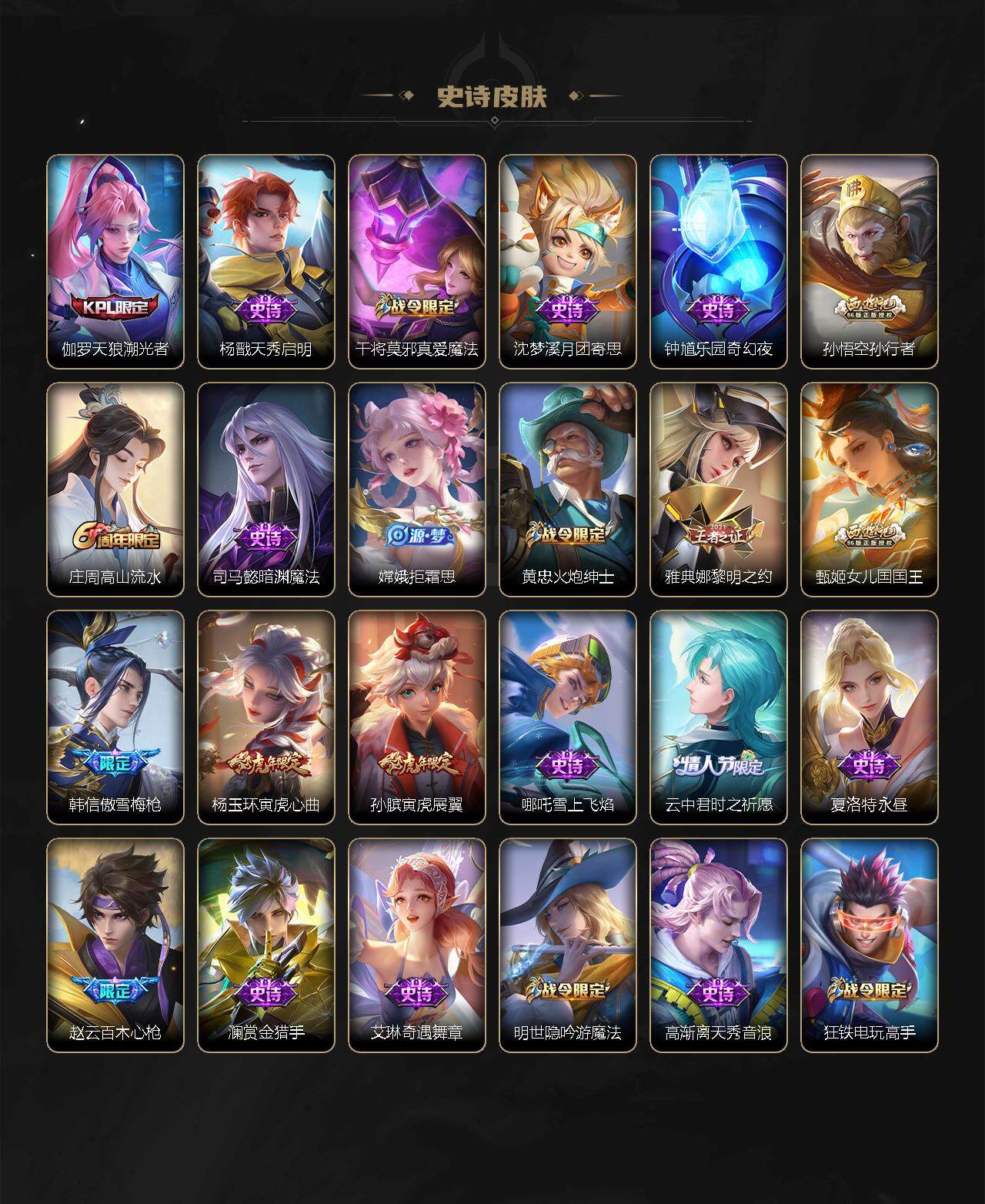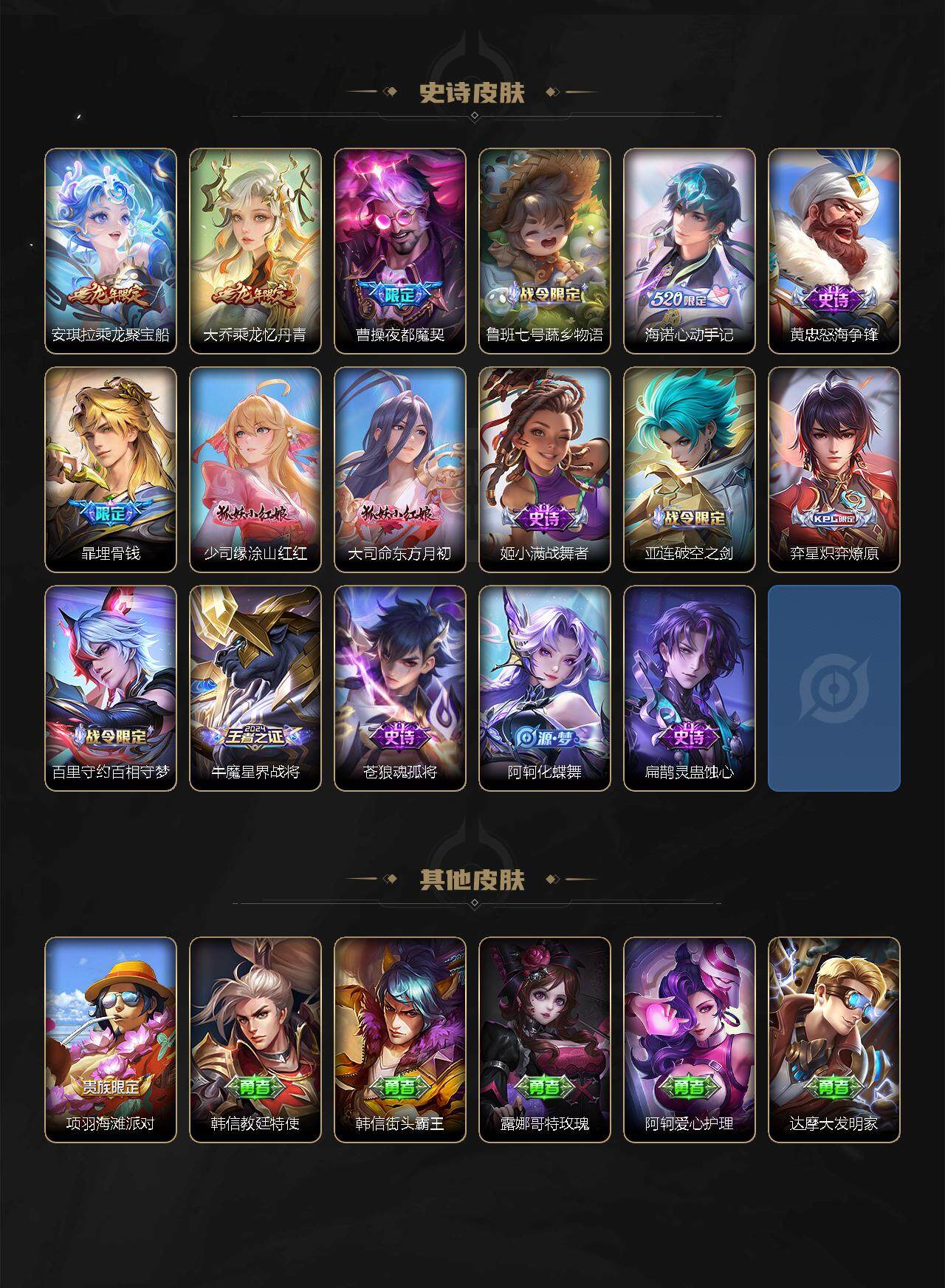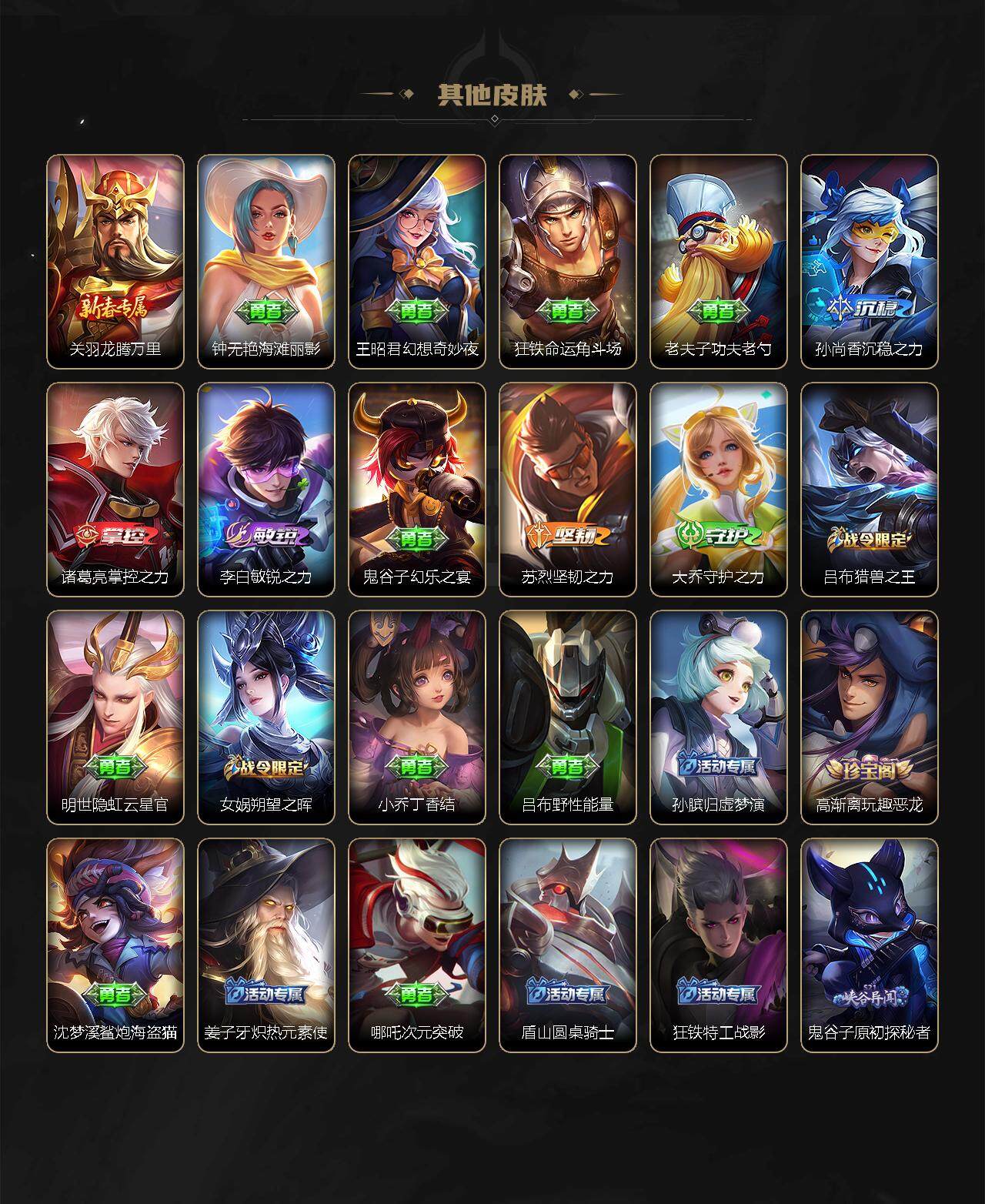 瑶遇见神鹿,娜可露露晚萤,伽罗箭羽风息,李元芳逐浪之夏,不知火舞魅语,大乔猫狗日记,孙策猫狗日记,阿轲节奏热浪,露娜紫霞仙子,诸葛亮黄金分割率,王昭君偶像歌手,韩信白龙吟,项羽苍穹之光,孙尚香时之恋人,阿轲暗夜猫娘,雅典娜冰冠公主,吕布末日机甲,鲁班七号电玩小子,蒙犽龙鼓争鸣,橘右京修罗,墨子龙骑士,嬴政摇滚巨星,刘禅绅士熊喵,刘禅天才门将,白起星夜王子,安琪拉心灵骇客,程咬金功夫厨神,刘邦德古拉伯爵,兰陵王暗隐猎兽者,曹操幽灵船长,宫本武藏鬼剑武藏,司马懿暗渊魔法,亚瑟心灵战警,钟馗乐园奇幻夜,杨戬天秀·启明,蔡文姬舞动绿茵,廉颇地狱岩魂,西施诗语江南,小乔缤纷独角兽,夏侯惇乘风破浪,花木兰水晶猎龙者,铠曙光守护者,百里玄策热力回旋,墨子金属风暴,百里玄策原初追逐者,吕布圣诞狂欢,貂蝉圣诞恋歌,百里守约特工魅影,嬴政暗夜贵公子,嫦娥拒霜思,雅典娜黎明之约,李白千年之狐,哪吒雪上飞焰,夏洛特永昼,澜赏金猎手,艾琳奇遇舞章,高渐离天秀·音浪,杨玉环银翎春语,沈梦溪匿光破解者,刘禅电玩·爆裂旋风,海月浮梦罗烟,赵怀真鹤归松栖,蒙犽百解令,高渐离燃音魔法,伽罗琥珀纪元,大乔乘龙·忆丹青,安琪拉乘龙·聚宝船,曹操夜都魔契,海诺心动手记,苍狼魂孤将