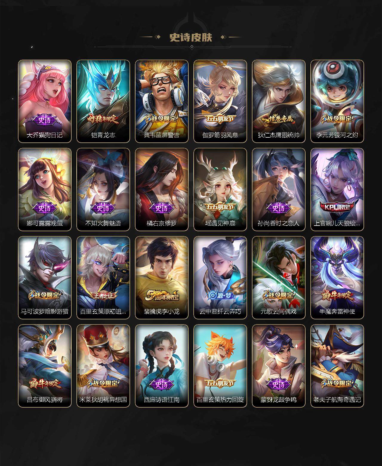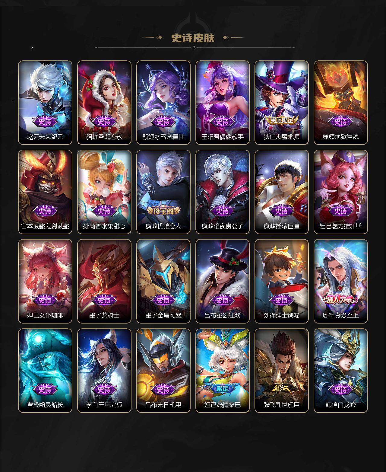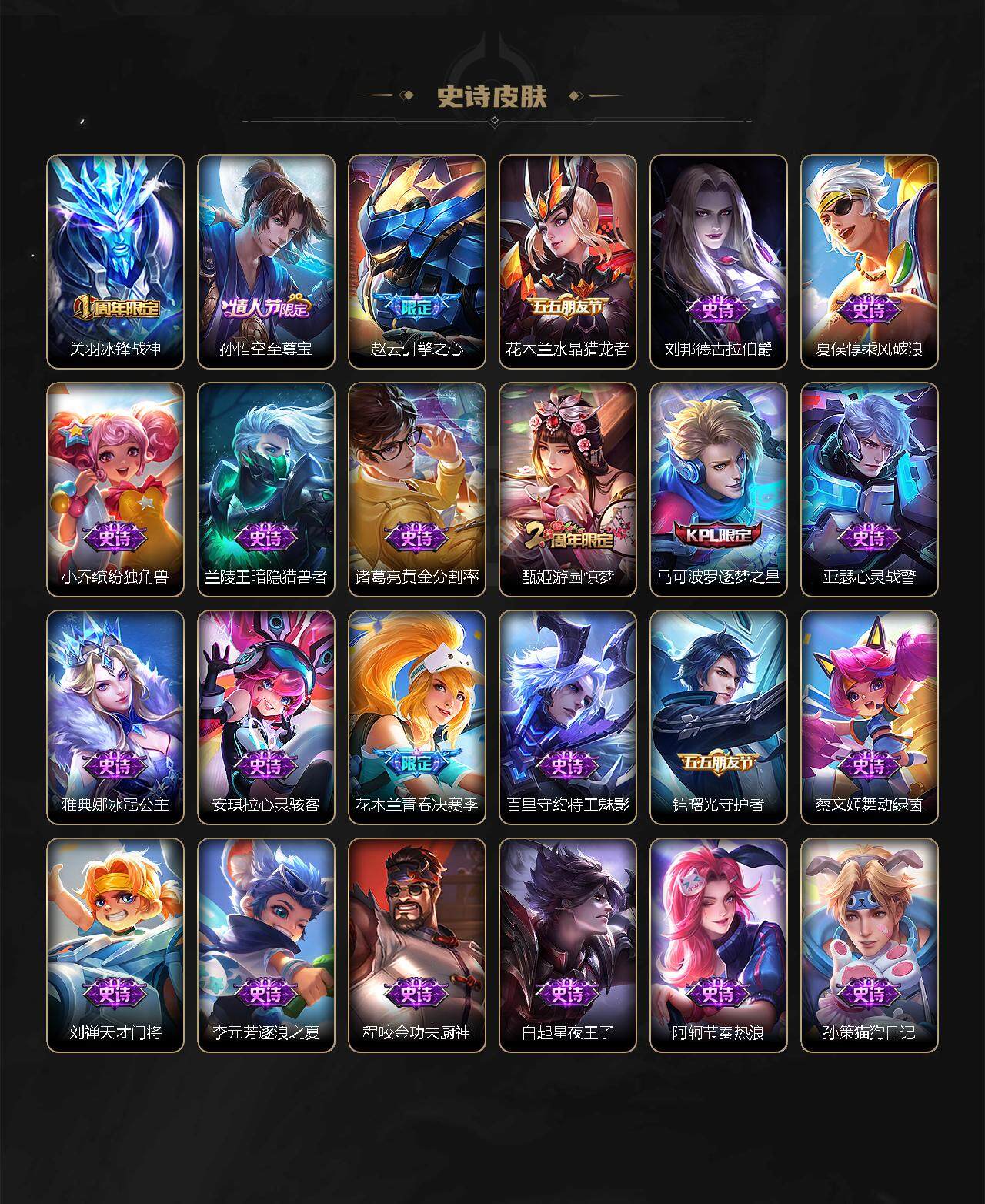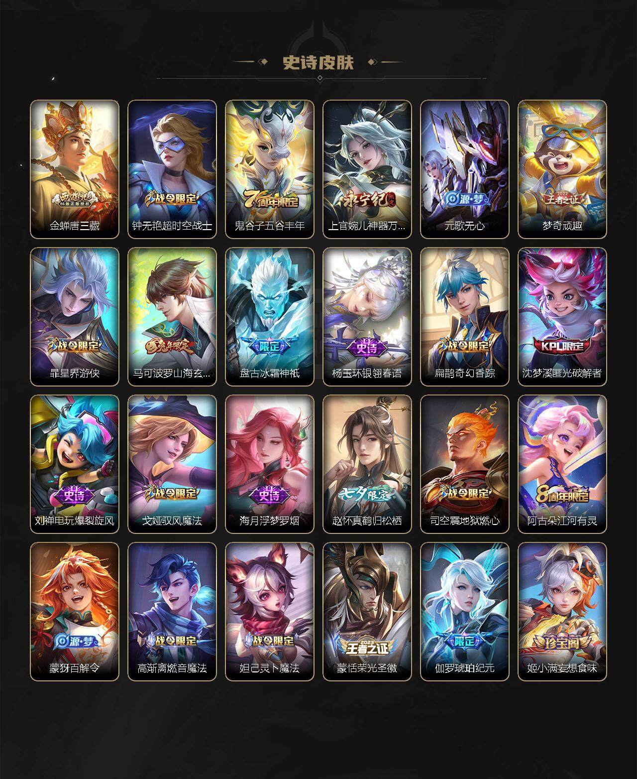 瑶遇见神鹿,娜可露露晚萤,伽罗箭羽风息,李元芳逐浪之夏,不知火舞魅语,大乔猫狗日记,孙策猫狗日记,阿轲节奏热浪,露娜紫霞仙子,诸葛亮黄金分割率,王昭君偶像歌手,韩信白龙吟,项羽苍穹之光,孙尚香时之恋人,阿轲暗夜猫娘,雅典娜冰冠公主,吕布末日机甲,鲁班七号电玩小子,蒙犽龙鼓争鸣,橘右京修罗,墨子龙骑士,嬴政摇滚巨星,刘禅绅士熊喵,刘禅天才门将,白起星夜王子,安琪拉心灵骇客,程咬金功夫厨神,刘邦德古拉伯爵,兰陵王暗隐猎兽者,曹操幽灵船长,宫本武藏鬼剑武藏,司马懿暗渊魔法,亚瑟心灵战警,钟馗乐园奇幻夜,杨戬天秀·启明,蔡文姬舞动绿茵,廉颇地狱岩魂,西施诗语江南,小乔缤纷独角兽,夏侯惇乘风破浪,花木兰水晶猎龙者,铠曙光守护者,百里玄策热力回旋,墨子金属风暴,百里玄策原初追逐者,吕布圣诞狂欢,貂蝉圣诞恋歌,百里守约特工魅影,嬴政暗夜贵公子,嫦娥拒霜思,雅典娜黎明之约,李白千年之狐,哪吒雪上飞焰,夏洛特永昼,澜赏金猎手,艾琳奇遇舞章,高渐离天秀·音浪,杨玉环银翎春语,沈梦溪匿光破解者,刘禅电玩·爆裂旋风,海月浮梦罗烟,赵怀真鹤归松栖,蒙犽百解令,高渐离燃音魔法,伽罗琥珀纪元,大乔乘龙·忆丹青,安琪拉乘龙·聚宝船,曹操夜都魔契,海诺心动手记,苍狼魂孤将