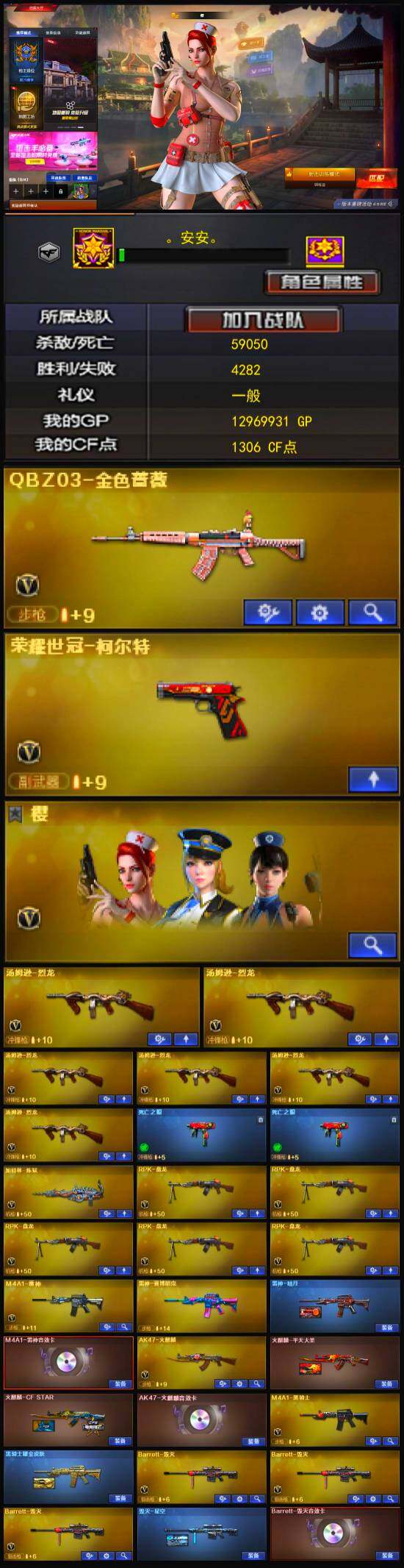 【热门武器】:QBZ03-金色蔷薇,死亡之眼*2,荣耀世冠-柯尔特,M4A1-黑骑士,汤姆逊-烈龙*6,RPK-盘龙*5,加特林-炼狱,沙鹰-修罗*4