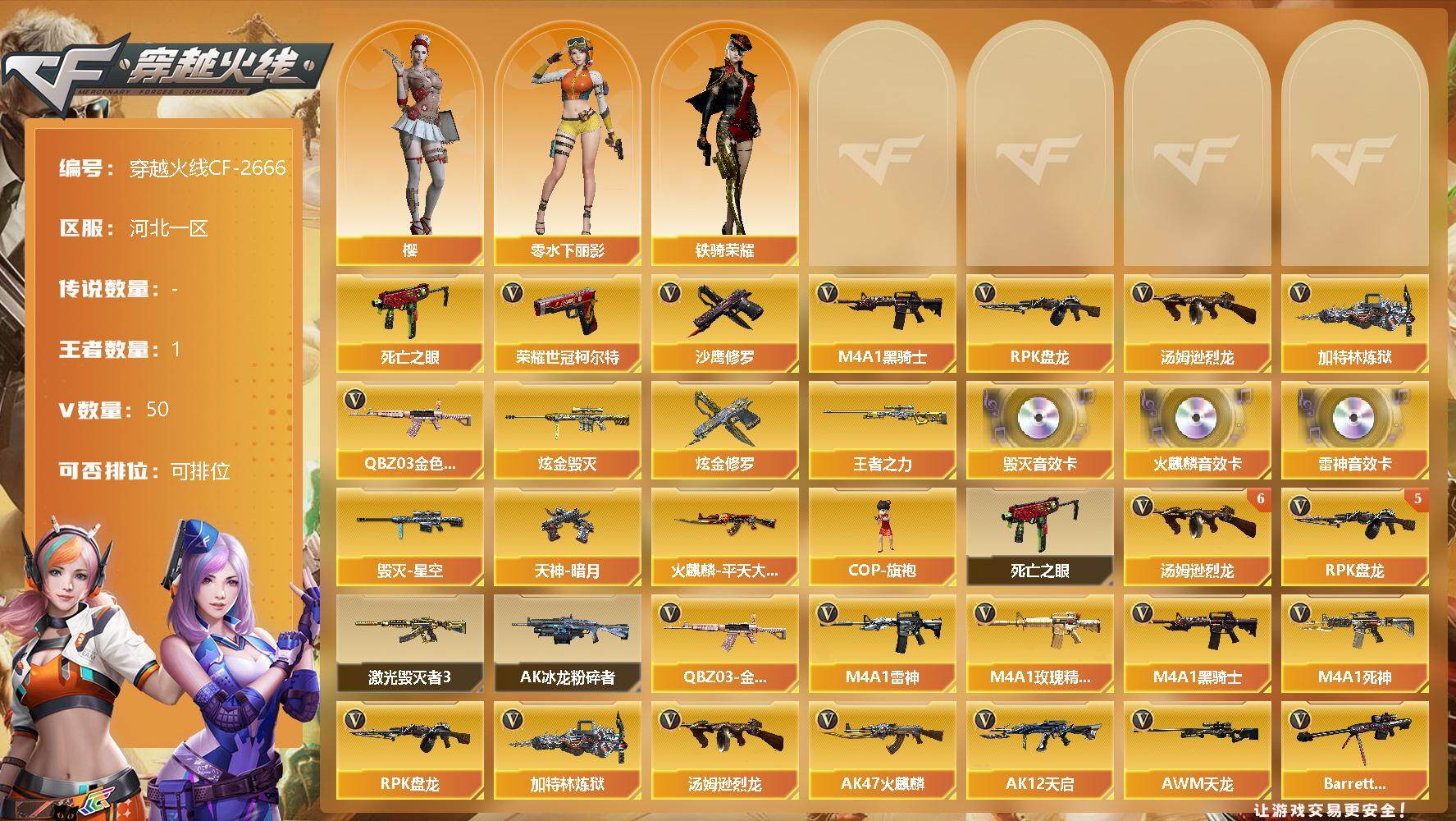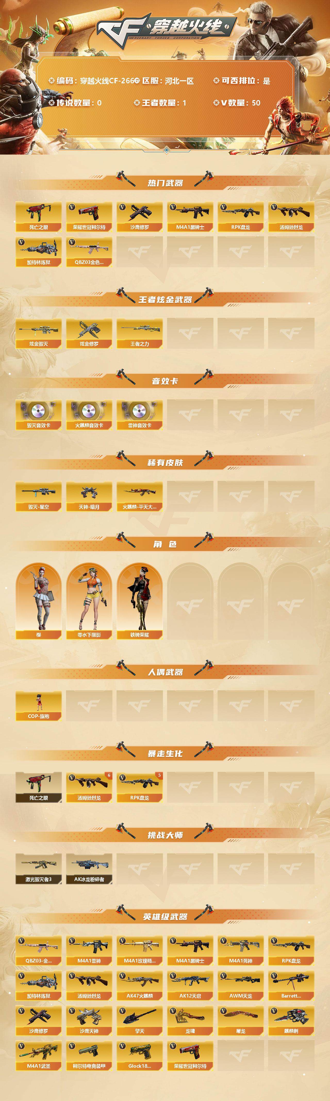 [12345257]【商品标题】:河北一区-50V-1王者-2炫金 【热门武器】:QBZ03-金色蔷薇,死亡之眼*2,荣耀世冠-柯尔特,M4A1-黑骑士,汤姆逊-烈龙*6,RPK-盘龙*5,加特林-炼狱,沙鹰-修罗*4 【王者炫金武器】:炫金毁灭,炫金修罗,王者之力 【音效卡】:AK47-火麒麟音效卡,M4A1-雷神音效卡,Barrett-毁灭音效卡 【稀有皮肤】:火麒麟-平天大圣,毁灭-星空,天神-暗月 【角色】:零-水下丽影,樱,铁骑荣耀 【人偶武器】:COP-旗袍 【暴走生化】:死亡之眼*2 【挑战大师】:激光毁灭者III,AK47-冰龙粉碎者 【英雄级武器】:柯尔特-电竞装甲,M4A1-武圣,Glock18-武圣,荣耀世冠-柯尔特,QBZ03-金色蔷薇,M4A1-雷神,M4A1-玫瑰精灵,M4A1-黑骑士,M4A1-死神,RPK-盘龙*5,加特林-炼狱,汤姆逊-烈龙*6,AK47-火麒麟,AK12-天启,AWM-天龙,Barrett-毁灭*3,沙鹰-天神,沙鹰-修罗*4,麒麟刺*3,擎天*2,龙啸,屠龙*2 【特殊枪械】:1黑骑士,6烈龙,5盘龙,1炼狱