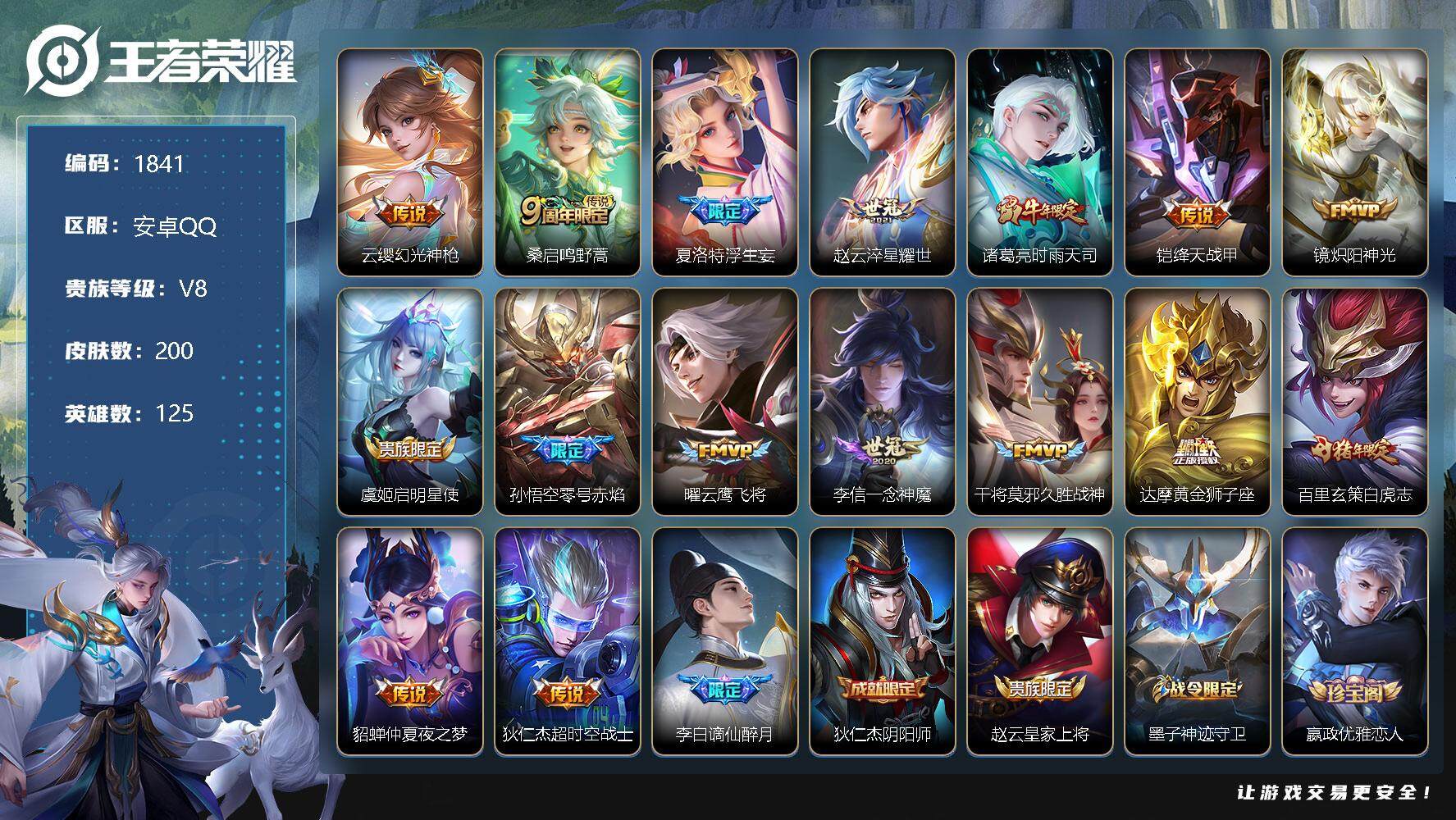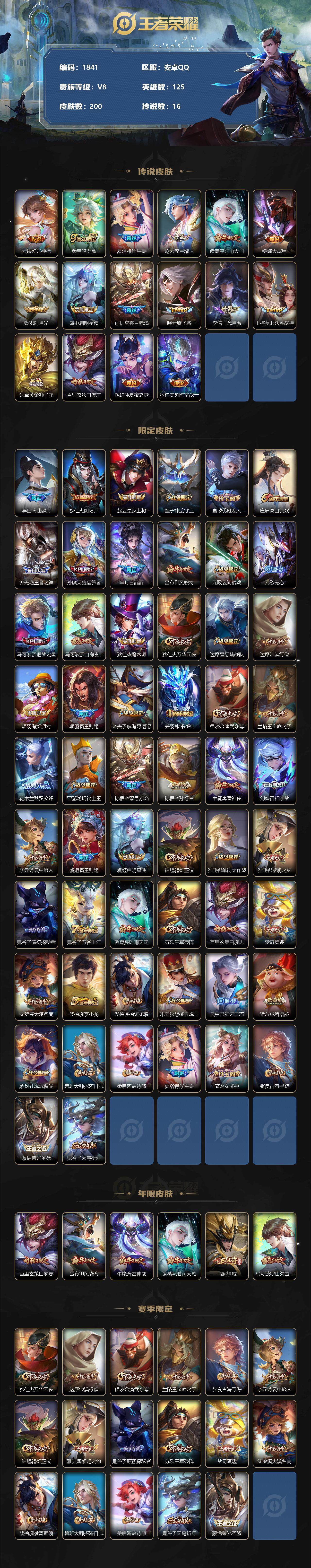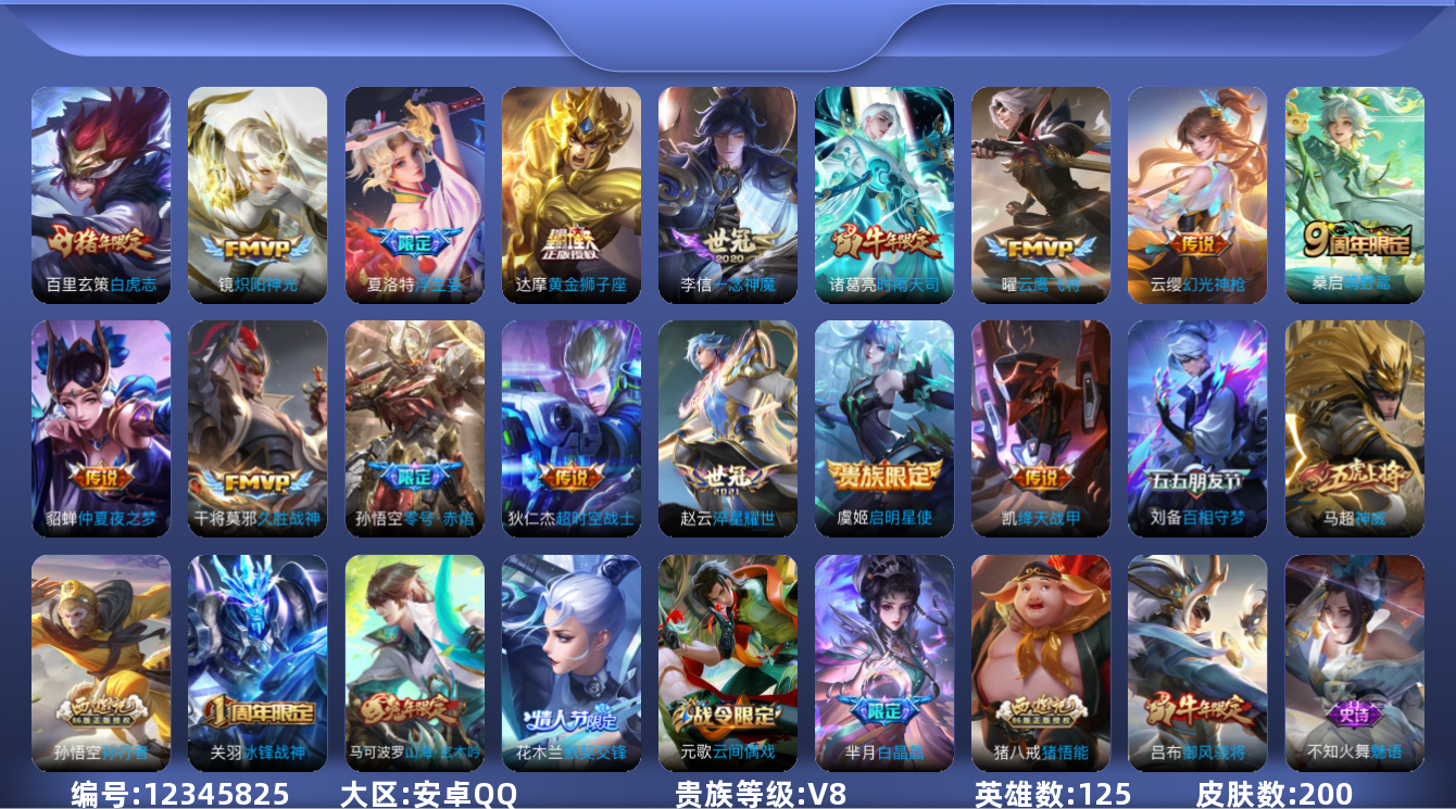 [12345825]【商品标题】:安卓Q-V8-至尊星耀III段位-125英雄-200皮肤-0典藏-0珍品无双-0无双-0珍品传说-16传说-54史诗
