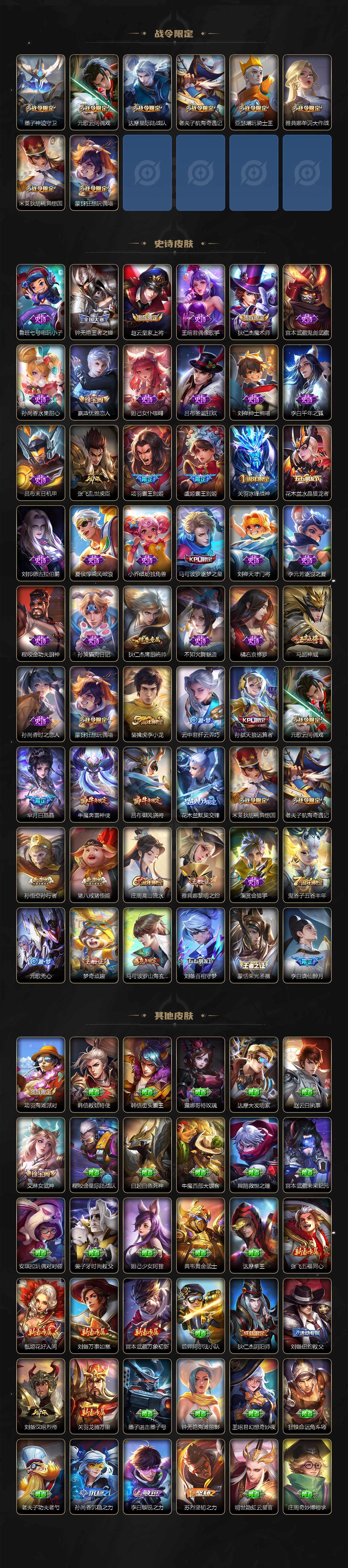 【限定皮肤】:李白谪仙醉月,狄仁杰阴阳师,赵云皇家上将,墨子神迹守卫,嬴政优雅恋人,庄周高山流水,钟无艳王者之锤,孙膑天狼运算者,芈月白晶晶,吕布御风骁将,元歌云间偶戏,元歌无心,马可波罗逐梦之星,马可波罗山海玄木吟,狄仁杰魔术师,狄仁杰万华元夜,达摩星际陆战队,达摩沙漠行僧,项羽海滩派对,项羽霸王别姬,老夫子航海奇遇记,关羽冰锋战神,程咬金演武夺筹,兰陵王金庭之子,花木兰默契交锋,亚瑟潮玩骑士王,孙悟空零号赤焰,孙悟空孙行者,牛魔奔雷神使,刘备百相守梦,李元芳云中旅人,虞姬霸王别姬,虞姬启明星使,钟馗驱傩正仪,雅典娜单词大作战,雅典娜黎明之约,鬼谷子原初探秘者,鬼谷子五谷丰年,诸葛亮时雨天司,苏烈千军破阵,百里玄策白虎志,梦奇顽趣,沈梦溪大漠名商,裴擒虎李小龙,裴擒虎擒涛扼浪,米莱狄胡桃异想国,云中君纤云弄巧,猪八戒猪悟能,蒙犽狂想玩偶喵,鲁班大师探海日志,桑启海盐诗旅,夏洛特浮生妄,艾琳女武神,张良古海寻踪,蒙恬荣光圣徽,鬼谷子天穹祈灯