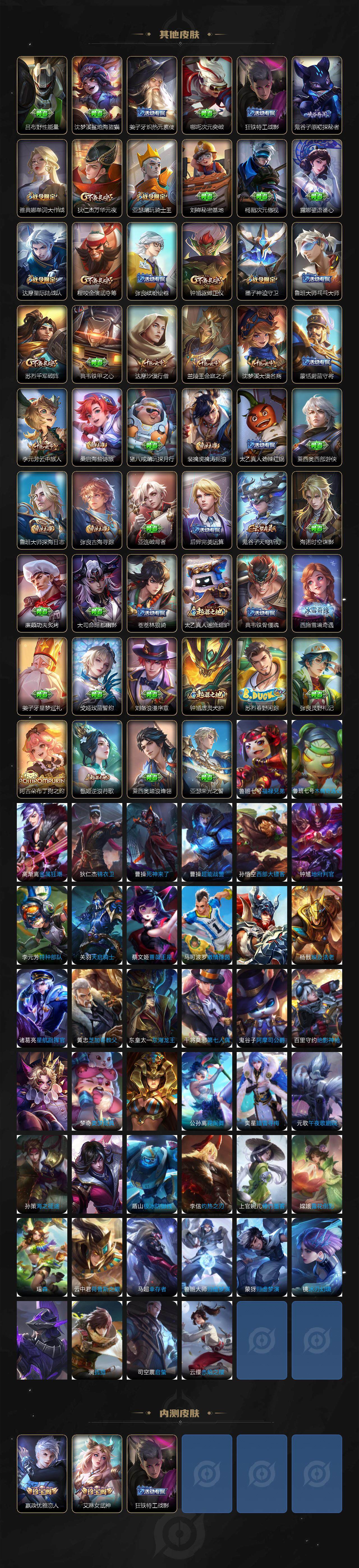 【赛季限定】:狄仁杰万华元夜,达摩沙漠行僧,程咬金演武夺筹,兰陵王金庭之子,张良古海寻踪,李元芳云中旅人,钟馗驱傩正仪,雅典娜黎明之约,鬼谷子原初探秘者,苏烈千军破阵,梦奇顽趣,沈梦溪大漠名商,裴擒虎擒涛扼浪,鲁班大师探海日志,桑启海盐诗旅,鬼谷子天穹祈灯,蒙恬荣光圣徽