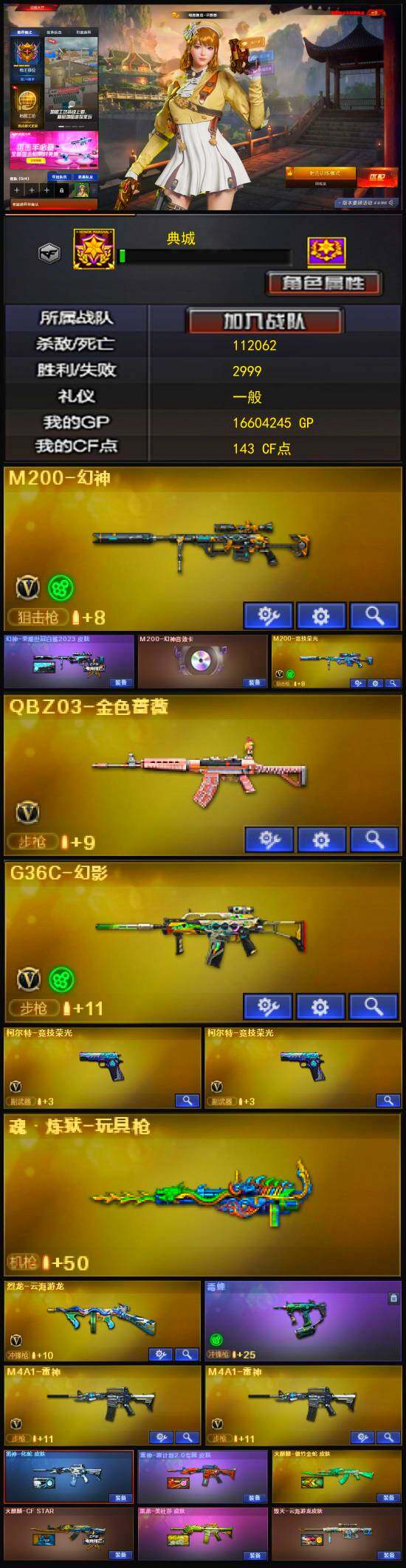 【热门武器】:G36C-幻影,QBZ03-金色蔷薇,M200-幻神,金色蔷薇-古蛇迷踪,修罗-古蛇迷踪,M200-竞技荣光,毒蜂,雷神-小红,裁决-雪莉杨,COP-白鲨