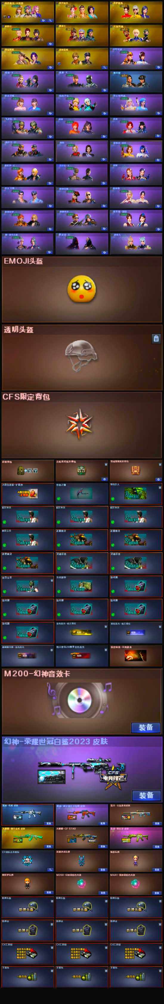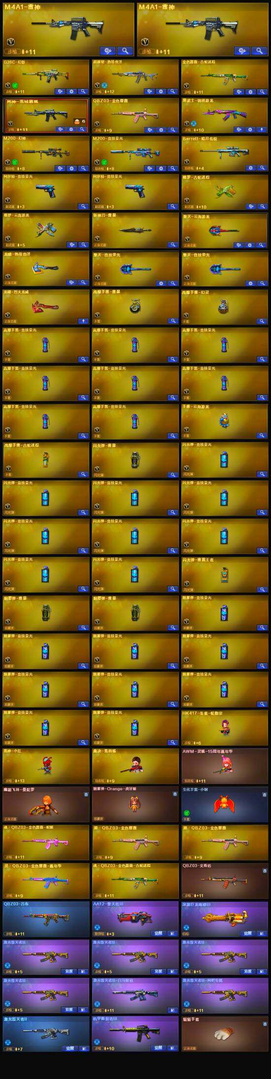 【英雄级武器】:M200-竞技荣光,柯尔特-竞技荣光*2,擎天-竞技荣光*2,高爆手雷-竞技荣光*8,烟雾弹-竞技荣光*9,闪光弹-竞技荣光*9,斩神刀-雷暴,G36C-幻影,QBZ03-金色蔷薇,金色蔷薇-古蛇迷踪,M4A1-雷神*2,M200-幻神,黑武士-锦绣游龙,超新星-热带奇洋,死神-雪域霜狐,AWM-昌龙,M4A1-赤狱骑士,修罗-古蛇迷踪,修罗-云海游龙,擎天-云海游龙,龙啸-热带奇洋