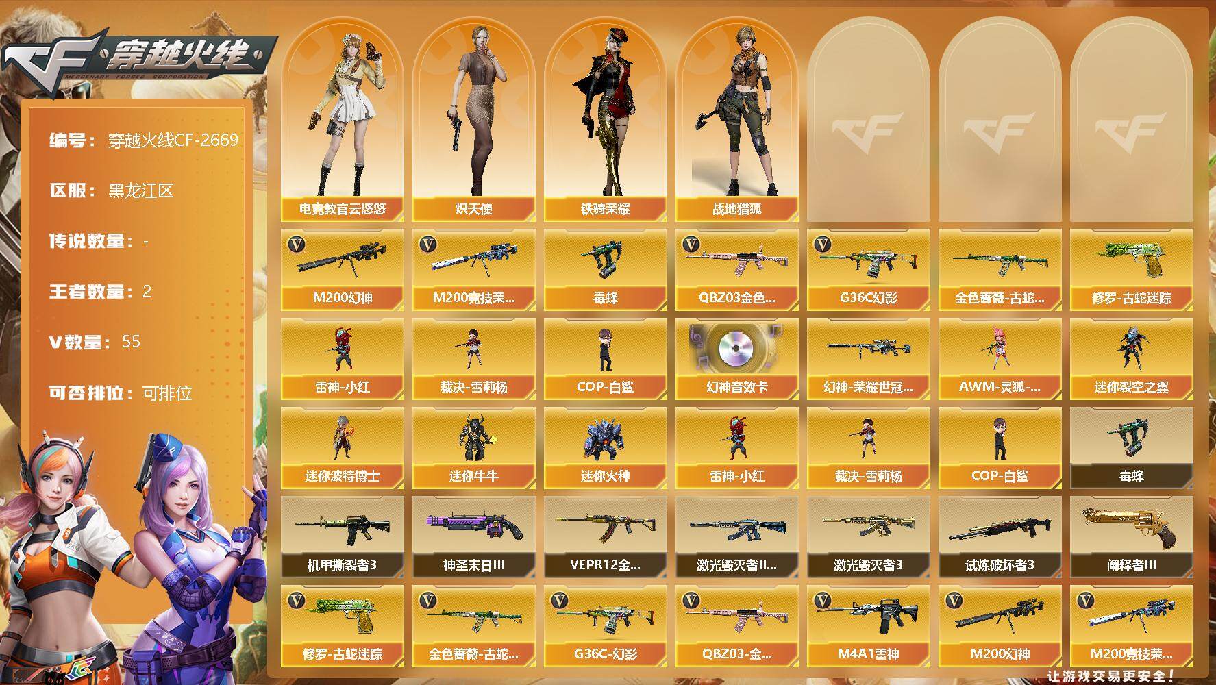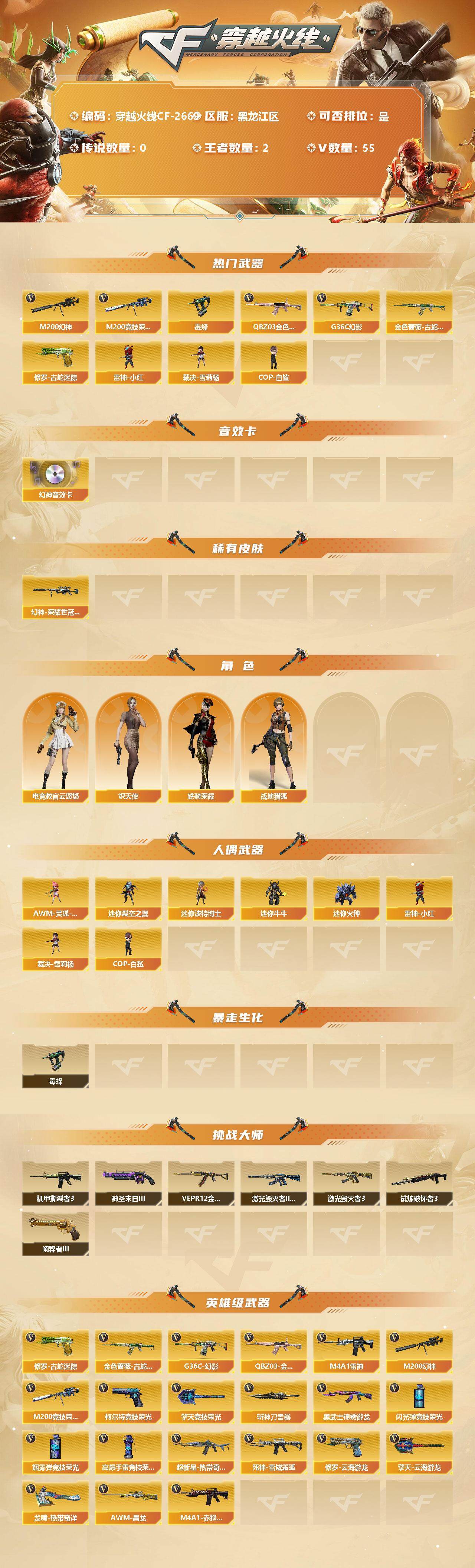 [12346050]【商品标题】:黑龙江区-55V-2王者-0炫金 【热门武器】:G36C-幻影,QBZ03-金色蔷薇,M200-幻神,金色蔷薇-古蛇迷踪,修罗-古蛇迷踪,M200-竞技荣光,毒蜂,雷神-小红,裁决-雪莉杨,COP-白鲨 【音效卡】:M200-幻神音效卡 【稀有皮肤】:幻神-荣耀世冠白鲨2023 皮肤 【角色】:电竞教官-云悠悠,战地猎狐,炽天使,铁骑荣耀 【人偶武器】:雷神-小红,COP-白鲨,裁决-雪莉杨,AWM-灵狐-15周年嘉年华,迷你裂空之翼,迷你波特博士,迷你牛牛,迷你火种 【暴走生化】:毒蜂 【挑战大师】:机甲撕裂者III,神圣爆裂者-末日III,阐释者III,试炼破坏者III,激光毁灭者III*4,VEPR-12-金魔,激光毁灭者III-白马银枪 【英雄级武器】:M200-竞技荣光,柯尔特-竞技荣光*2,擎天-竞技荣光*2,高爆手雷-竞技荣光*8,烟雾弹-竞技荣光*9,闪光弹-竞技荣光*9,斩神刀-雷暴,G36C-幻影,QBZ03-金色蔷薇,金色蔷薇-古蛇迷踪,M4A1-雷神*2,M200-幻神,黑武士-锦绣游龙,超新星-热带奇洋,死神-雪域霜狐,AWM-昌龙,M4A1-赤狱骑士,修罗-古蛇迷踪,修罗-云海游龙,擎天-云海游龙,龙啸-热带奇洋 【特殊枪械】: