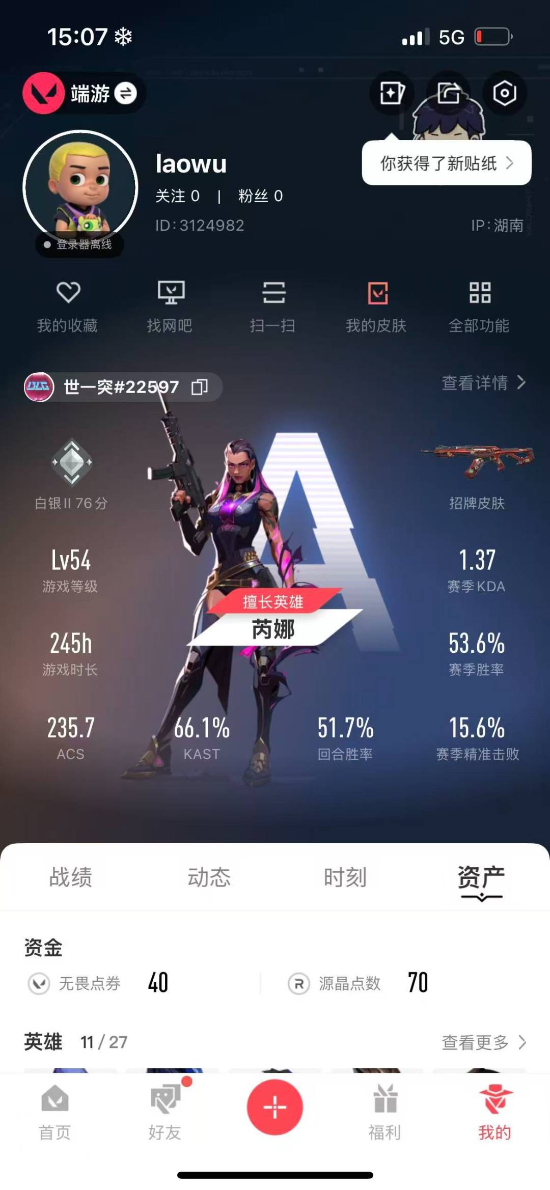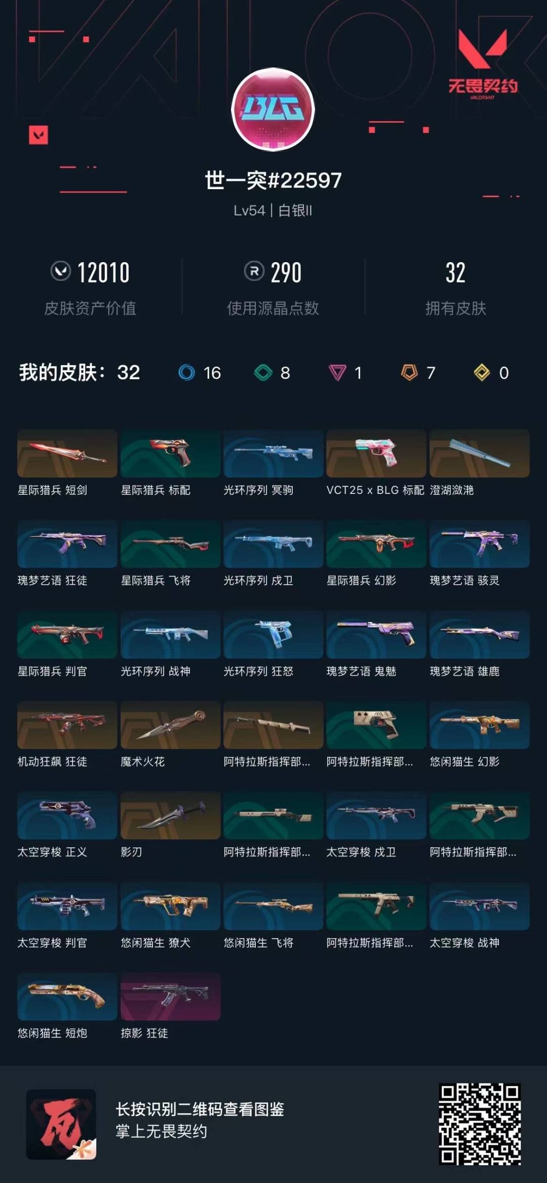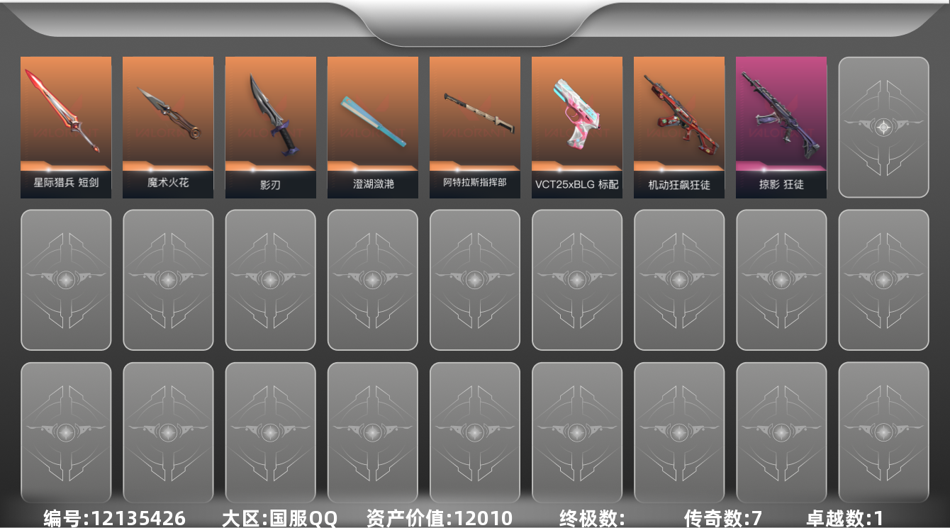 [12135426]7橙皮 1紫皮 32皮肤 11英雄 37卡面 290已用源晶 白银 优质装备:狂徒-掠影,狂徒-机动狂飙,澄湖潋滟,影刃,阿特拉斯指挥部,魔术火花,星际猎兵 短剑 佩枪皮肤:标配-VCT25xBLG