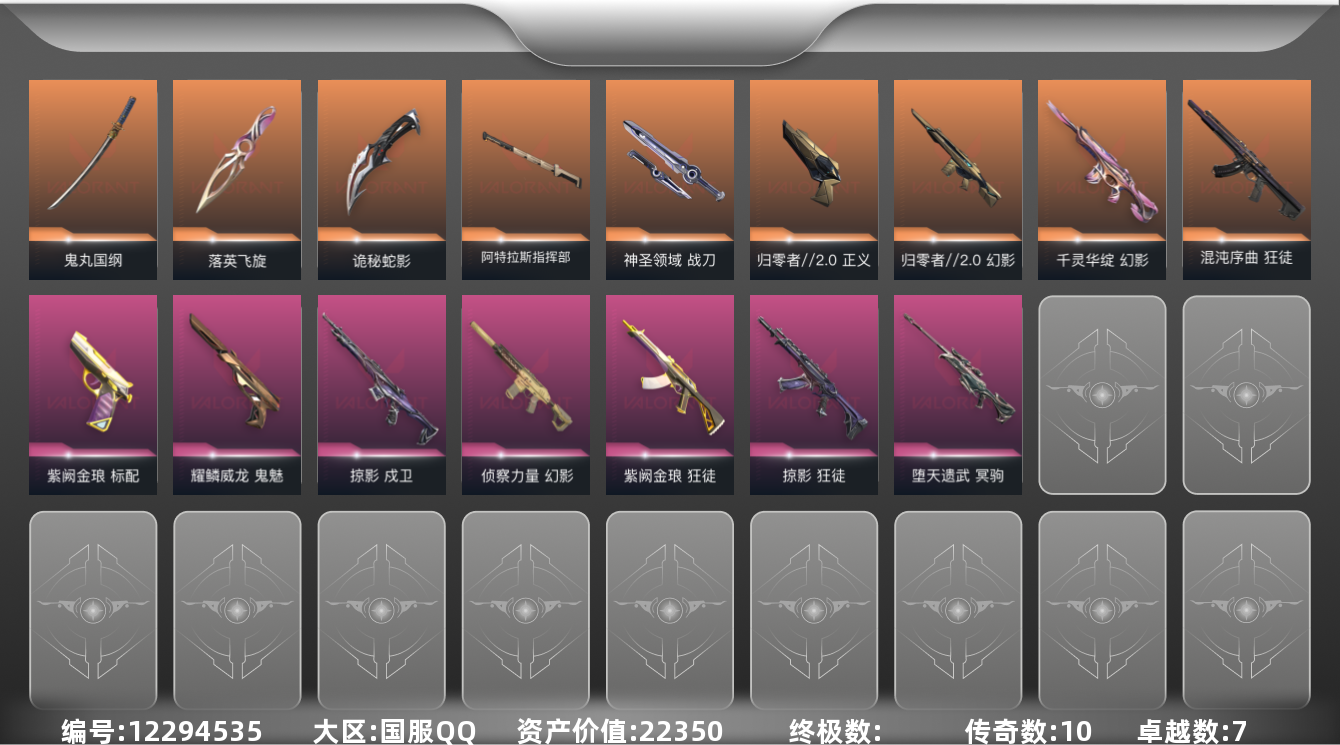 [12294535]10橙皮 7紫皮 65皮肤 27英雄 98卡面 875已用源晶 白银 优质装备:幻影-千灵华绽,狂徒-混沌序曲,狂徒-掠影,狂徒-紫阙金琅,幻影-侦察力量,冥驹-堕天遗武,戍卫-掠影,标配-紫阙金琅,落英飞旋,鬼丸国纲,神圣领域 战刀,诡秘蛇影,阿特拉斯指挥部,鬼魅-耀鳞威龙 佩枪皮肤:正义-归零者//2.0 步枪皮肤:幻影-归零者//2.0