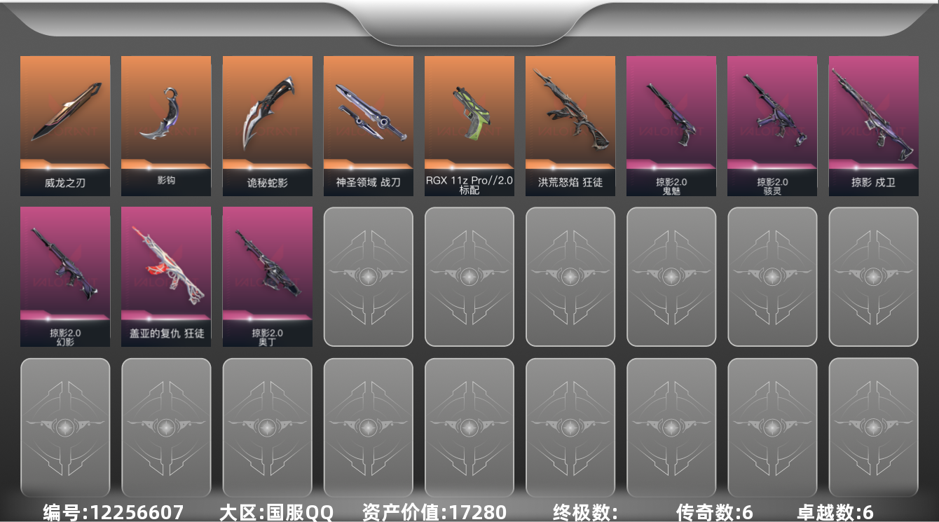 [12256607]6橙皮 6紫皮 41皮肤 23英雄 90卡面 705已用源晶 黑铁 优质装备:狂徒-盖亚的复仇,狂徒-洪荒怒焰,戍卫-掠影,威龙之刃,神圣领域 战刀,诡秘蛇影,影钩 套装:掠影2.0套装 佩枪皮肤:鬼魅-掠影2.0,标配-RGX 11z Pro//2.0 冲锋枪皮肤:骇灵-掠影2.0 步枪皮肤:幻影-掠影2.0 机枪皮肤:奥丁-掠影2.0