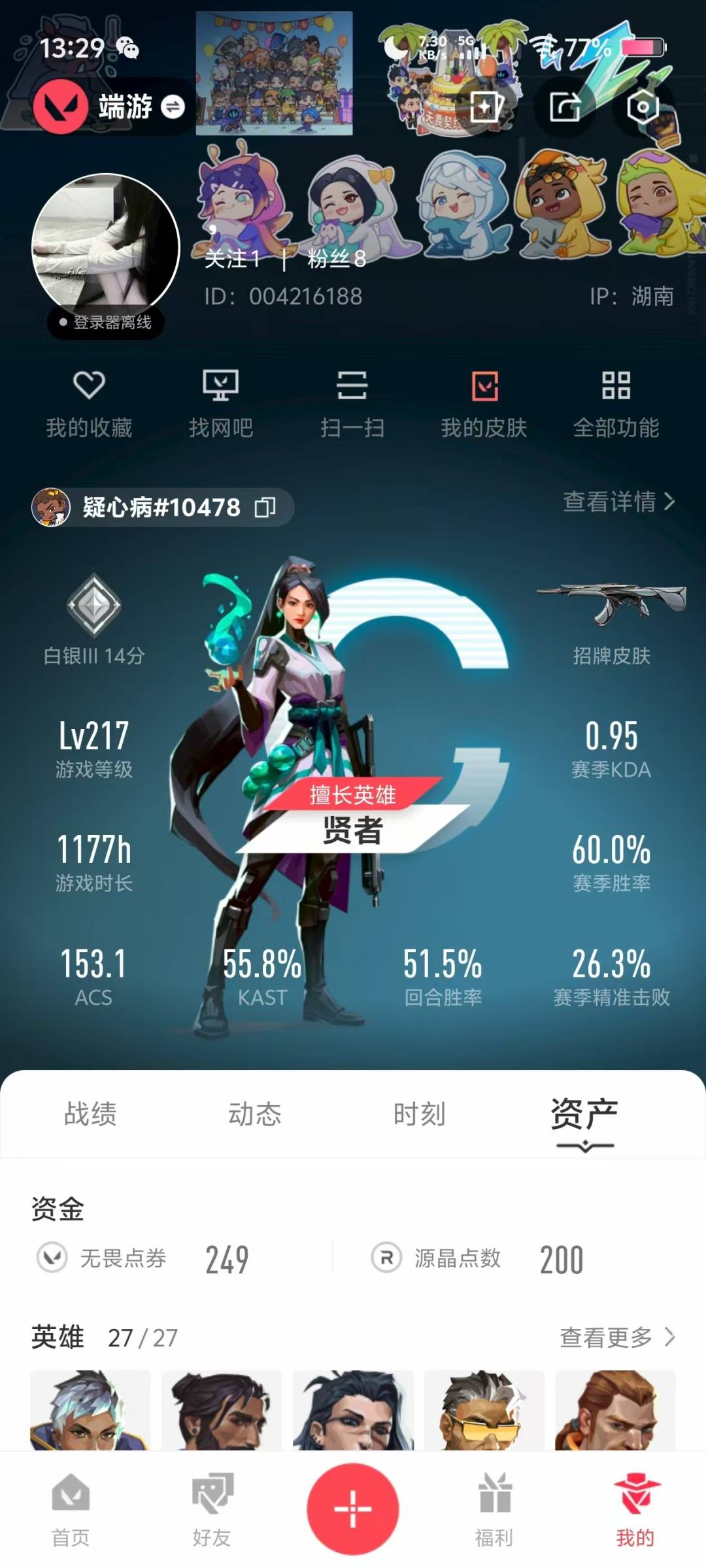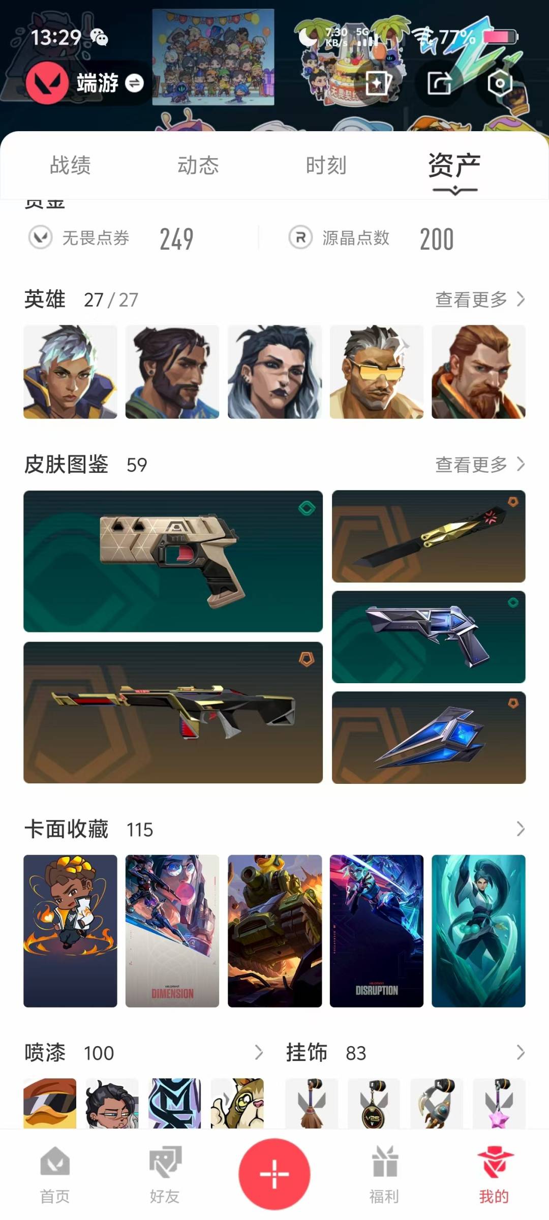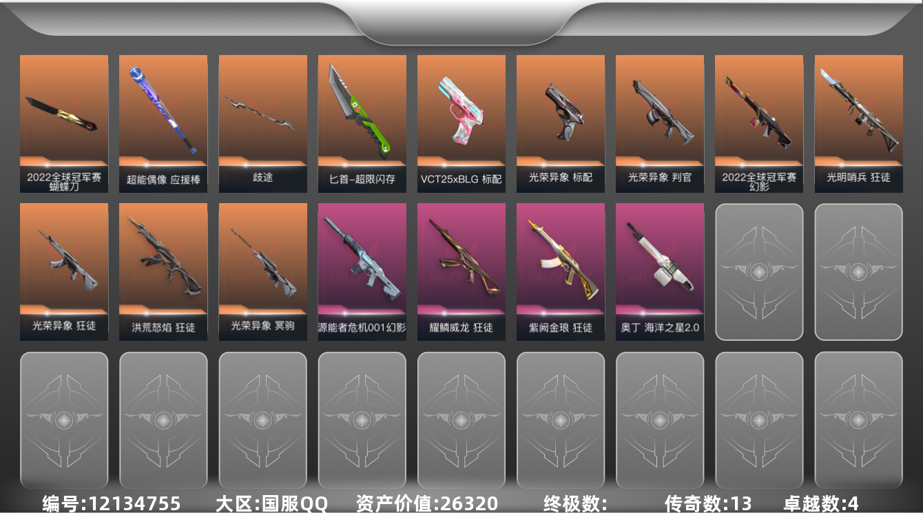 [12134755]13橙皮 4紫皮 59皮肤 27英雄 115卡面 810已用源晶 白银 优质装备:狂徒-光明哨兵,狂徒-紫阙金琅,狂徒-洪荒怒焰,狂徒-耀鳞威龙,幻影-源能者危机001,匕首-超限闪存,光荣异象 亮点皮肤:幻影-2022全球冠军赛,2022全球冠军赛 蝴蝶刀 套装:2022全球冠军赛,光荣异象 佩枪皮肤:标配-VCT25xBLG,标配-光荣异象 霰弹枪皮肤:判官-光荣异象 步枪皮肤:狂徒-光荣异象 狙击枪皮肤:冥驹-光荣异象 机枪皮肤:奥丁-海洋之星2.0 近战武器皮肤:超能偶像 应援棒